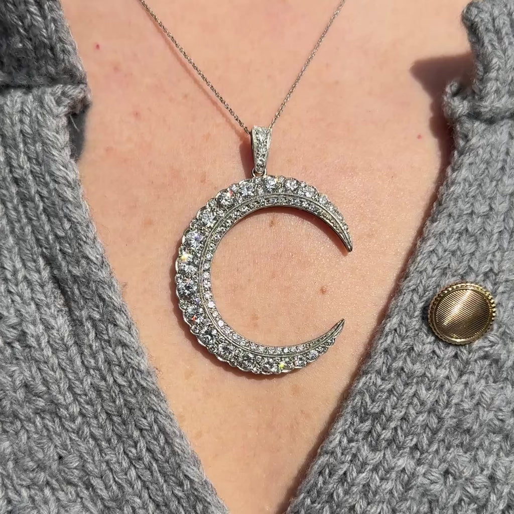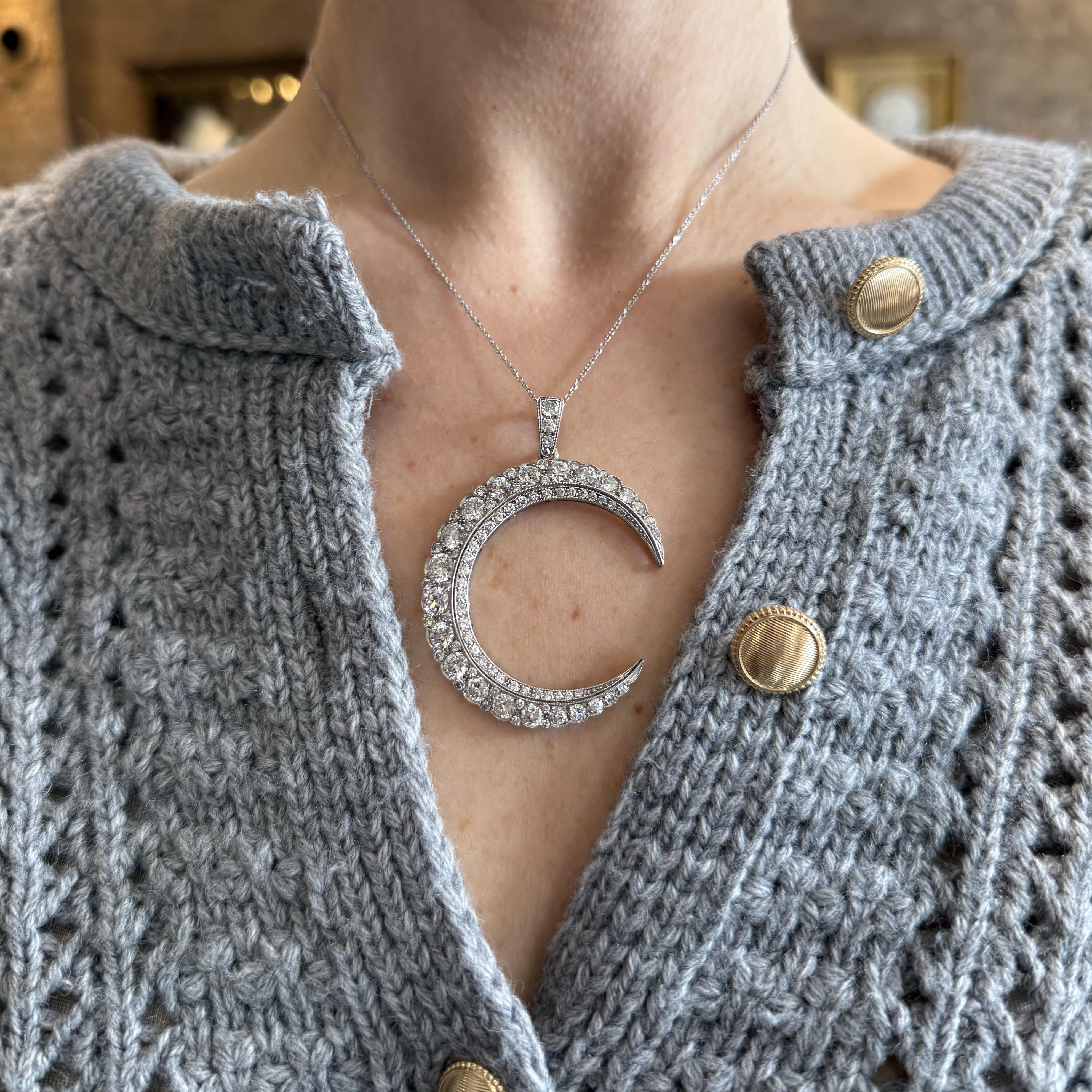 Estate platinum and diamond pendant. A dramatic crescent pendant crafted in platinum and set with dazzling diamonds creates an unforgettable play of light. Old European cut, transitional cut, and round brilliant cut diamonds are layered together, their differing facets giving the surface movement and character. Measuring approximately 1.75 inches at its widest point and 2.25 inches in length including the bale, the scale feels bold yet elegant.