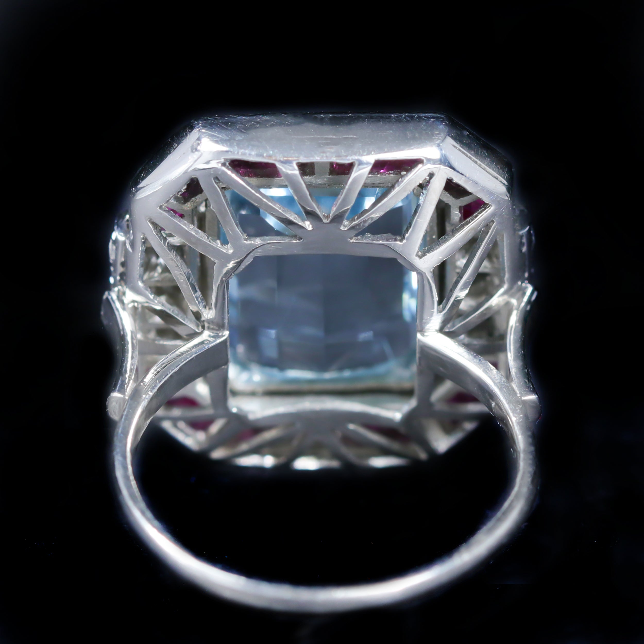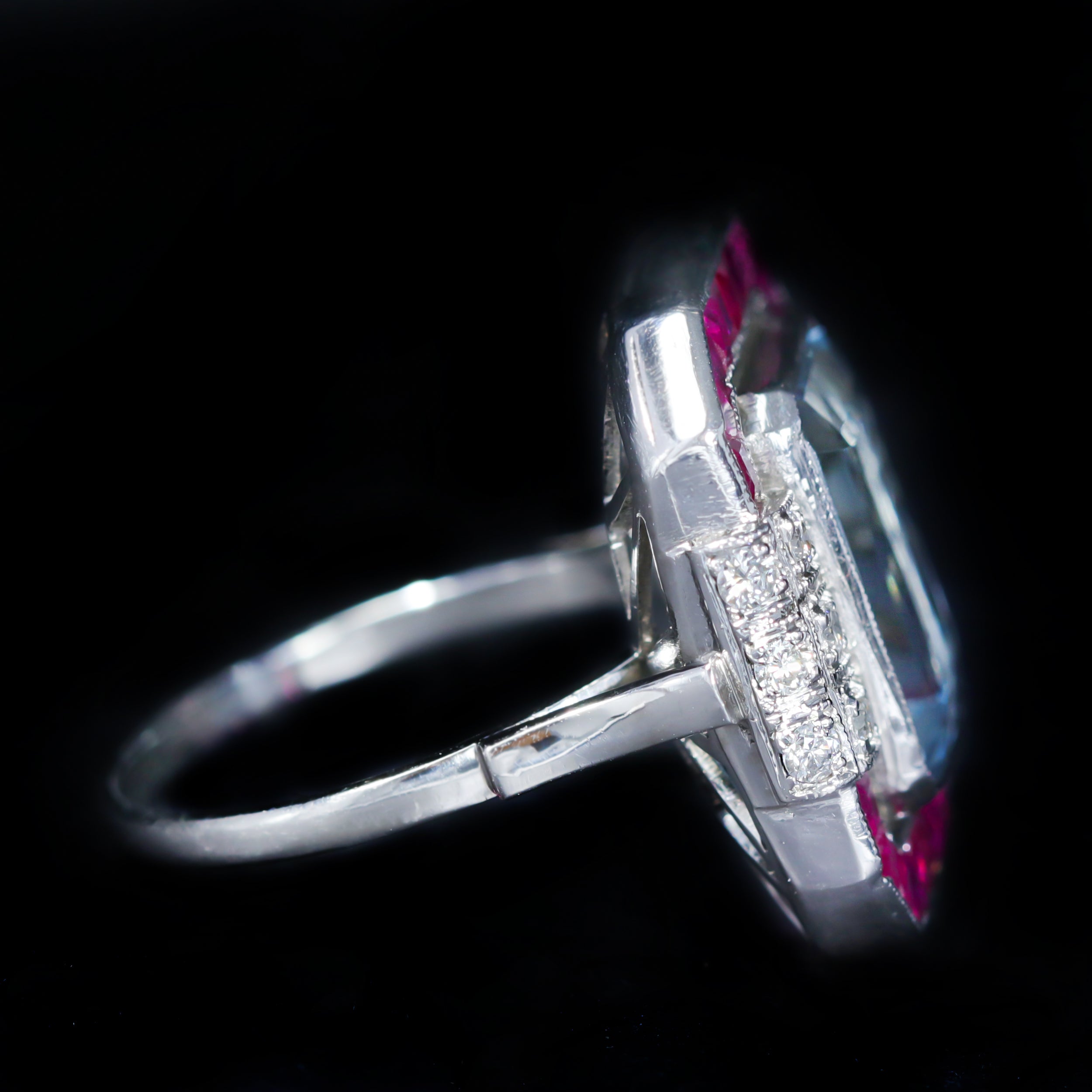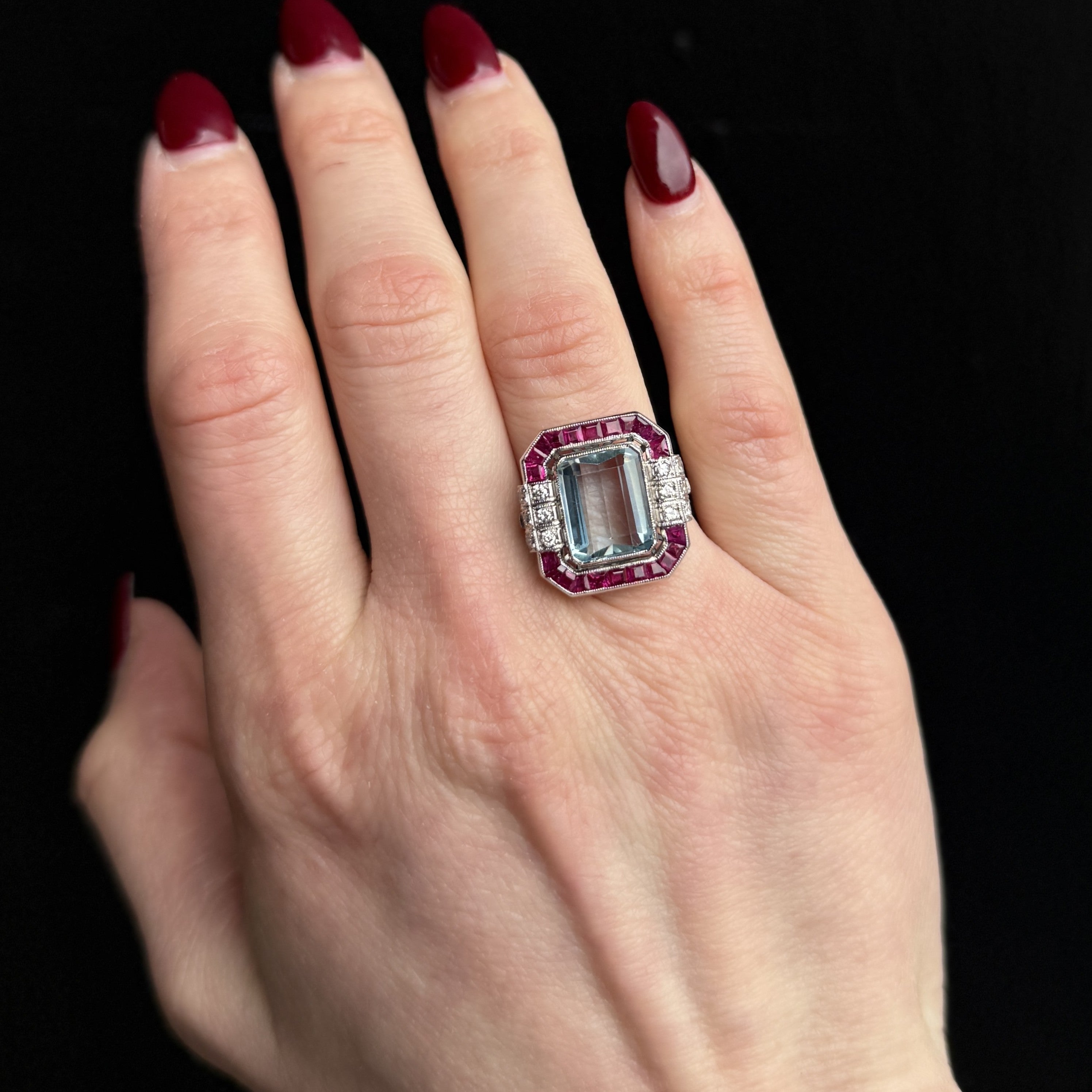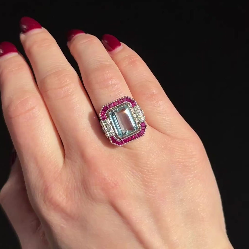 Retro platinum, aquamarine, ruby, and diamond ring. A bold emerald-cut aquamarine sits bezel-set at the center of this Retro platinum ring, glowing with cool, watery blue tones. Diamond-set geometric motifs flank the gemstone, adding crisp structure and sparkle, while calibre-cut rubies trace an octagonal border above and below, echoing the aquamarine’s shape with flashes of rich red. Strong, graphic, and unmistakably glamorous, this cocktail ring captures the confident style of the 1940s.