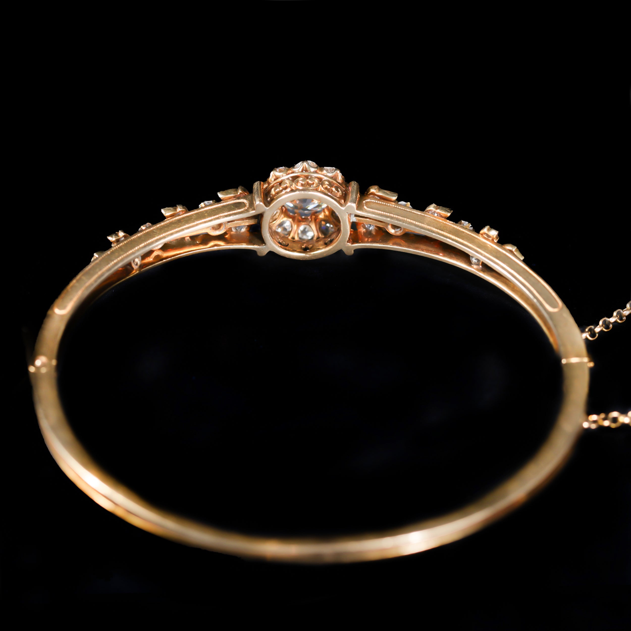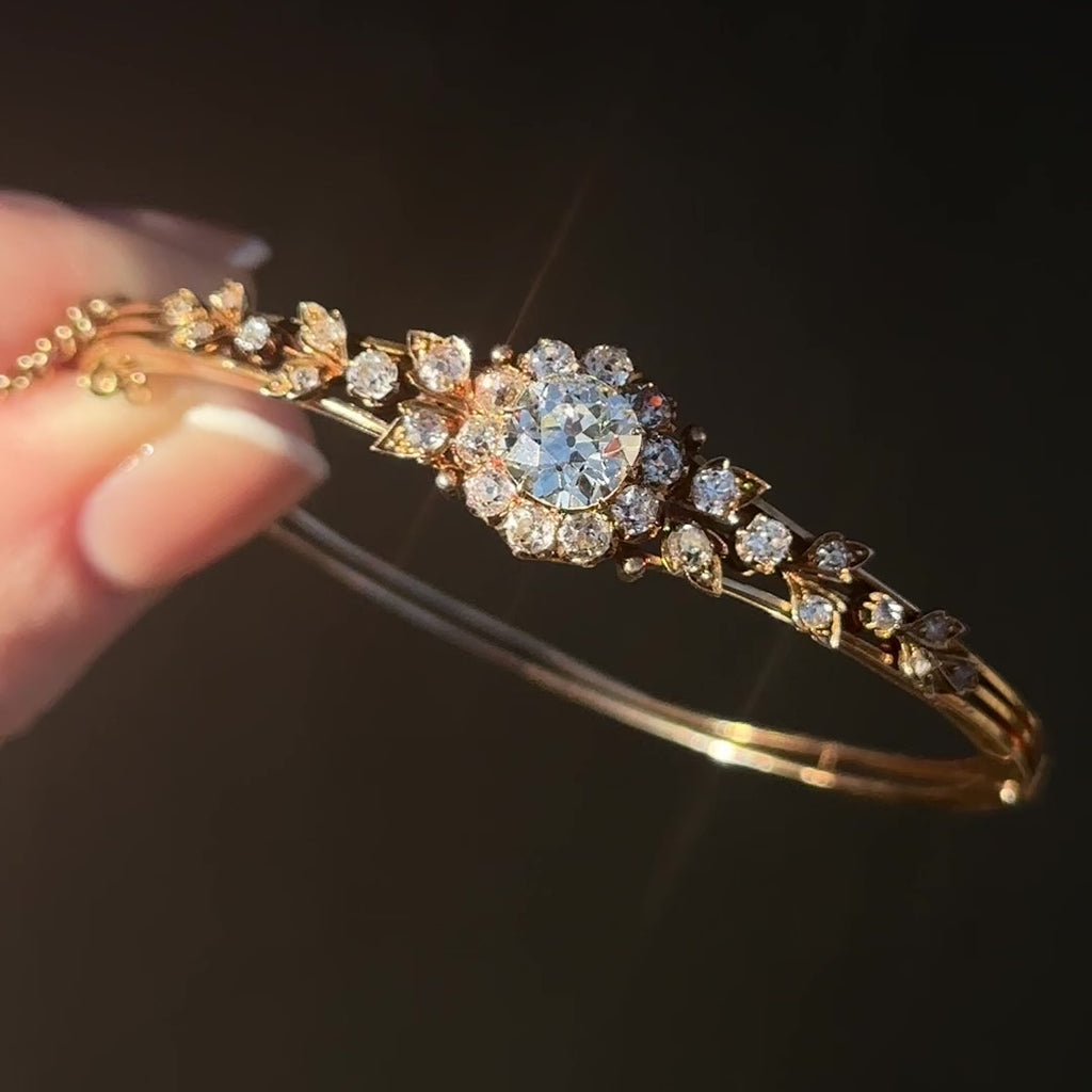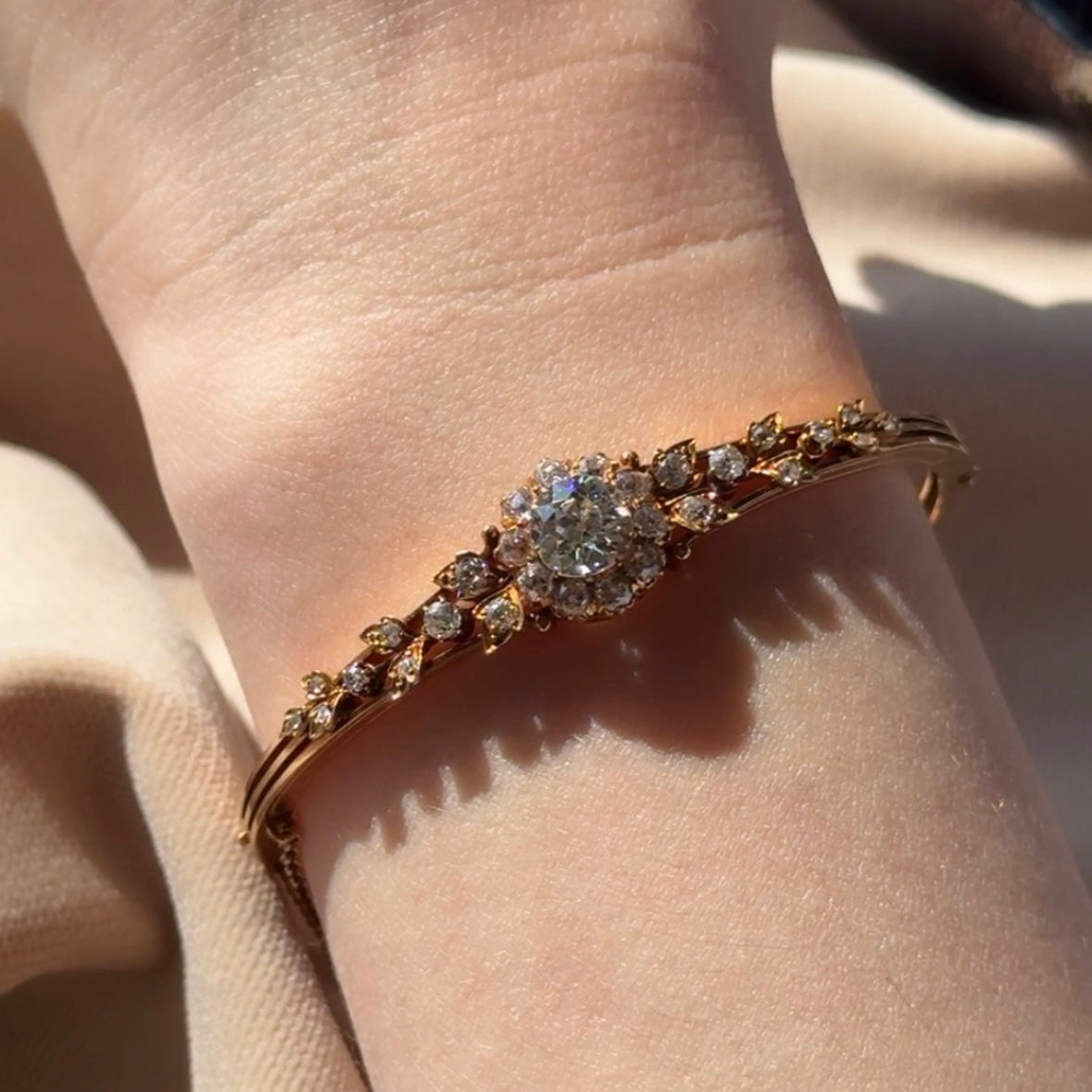 Victorian 18K yellow gold and diamond bracelet. A true collector’s piece, this Victorian diamond bracelet is crafted in rich 18K yellow gold and set with approximately 4.00 carats total weight of antique diamonds. At the center, a dazzling Old Mine cut diamond is framed by a glowing cluster of additional Old Mine cuts, creating a luminous focal point. From there, Old Mine and rose cut diamonds radiate outward within delicate floral motifs, with openwork between each element allowing light to move through the design. Designed as a bangle that comfortably fits a 7-inch wrist, the bracelet is both substantial and exquisitely detailed, capturing the romance and craftsmanship of the Victorian era.