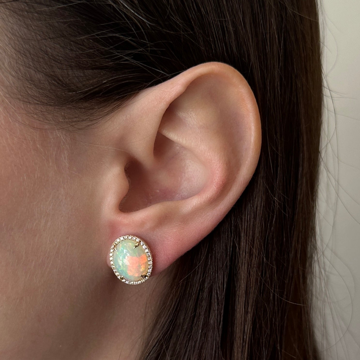 14K yellow gold, opal, and diamond earrings. A pair of oval Ethiopian opal cabochons bring extraordinary color and presence to these 14K yellow gold stud earrings. Each opal is framed by a halo of round brilliant cut diamonds, creating a luminous contrast that enhances the gems' vibrant play-of-color. Their generous size allows the shifting flashes of blues, greens, oranges, and pinks to be fully appreciated, making these studs a striking and elegant statement.