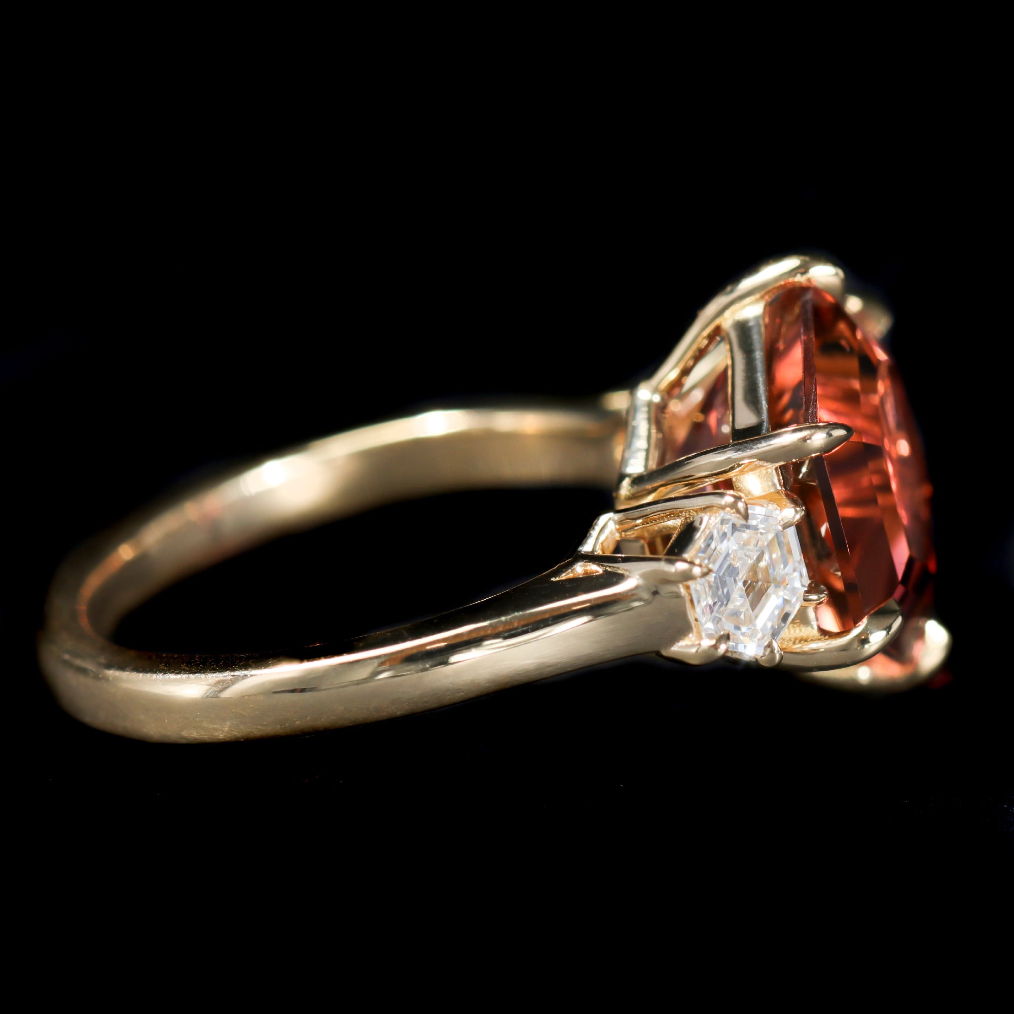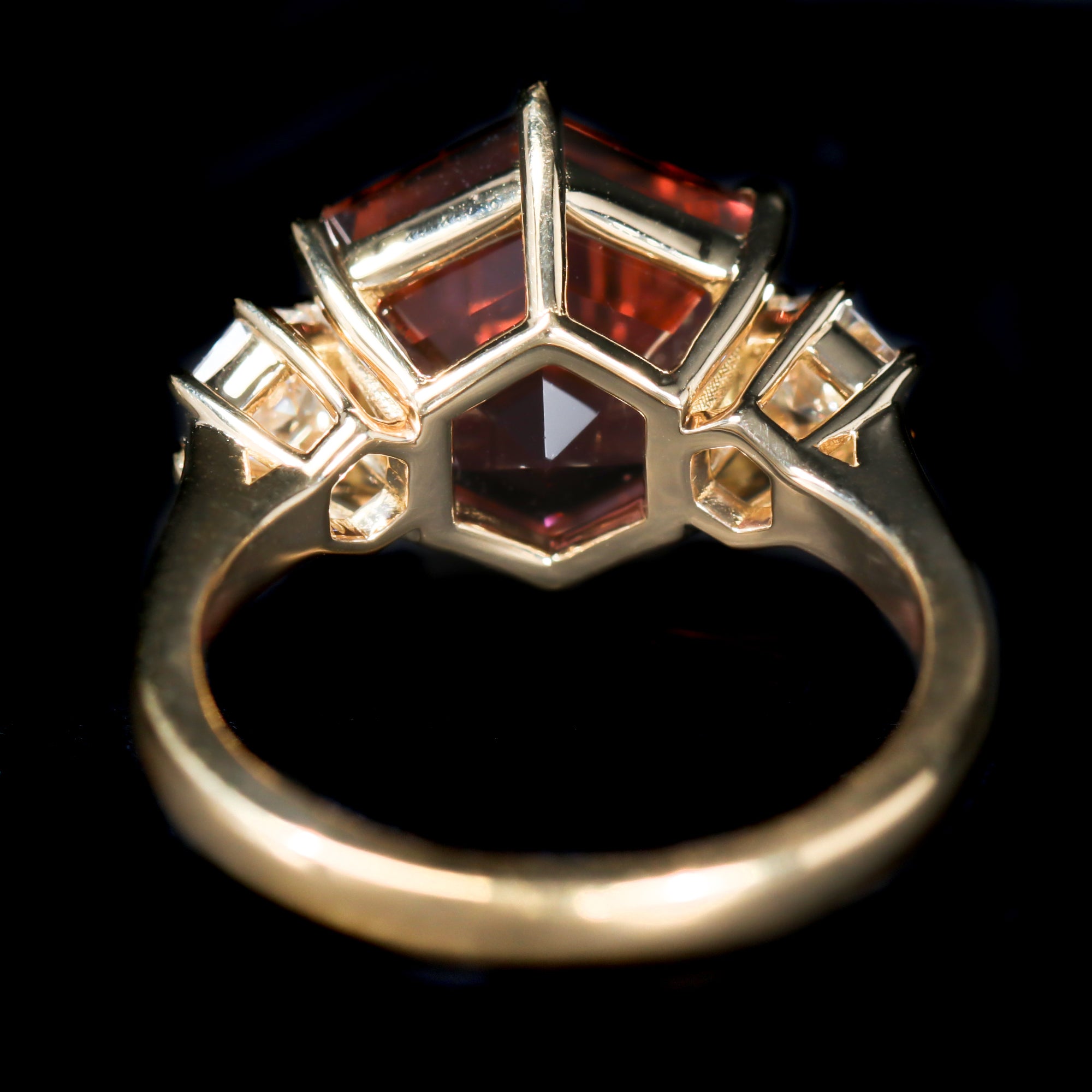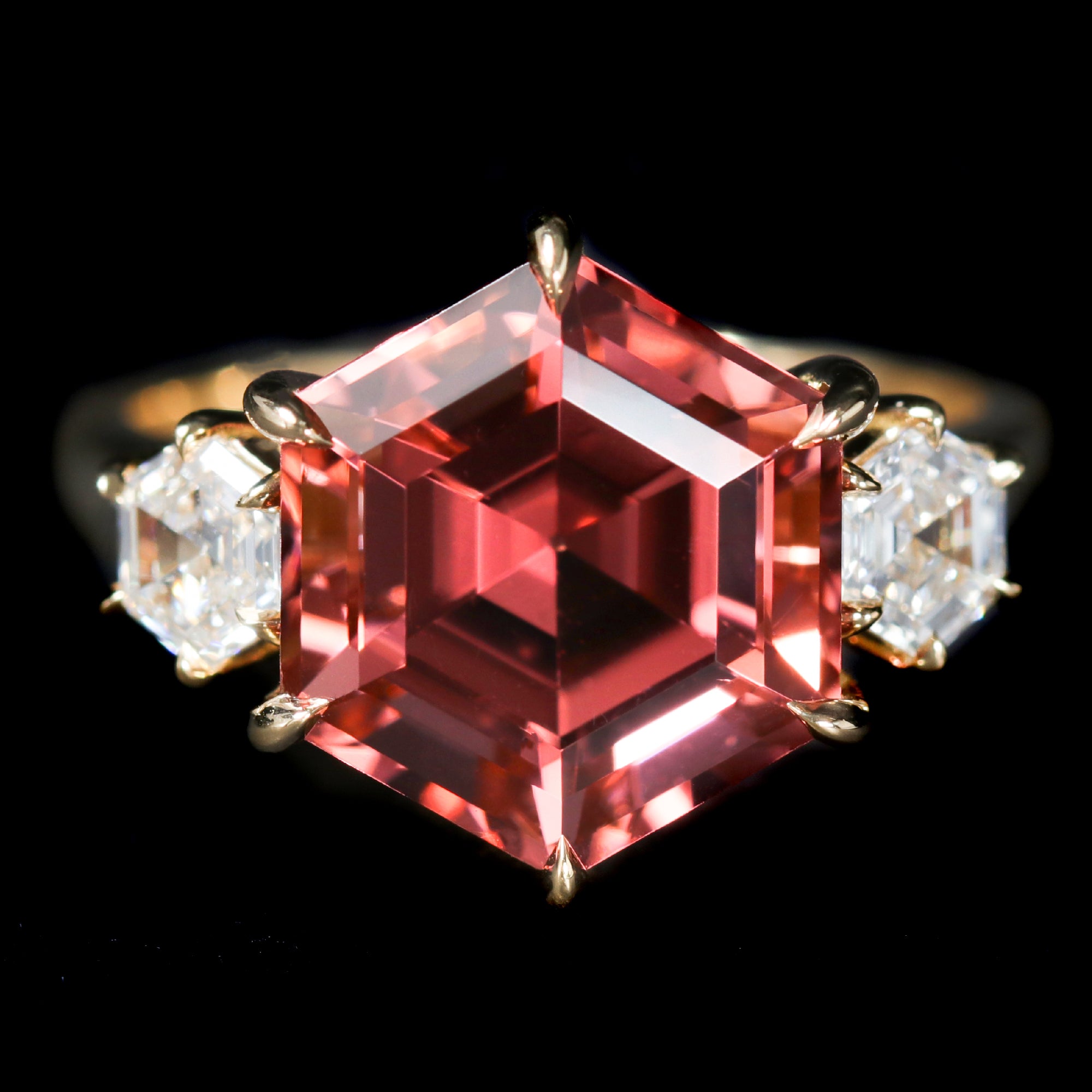 18k yellow gold, tourmaline, and diamond ring. This exceptional 18k gold ring showcases a striking hexagonal tourmaline in a vibrant rose-pink hue. Flanking the center gemstone are two hexagon-cut diamonds that beautifully echo the tourmaline's geometric shape while adding a radiant brilliance to the design.