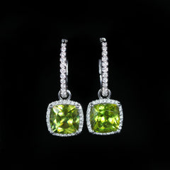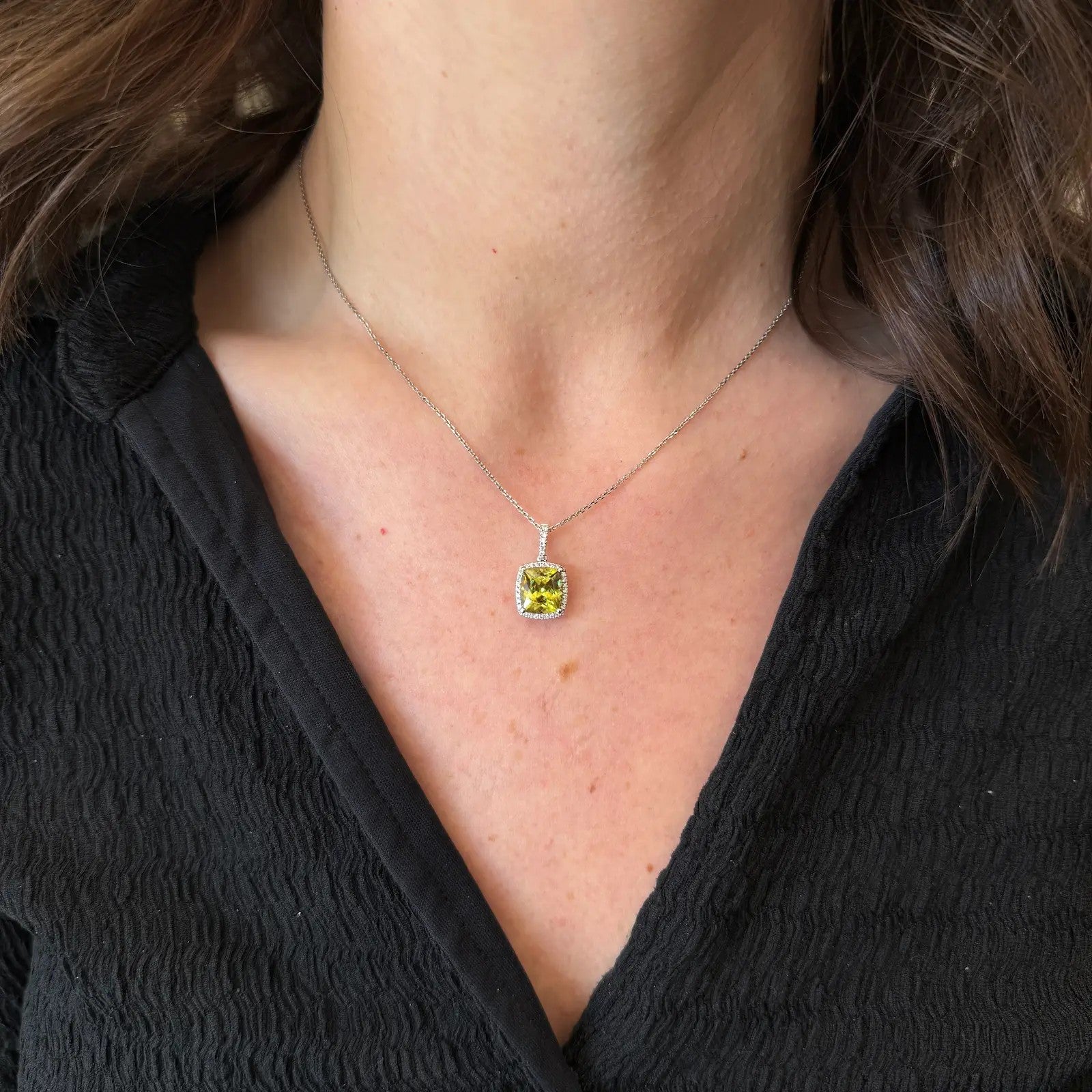14K white gold, sphene, and diamond pendant. A vibrant 3.51 carat sphene takes center stage, glowing with rich chartreuse hues and flashes of golden fire that shift beautifully in the light. The softly cushioned cut is framed by a delicate halo of shimmering diamonds, adding just the right touch of brilliance. Set in 14K white gold, the design feels both refined and modern, allowing the natural beauty of the sphene to shine. A diamond-accented bail adds an extra hint of sparkle, completing the piece with an elegant, cohesive finish.