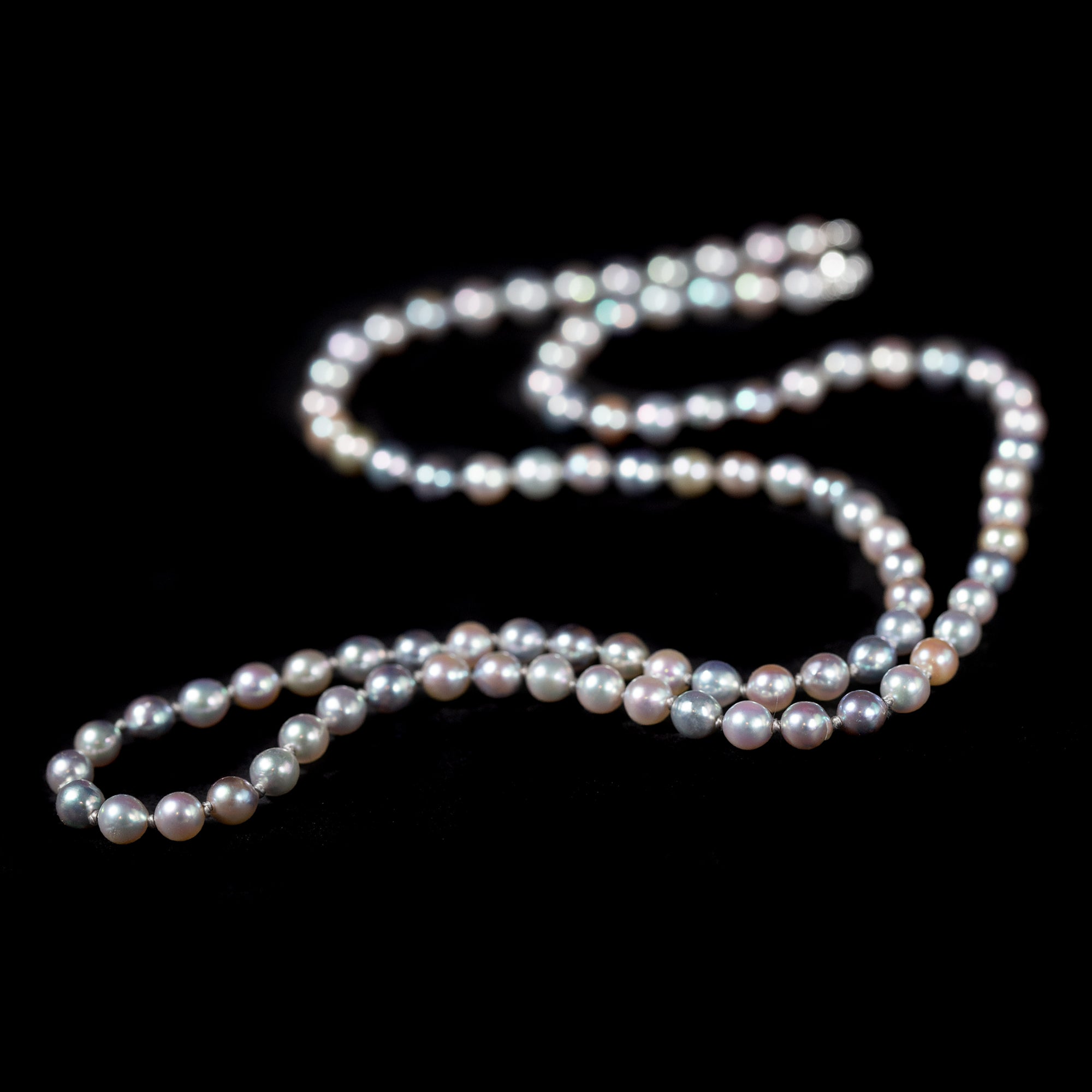 14K white gold Akoya pearl necklace. Timeless and luminous, this Akoya pearl necklace showcases 93 beautifully matched pearls strung in a classic, uninterrupted strand. Each pearl radiates the refined luster and soft, creamy overtones that Akoya pearls are prized for, creating a look that feels both effortlessly elegant and enduringly sophisticated. Finished with a 14K white gold clasp, this 19-inch necklace transitions seamlessly from everyday wear to special occasions, making it a treasured addition to any jewelry collection.