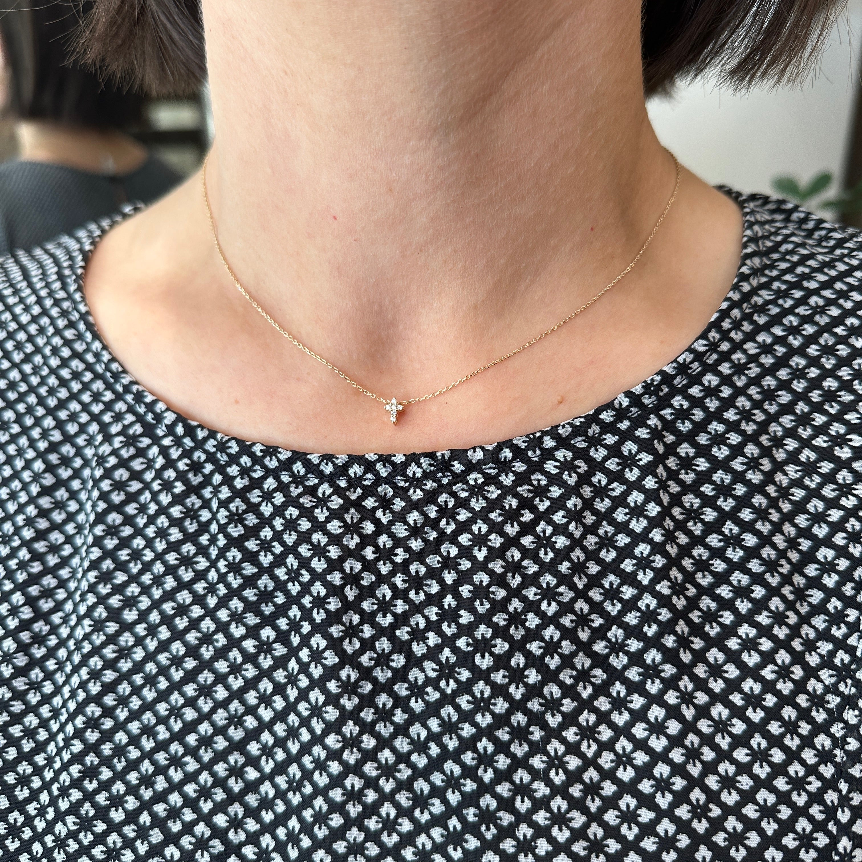 14K yellow gold mini diamond cross necklace. This darling necklace offers a sparkling symbol of faith. It hangs from an 18 inch cable chain and measures approximately 1/4” in height.