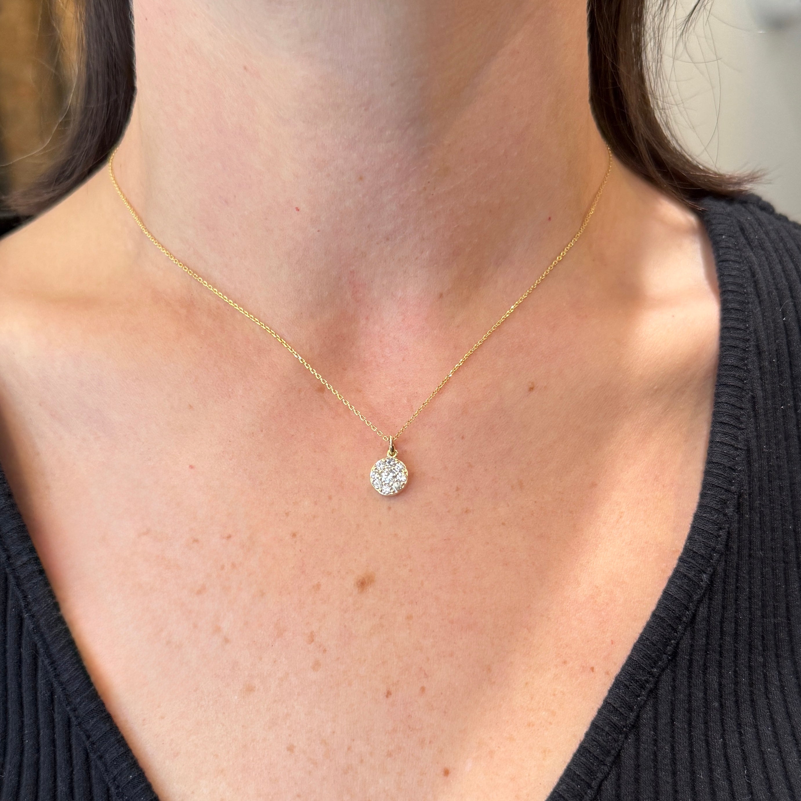 14K white gold and diamond pendant. A dazzling round disc is pavé-set with nine round brilliant cut diamonds, forming a radiant cluster of sparkle. The clean, polished frame enhances the diamonds’ brilliance, creating a versatile design suited for everyday wear. Chain sold separately.