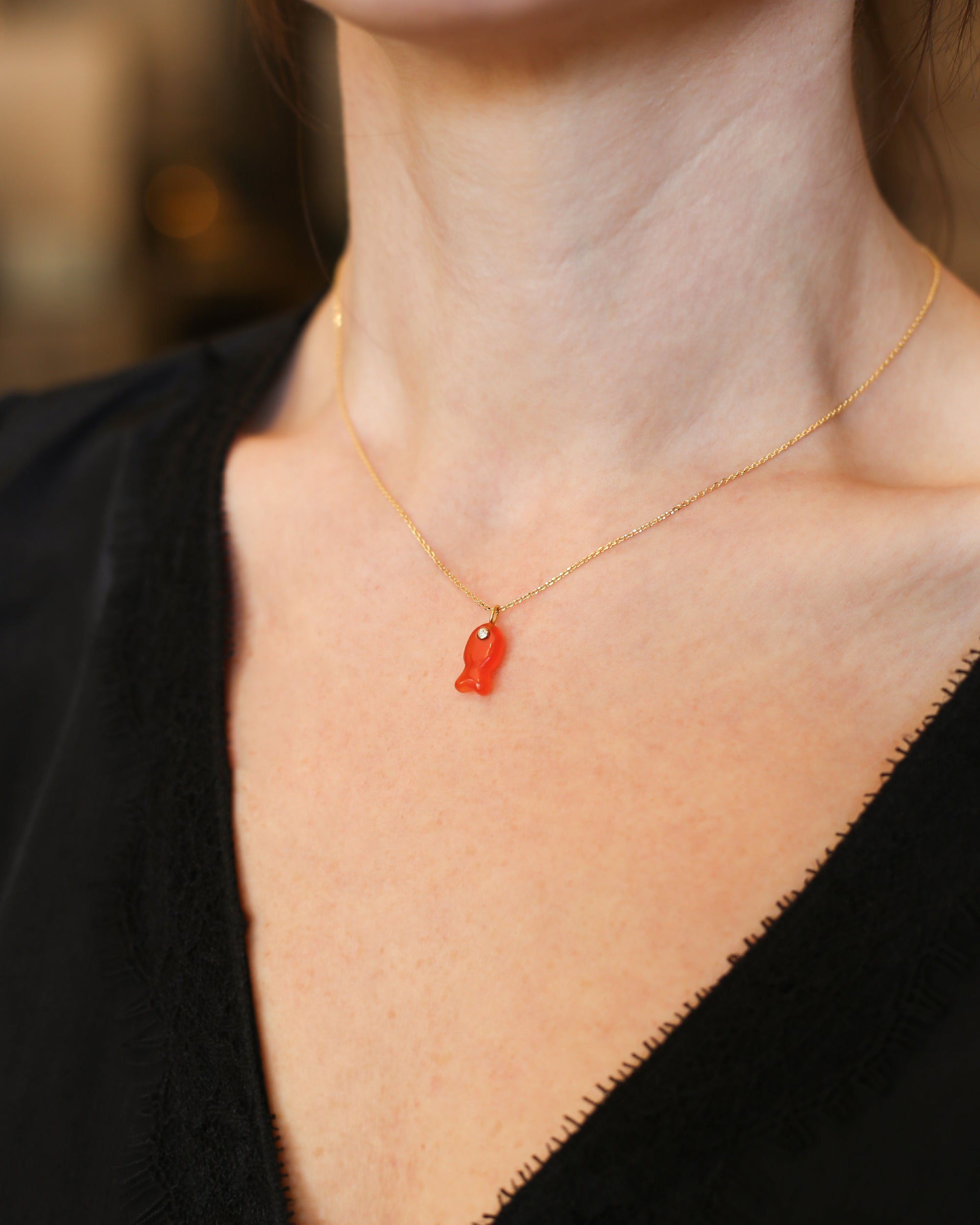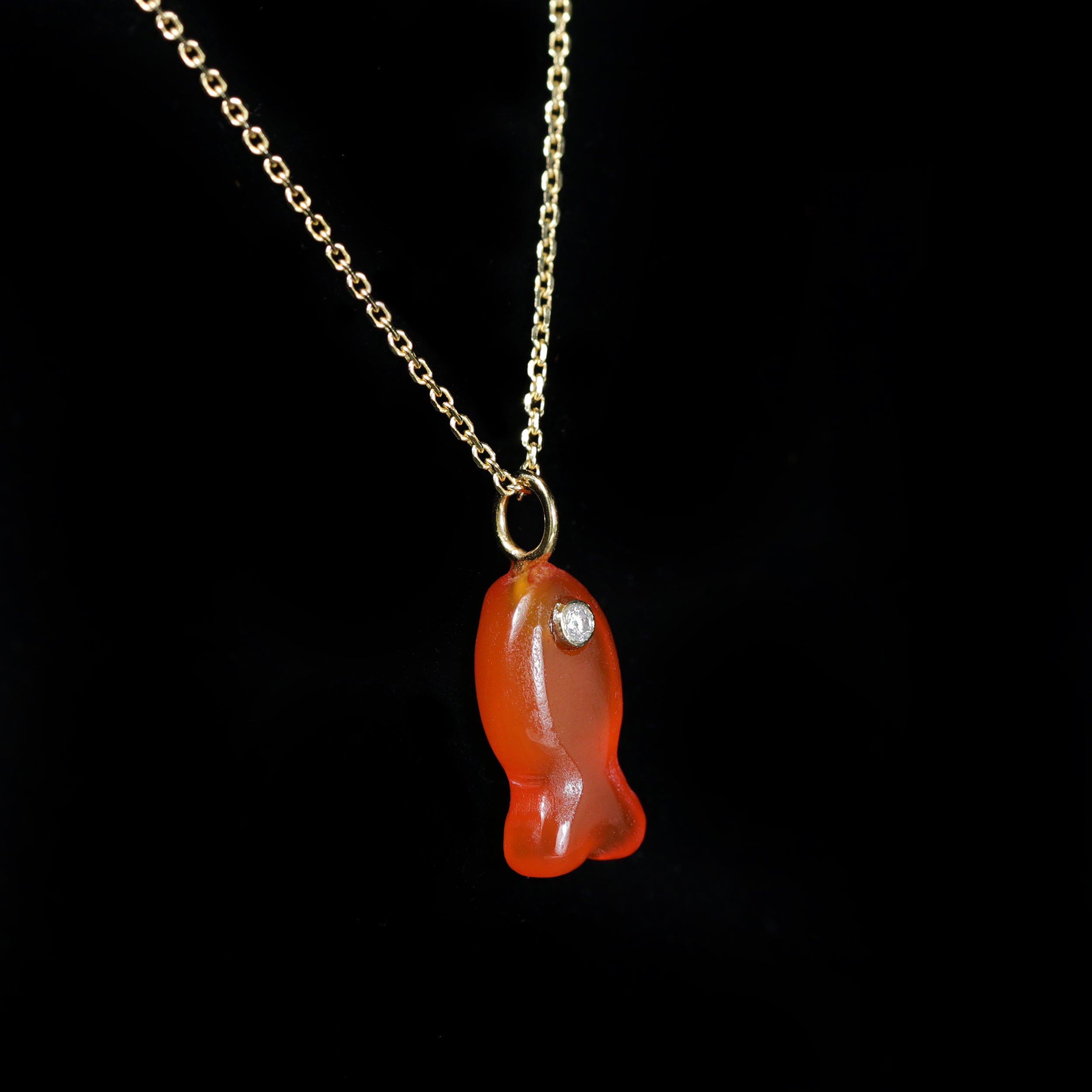 14K yellow gold, carnelian, and diamond charm. A little carved carnelian fish swims happily as this gemstone pendant, glowing in warm orange-red tones. A single round brilliant-cut diamond forms its eye, adding just the right hint of sparkle and personality. Sweet, cheeky, and full of charm, this is the kind of piece that feels like a good-luck talisman and begs to be layered with other favorites.