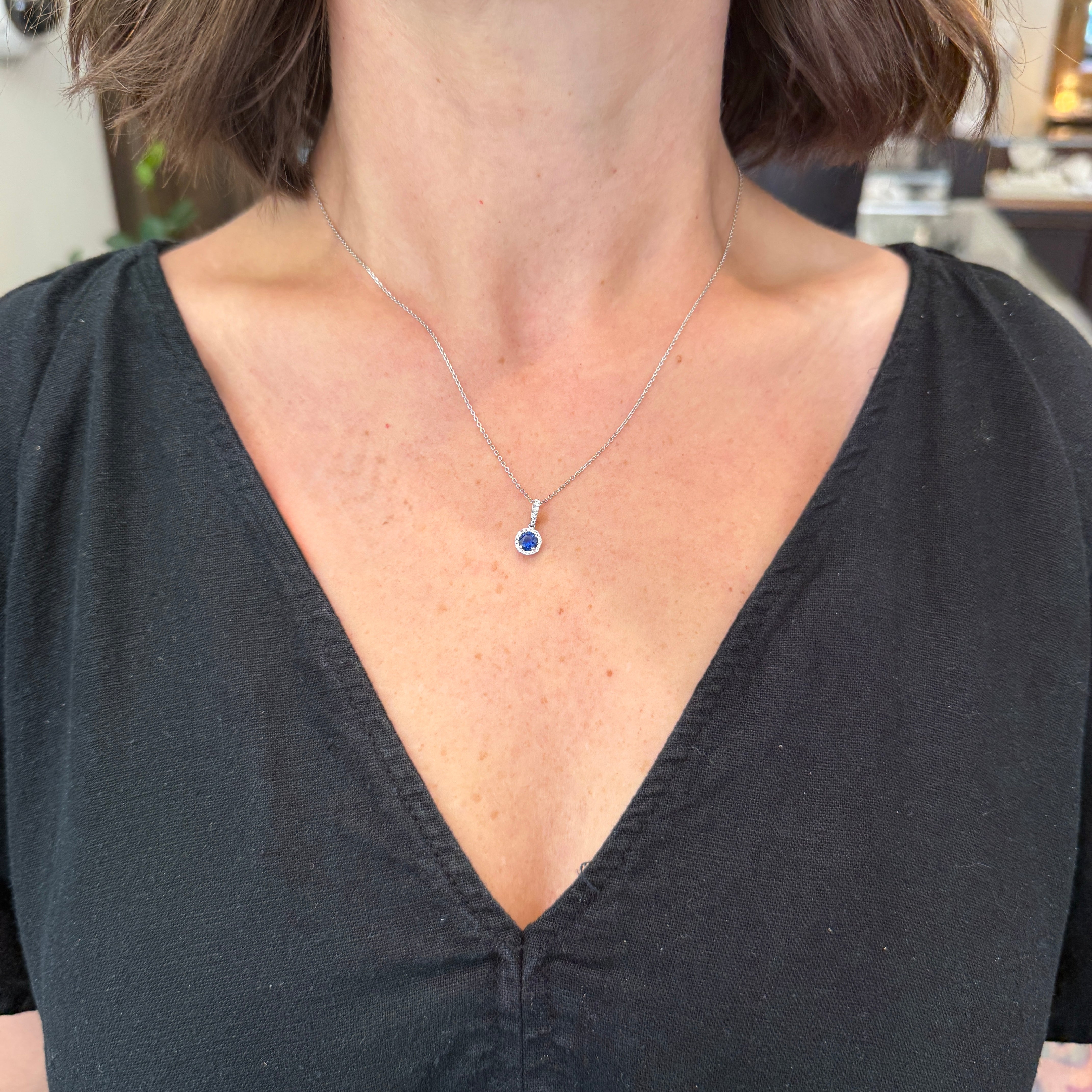 18k white gold, sapphire, and diamond pendant. This stunning pendant, featuring a vibrant sapphire centerpiece, dazzles with stunning blue hues and exceptional brilliance. This exquisite gem is surrounded by a delicate halo of diamonds, finished with a diamond-set bail, allowing the sapphire to dangle gracefully and lay beautifully on the neckline.