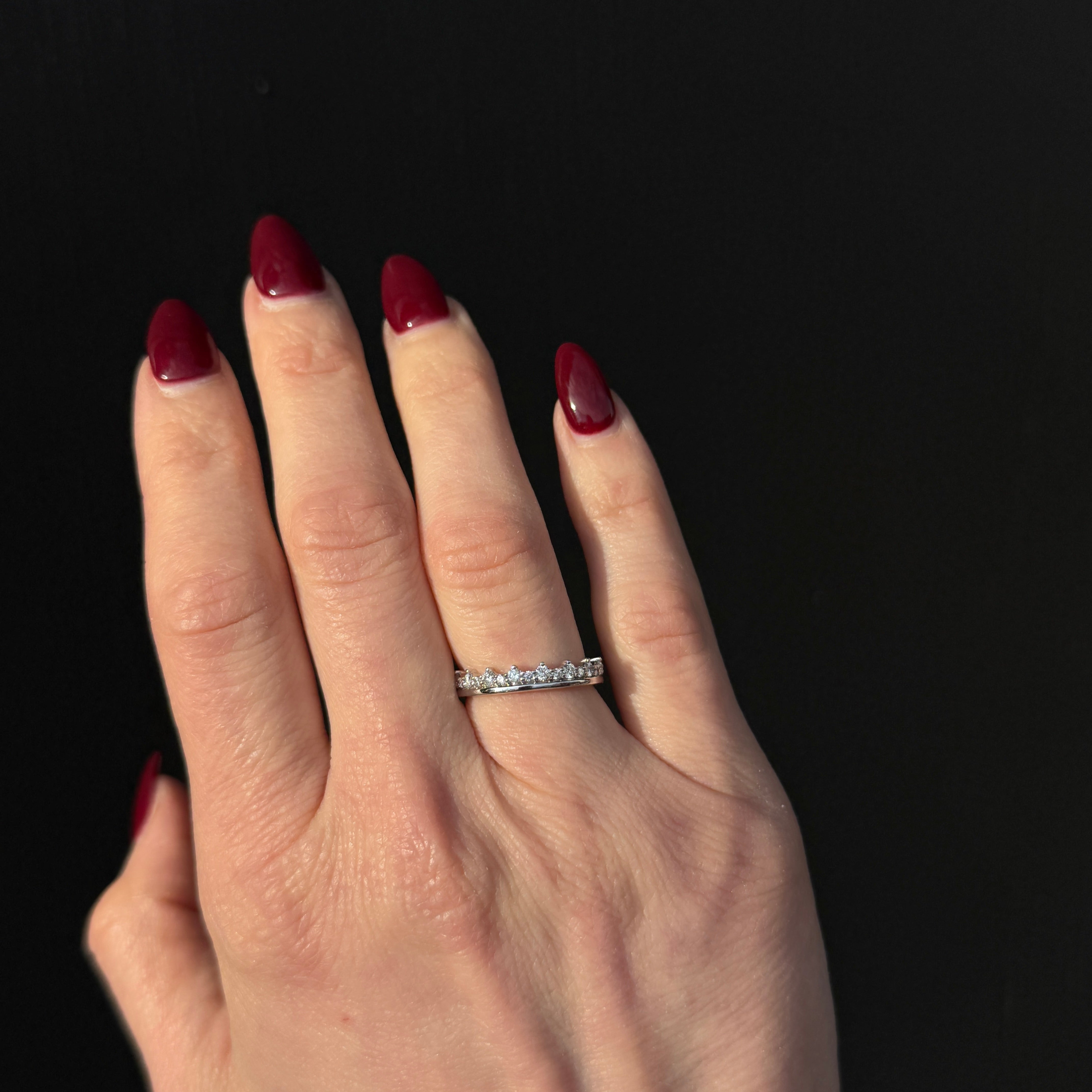 14K white gold and diamond band. A row of 17 diamonds defines this white gold wedding band, arranged in alternating sizes to create a graceful crown-like silhouette. The diamonds are set along a polished white gold band, giving the design a soft contrast between shine and sparkle. Crafted in 14K white gold, the band rests beautifully against an engagement ring and adds dimension and light when layered into a stack.