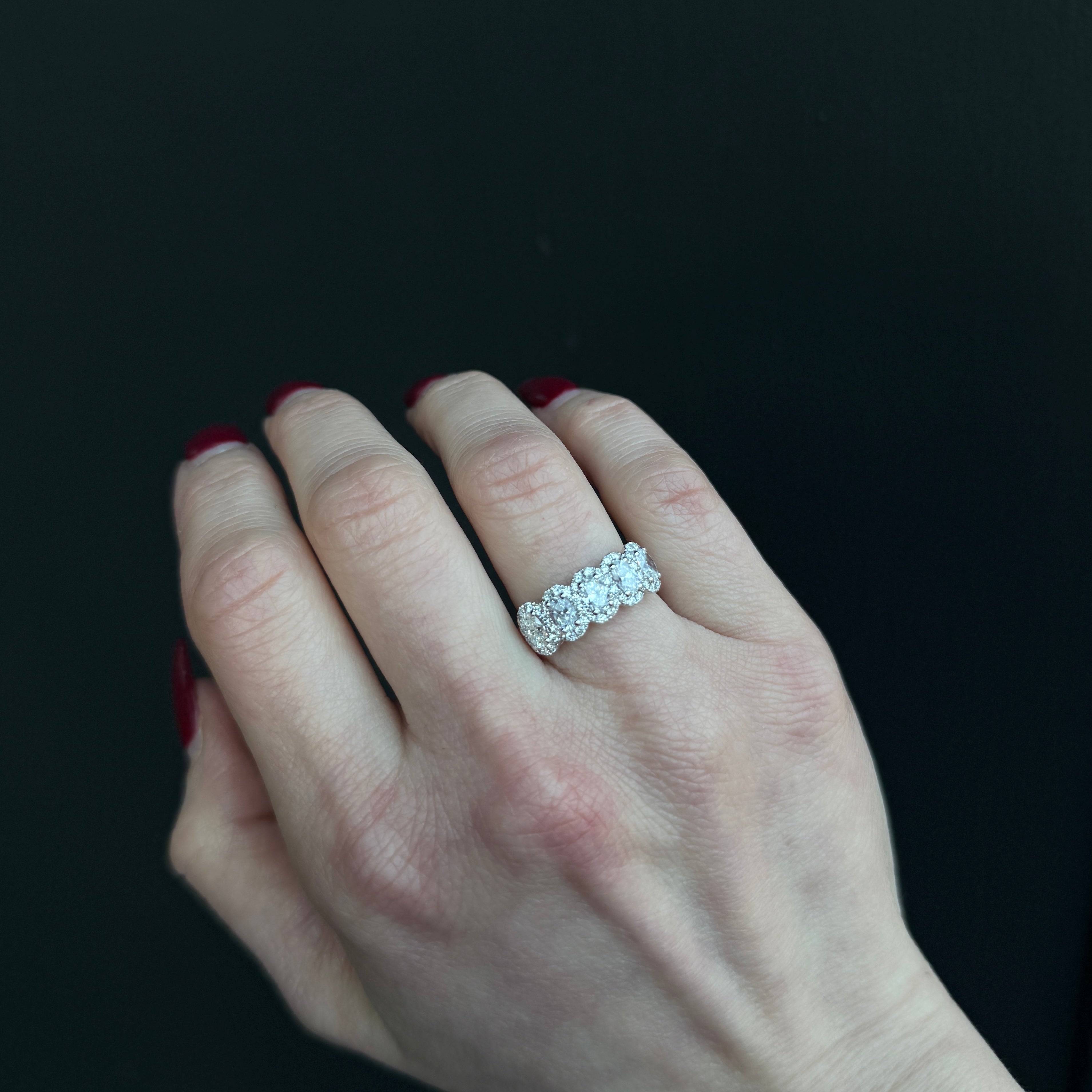 18K white gold and diamond ring. A row of five oval-cut diamonds defines this band, their elongated shapes creating a soft, continuous brilliance across the finger, with each stone framed by a halo of round brilliant-cut diamonds. With approximately 1.68 carats total weight, the diamonds extend across the top half of the ring, offering presence without feeling heavy. Elegant and versatile, the band layers beautifully with other rings yet remains equally striking when worn on its own.