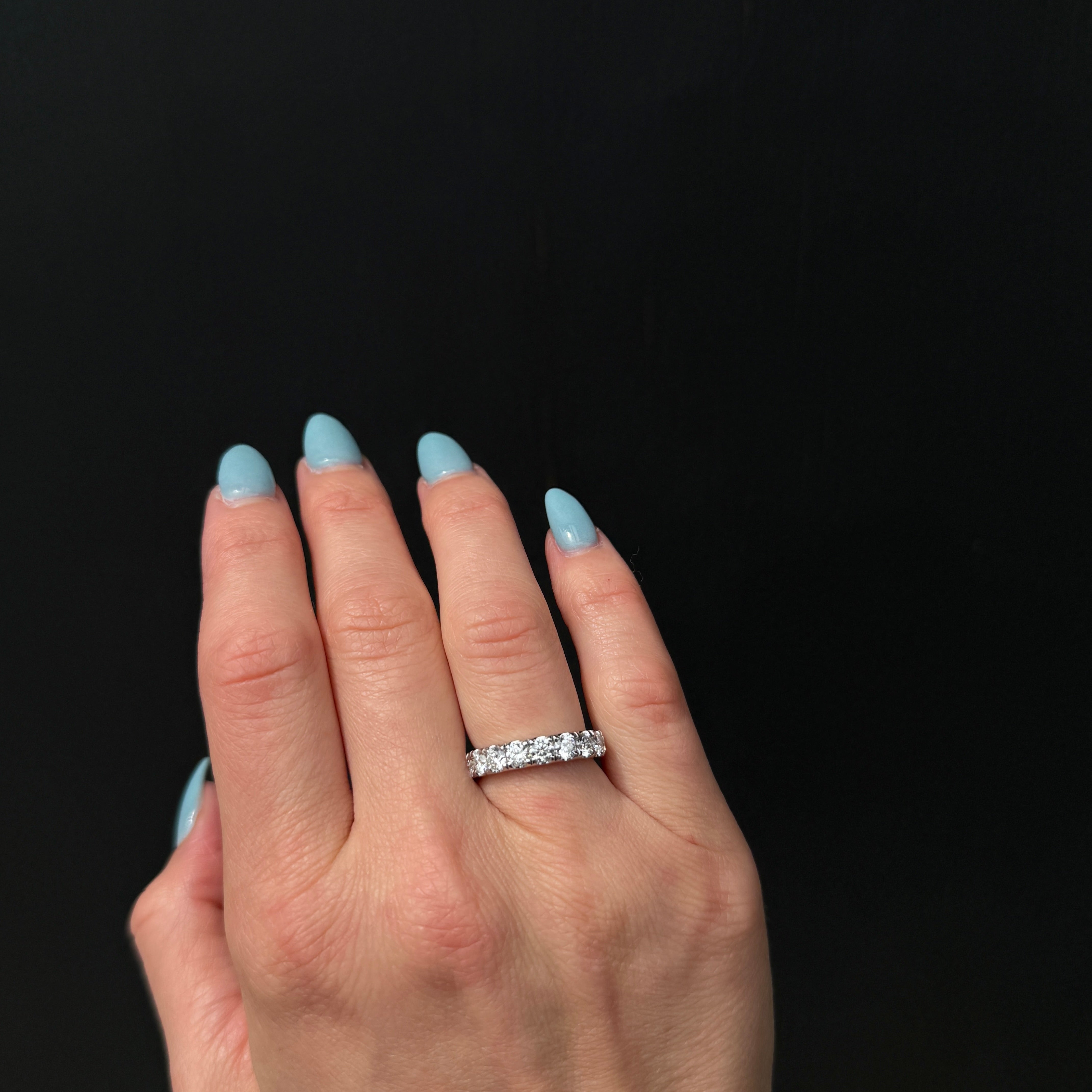 14K white gold and diamond band. A substantial row of nine round diamonds stretches across this 14K white gold band, delivering bright, continuous brilliance. The cool tone of the white gold enhances the crisp sparkle of the diamonds, creating a clean and refined look. Beautiful worn alone or layered into a stack, this band offers timeless style with confident presence.