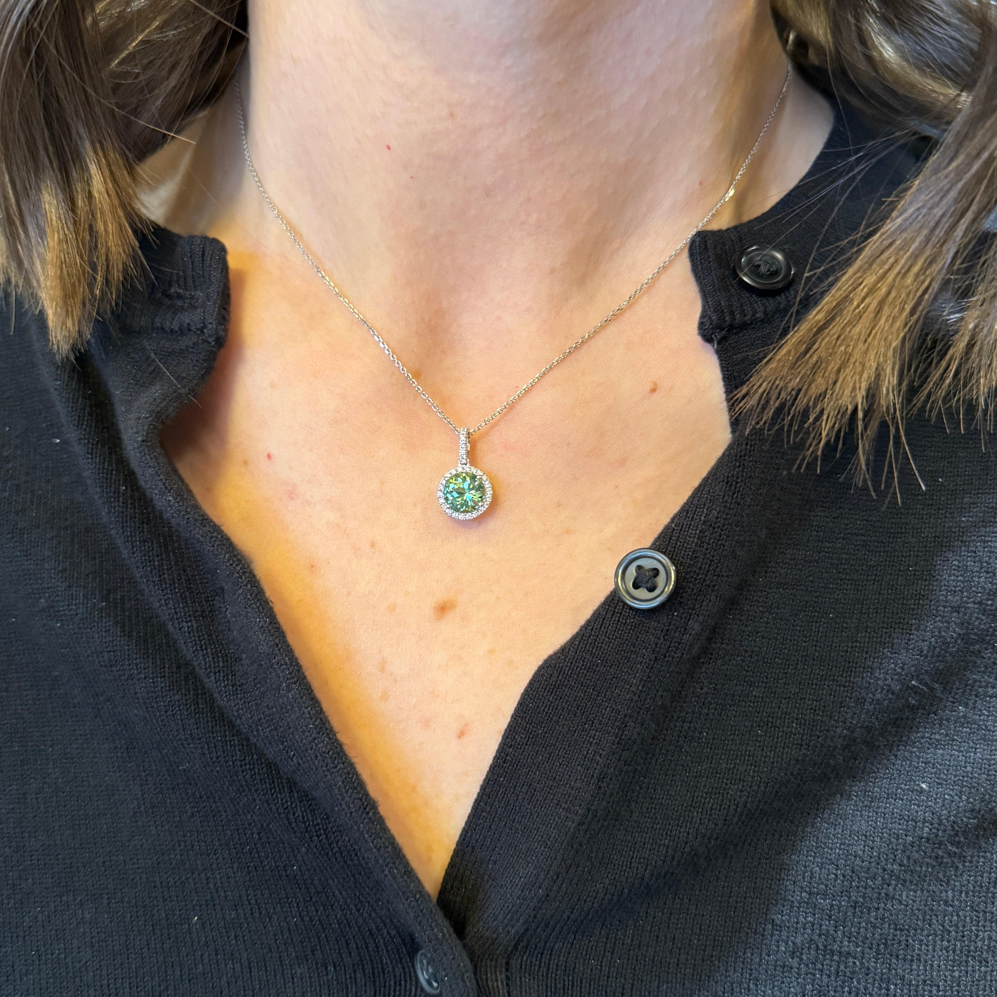 14K white gold, tourmaline, and diamond pendant. A luminous round green tourmaline brings a fresh, minty glow to this 14K white gold pendant. The gemstone is framed by a halo of round brilliant cut diamonds that enhance its radiant color, while a diamond-set bail adds an additional touch of sparkle. Chain sold separately.