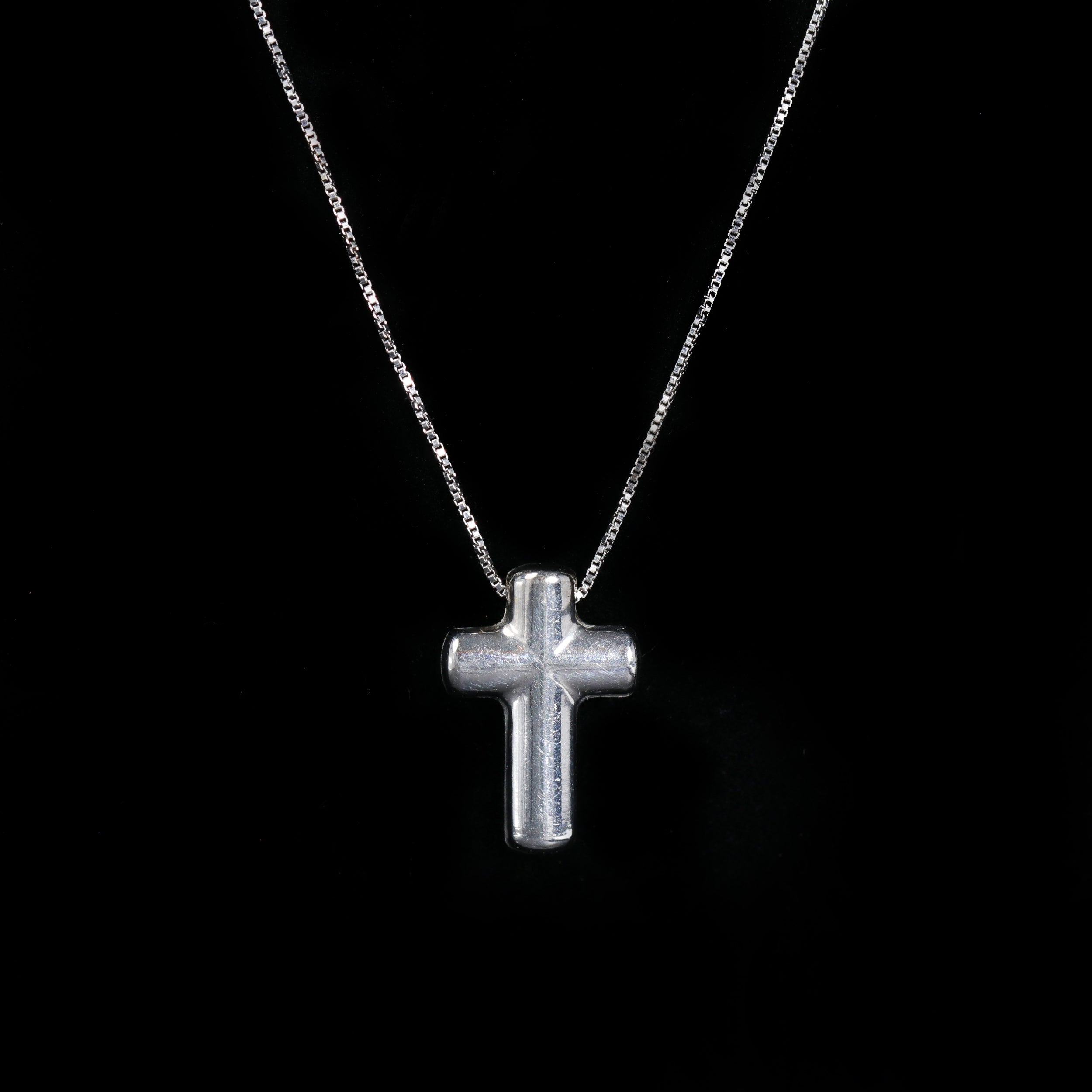 Estate 18K white gold cross necklace.This elegant estate necklace features an 18K white gold cross pendant, measuring approximately 1/2 inch in length, with softly rounded edges and a smooth, polished finish. The pendant is suspended from an 18-inch white gold box chain, offering a fine, delicate shimmer that complements the piece’s refined silhouette. Timeless and meaningful, this necklace makes a beautiful addition to any collection or a thoughtful, sentimental gift.