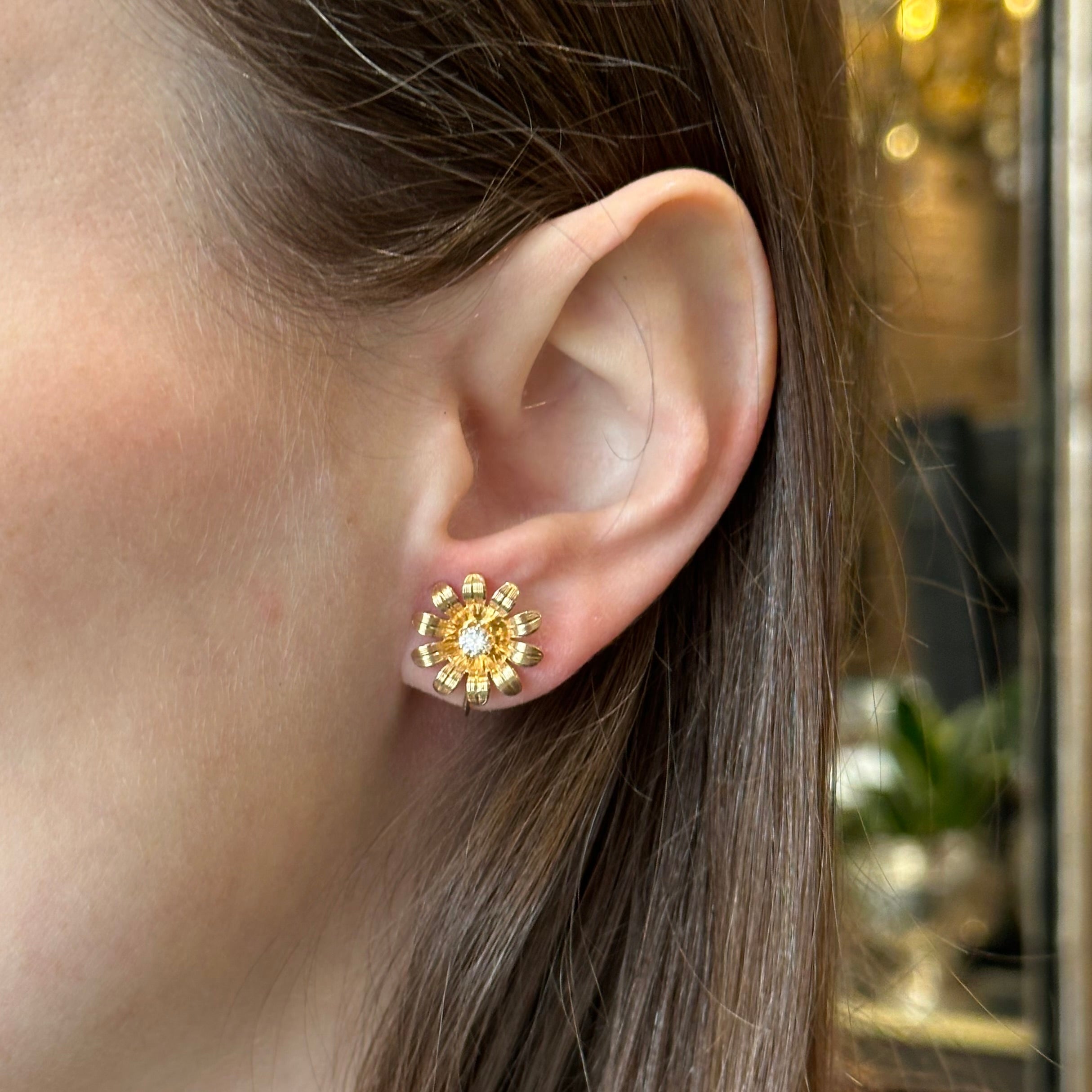 10K yellow gold and diamond earrings. Starring a matched pair of sparkling round brilliant cut diamonds, this lovely pair of flower stud earrings are sure to be a playful addition to your jewelry wardrobe. Fashioned in 10K yellow gold, the earrings secure with clip on screw backs.
