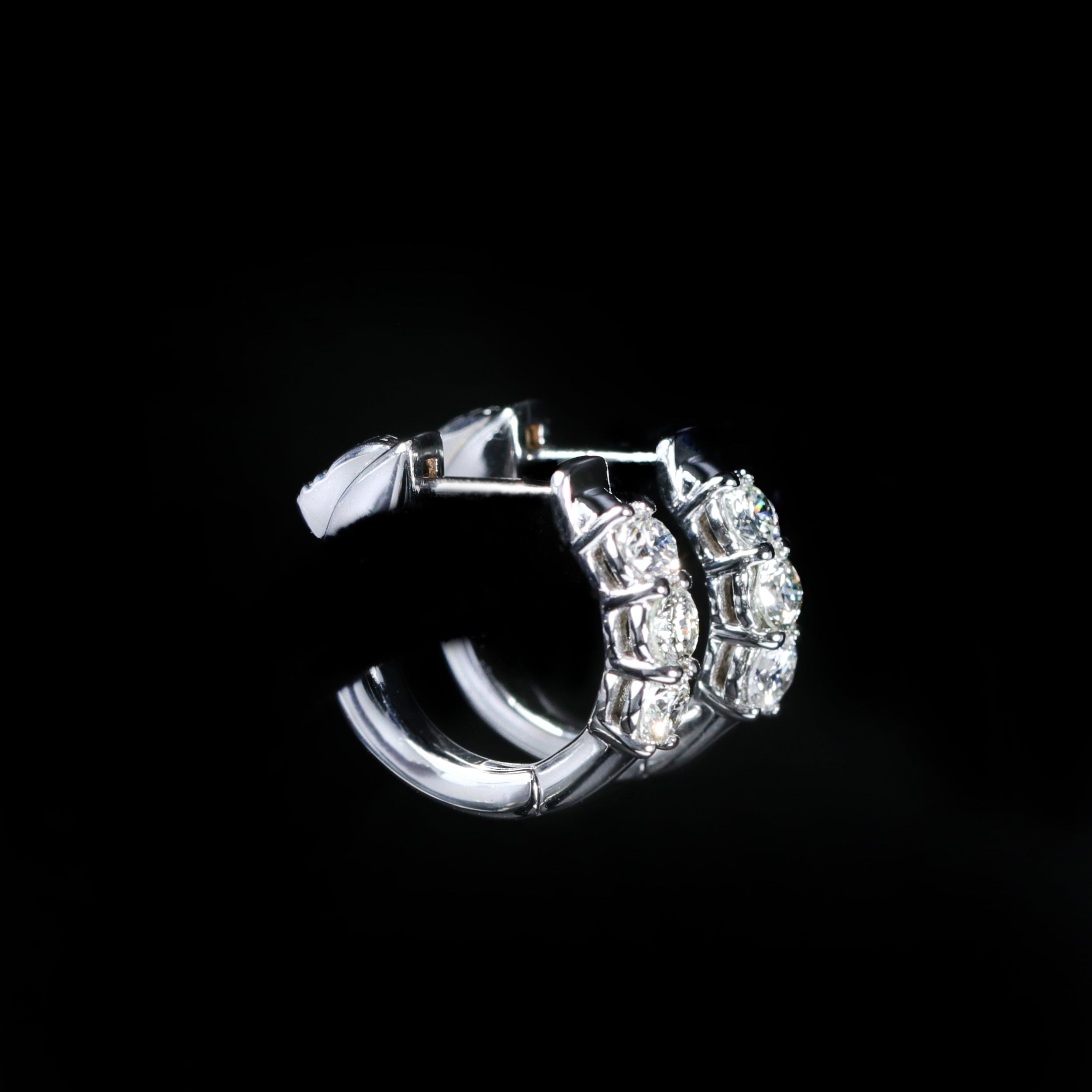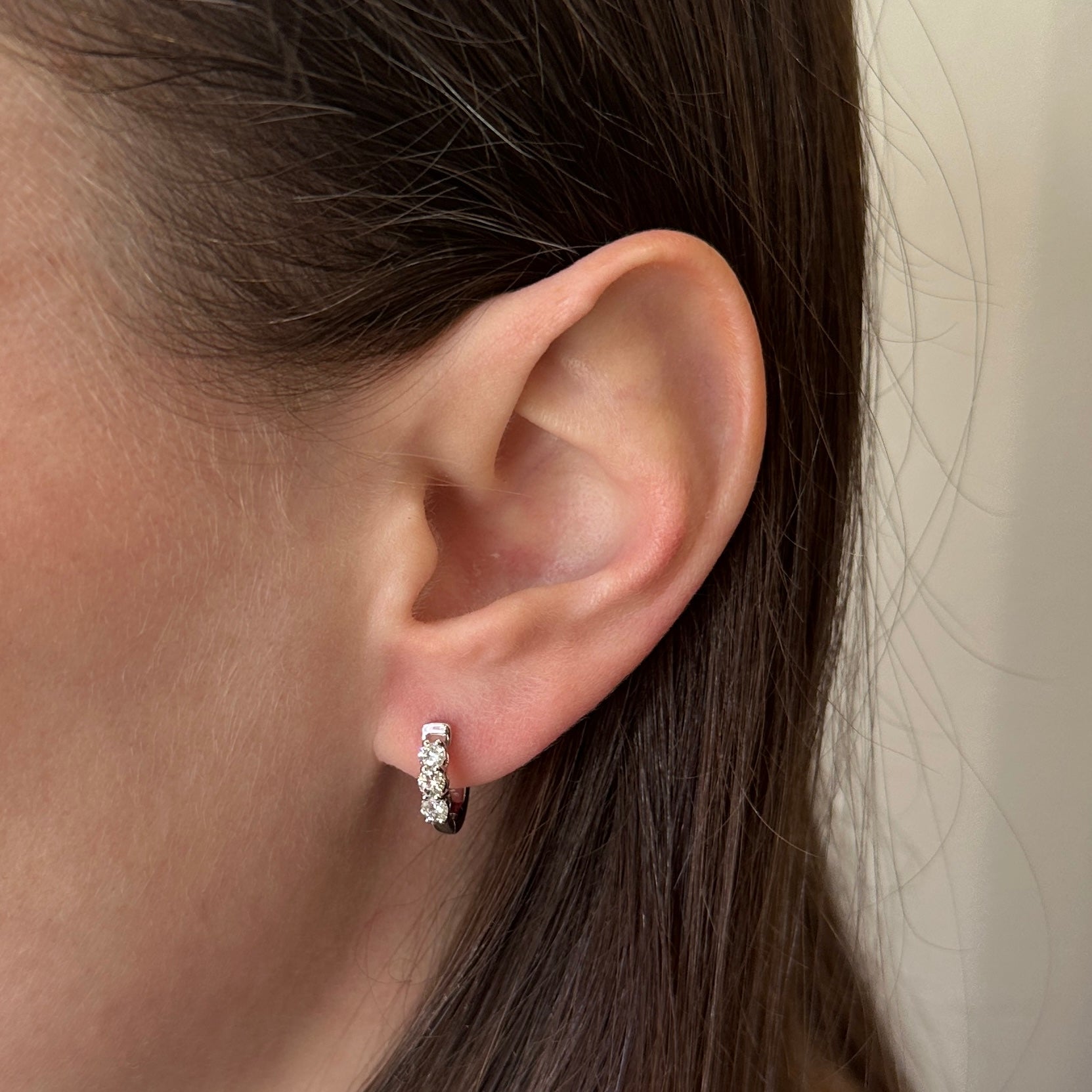 14K white gold diamond earrings. These huggie hoops are the perfect everyday pair. Crafted in 14K white gold, each hoop is set with three round brilliant cut diamonds. The close-fit design hugs the ear comfortably while adding just the right amount of sparkle. Whether worn on their own or paired with other favorites, these hoops are a beautiful choice for any occasion. The earrings measure approximately 1/2 inch in diameter.