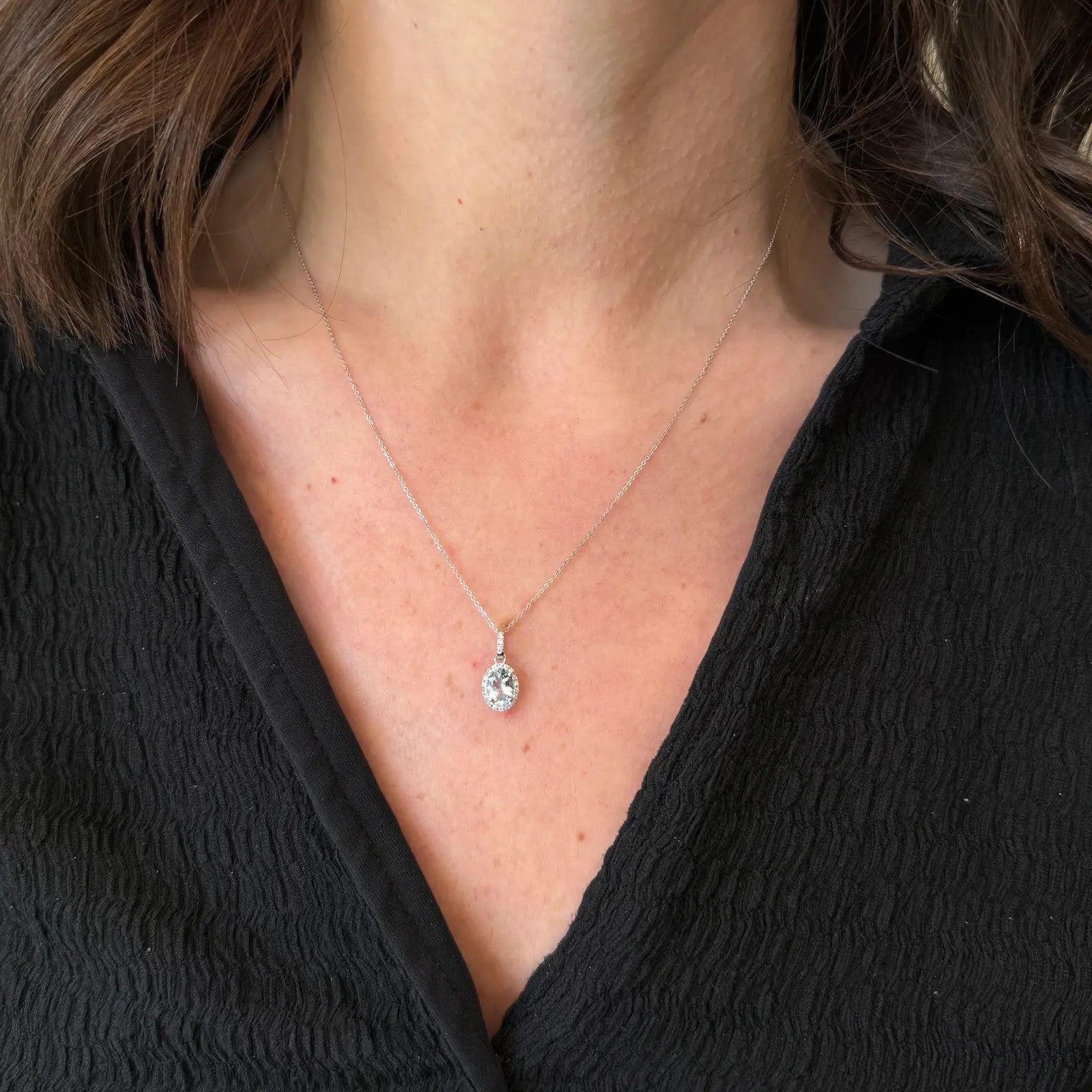 14K white gold aquamarine and diamond pendant. A luminous 0.75 carat aquamarine takes center stage in this dainty pendant, its soft blue hue beautifully framed by a halo of sparkling diamond accents. Set in 14K white gold, the diamonds continue along the bail, adding an extra touch of brilliance. Delicate yet eye-catching, this piece offers a fresh pop of color with just the right amount of shimmer for everyday elegance.