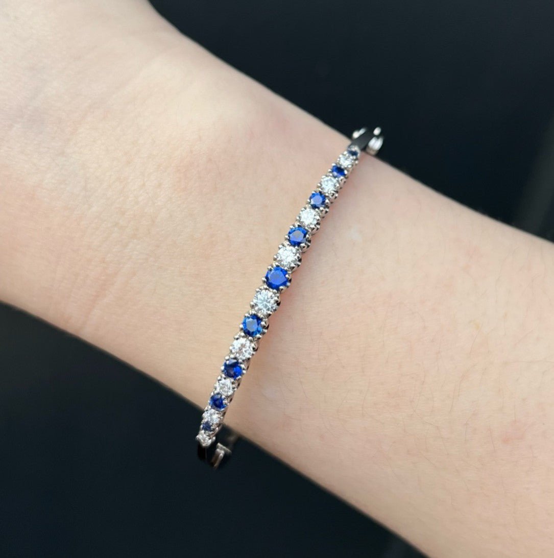 14K white gold, sapphire, and diamond bangle. Crafted in gleaming white gold, this timeless dazzler features a beautifully graduated row of rich blue sapphires and sparkling round brilliant cut diamonds across the top. Elegant yet effortless, it’s a piece you can reach for every day—lovely worn on its own for a clean, classic look or layered with other bangles for a more personal, collected feel. Designed to sit comfortably on a 6.5–7 inch wrist, it’s a versatile addition to any jewelry collection.