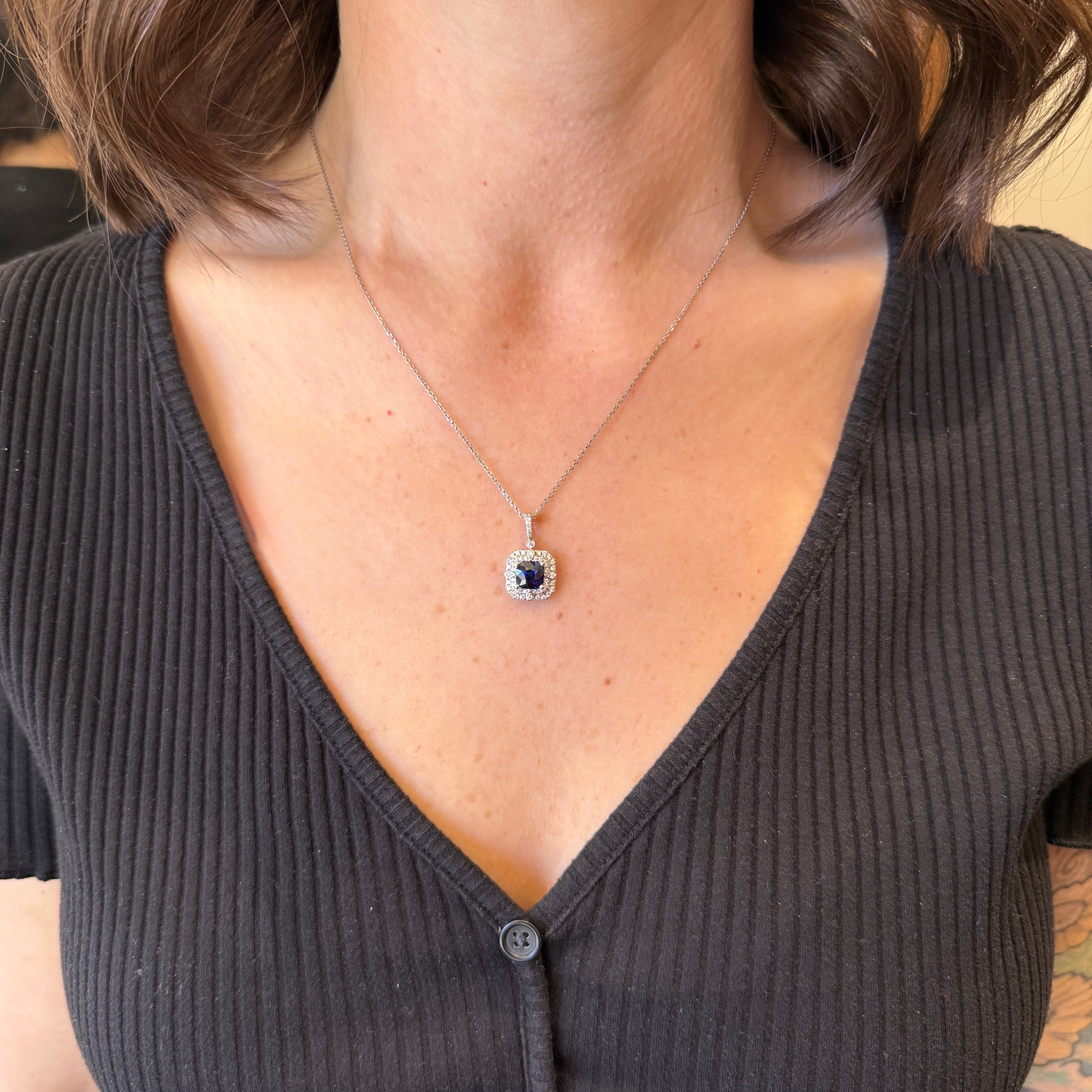 14K white gold, sapphire, and diamond pendant. A cushion cut blue sapphire anchors this 14K white gold pendant, its rich color enhanced by a beautifully layered double halo of diamonds. The surrounding round brilliant cut diamonds add depth and radiance while emphasizing the sapphire's soft, elegant shape. Finished with a diamond-set bail, the pendant offers graceful movement and refined sparkle. Designed to be worn on the chain of your choice.