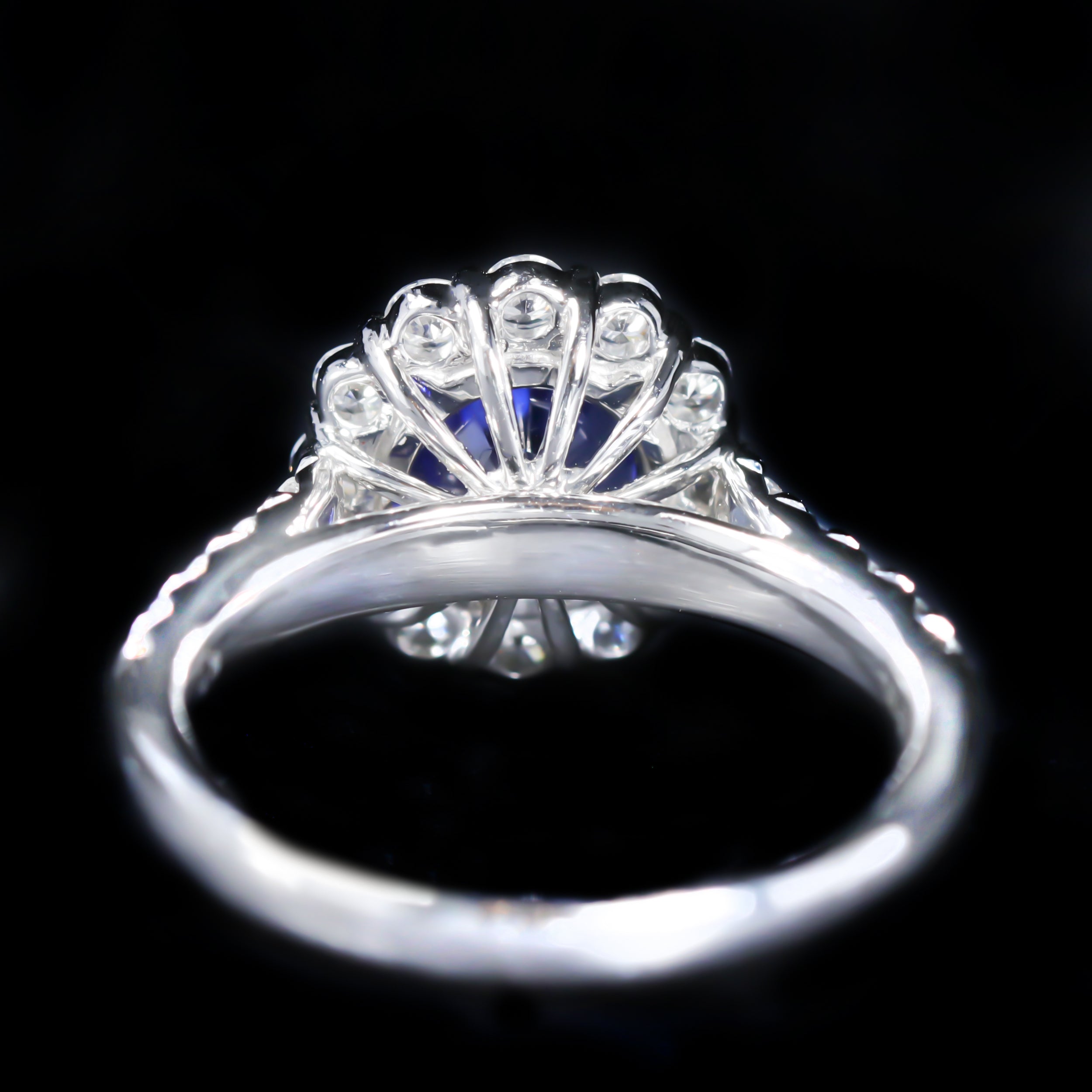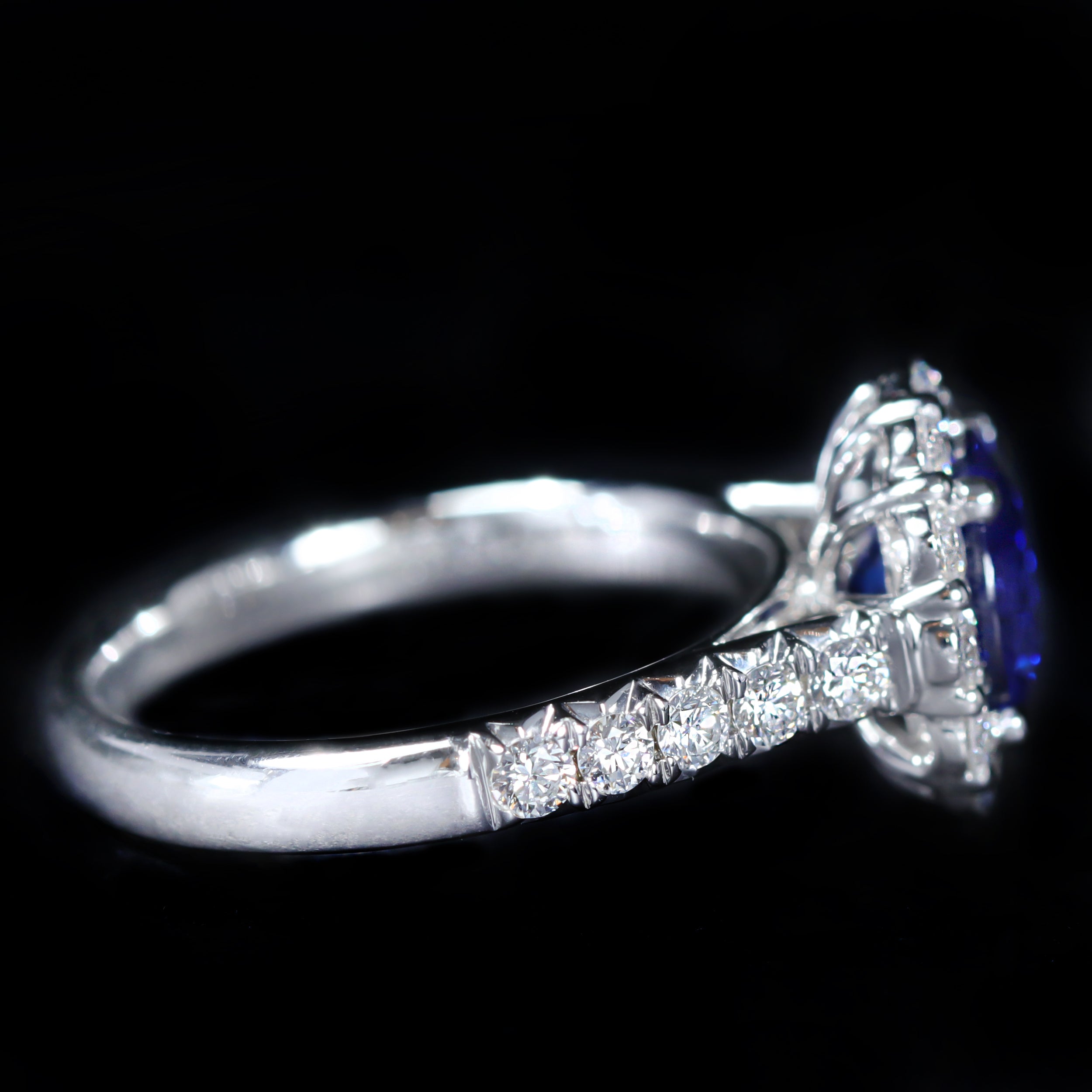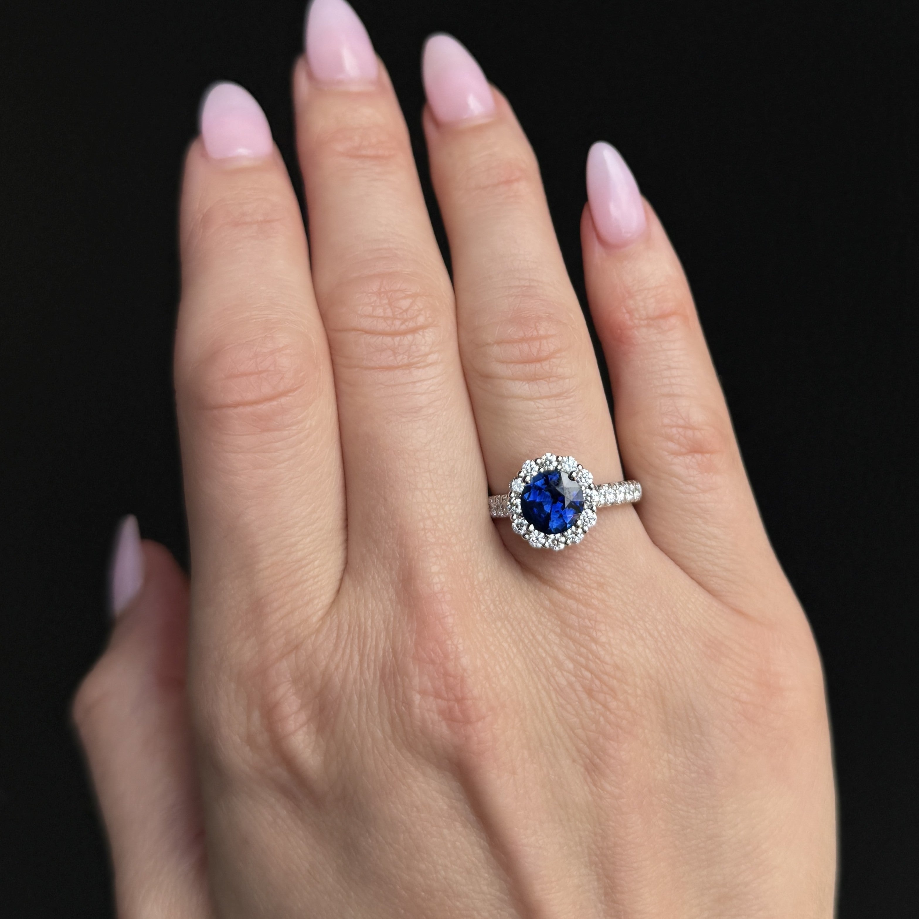 14K white gold, sapphire, and diamond ring. Crafted in 14k white gold, this ring features a vibrant round cut Ceylon sapphire, accompanied by a CDC report confirming its origin and quality. The sapphire is set in four prongs and surrounded by a halo of round brilliant cut diamonds that continue down the shank, adding a graceful cascade of sparkle. Known for their exceptional clarity and vivid blue hue, Ceylon sapphires are among the most sought-after in the world—making this piece both timeless and distinctive.