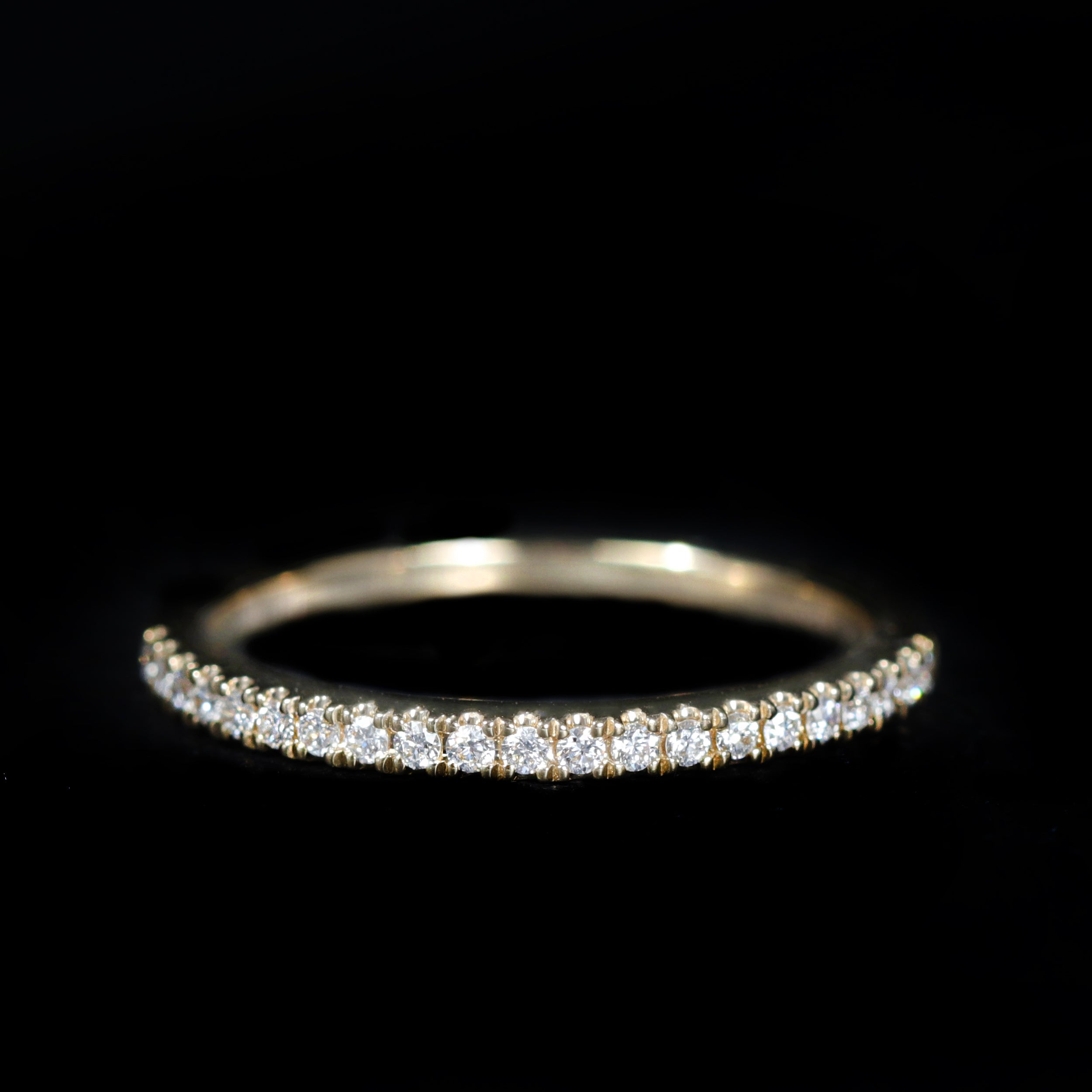 14K yellow gold diamond band. The epitome of classic style, this dainty diamond band can stand alone, pair with an engagement ring, or be added to a stack. Twenty-one sparkling round brilliant cut diamonds, weighing approximately 0.16 carats total, travel across the top half of the band, meticulously set to maximize their brilliance.