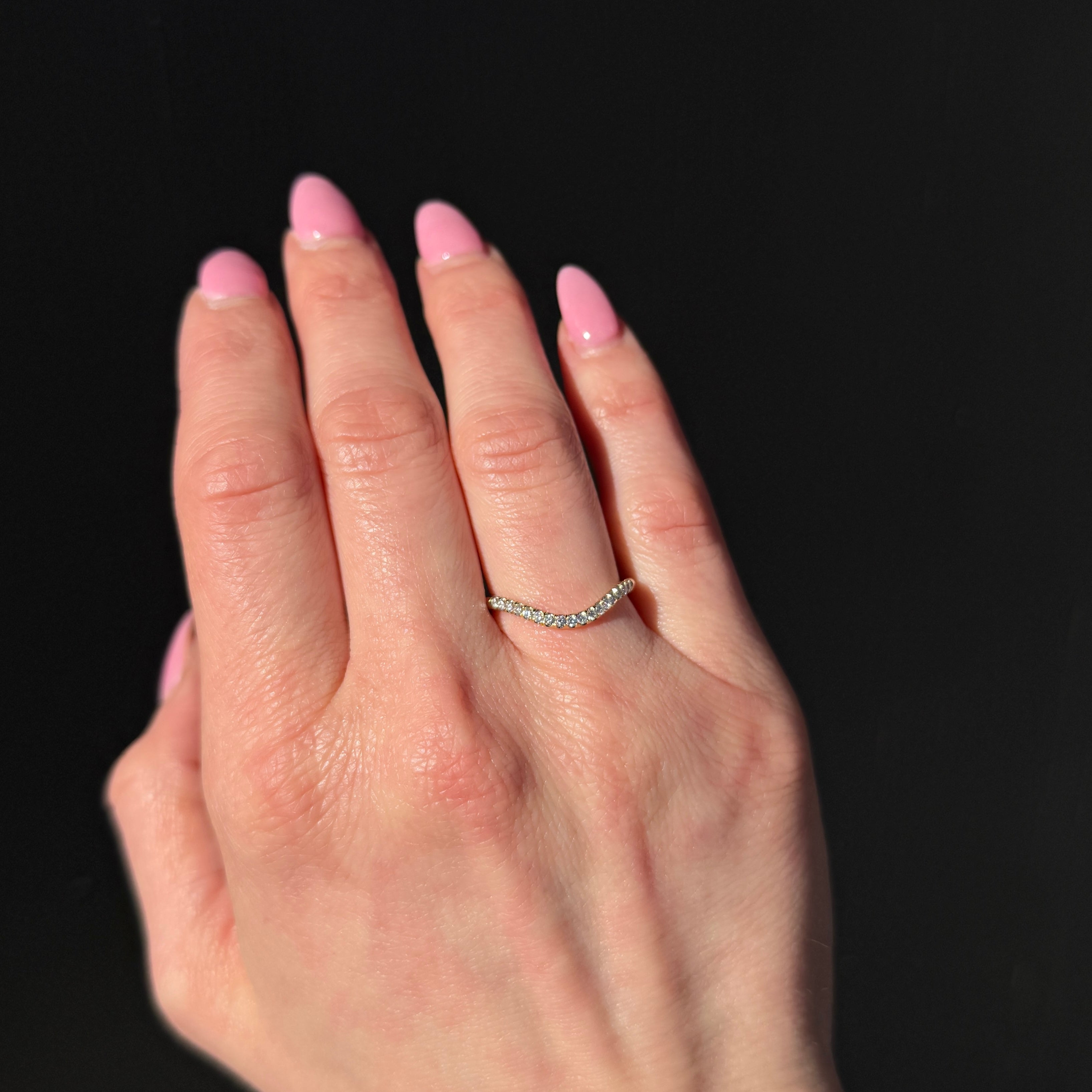 14K yellow gold and diamond band. This 14K yellow gold curved wedding band is a signature piece designed to nestle beautifully alongside an engagement ring, its gentle curve complementing a wide variety of settings with effortless harmony. Seventeen round cut diamonds are set along the band, adding a continuous thread of brilliance that enhances without overpowering the ring it accompanies. Warm, versatile, and thoughtfully designed, this band is as much a finishing touch as it is a piece worthy of standing on its own.