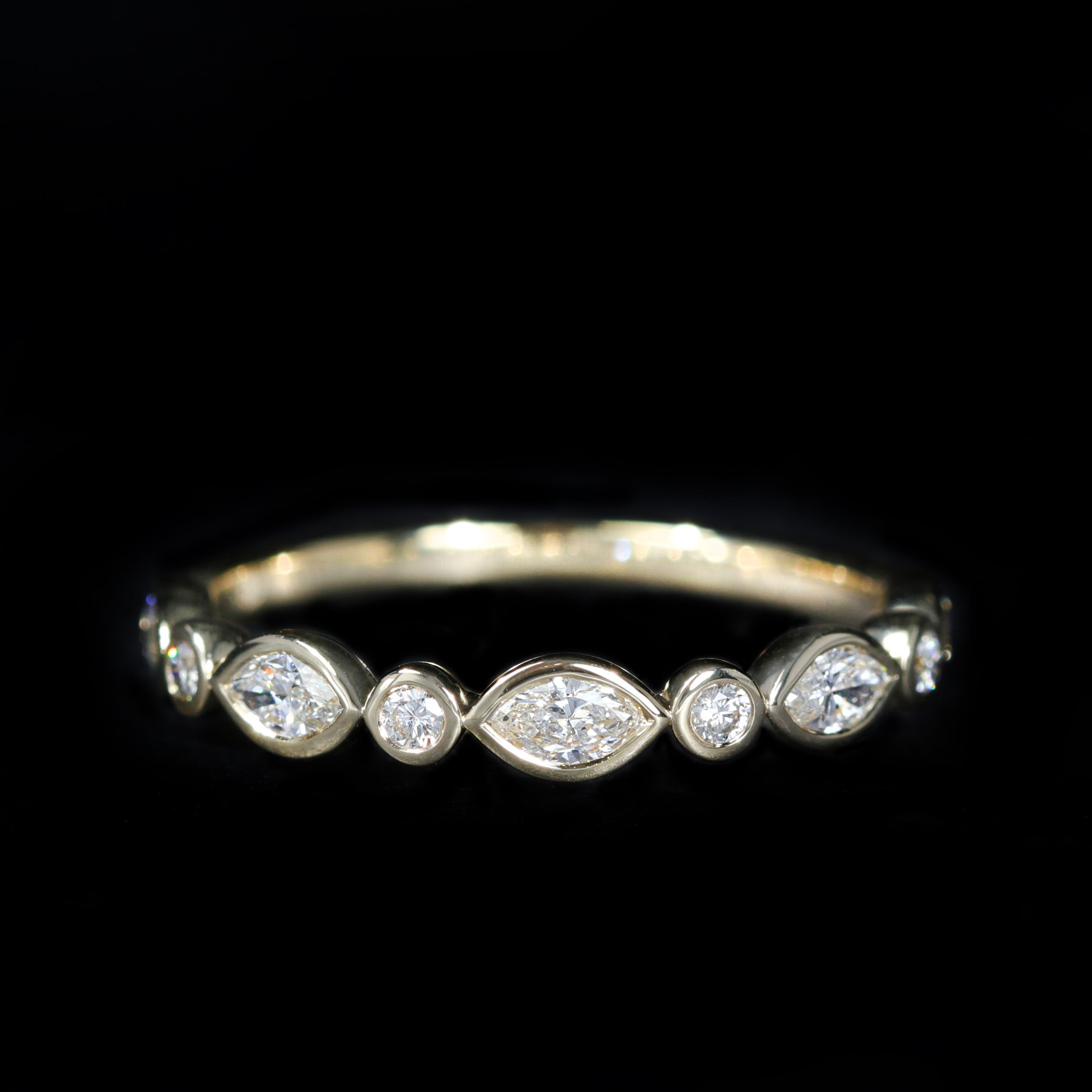 14K yellow gold and diamond band. An elegant mix of shapes and sparkle, this band features five marquise cut diamonds alternating with smaller round brilliant cut diamonds, all bezel-set along the top half of the design. With its smooth gold setting and refined proportions, this band is both distinctive and versatile—perfect on its own or stacked with other rings.