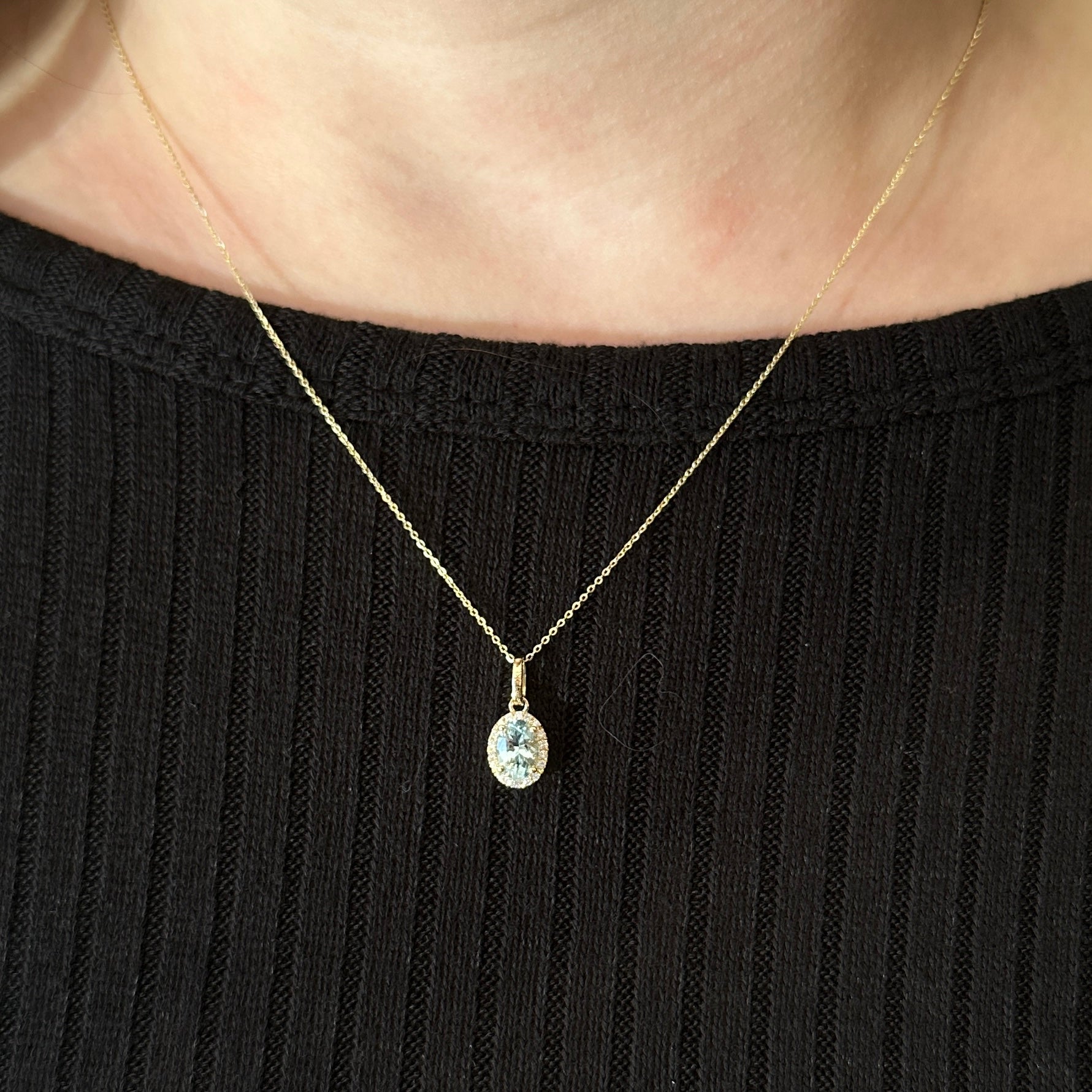 14K yellow gold aquamarine and diamond necklace. A luminous 0.75 carat aquamarine takes center stage in this dainty pendant, its soft blue hue beautifully framed by a halo of sparkling diamond accents. Set in 14K yellow gold, the diamonds continue along the bail, adding an extra touch of brilliance. Delicate yet eye-catching, this piece offers a fresh pop of color with just the right amount of shimmer for everyday elegance.