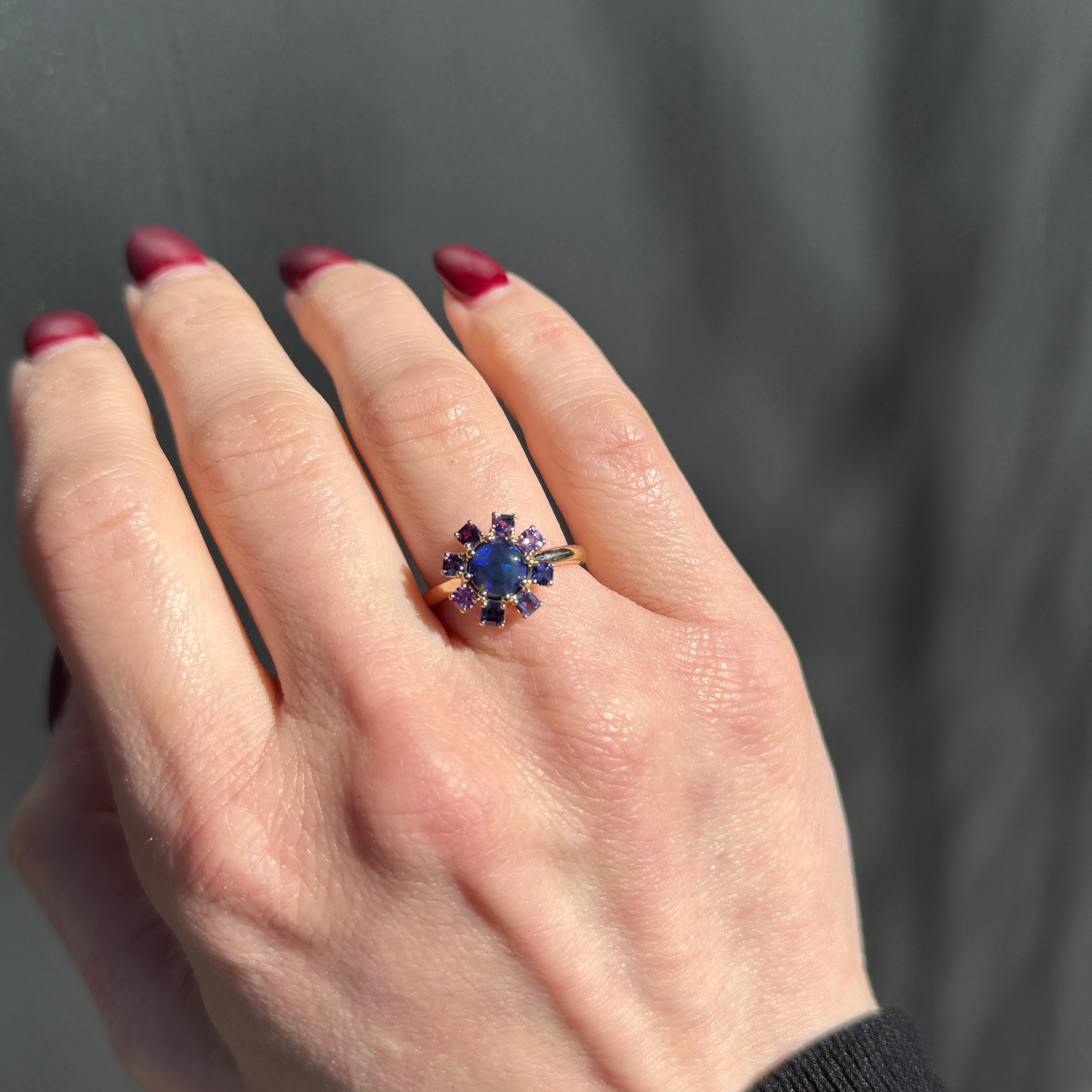 14K yellow gold black opal and sapphire ring. A vibrant burst of color surrounds a mesmerizing black opal in this striking ring. Set in warm 14K yellow gold, the opal glows with flashes of electric blue and green that shift beautifully with the light. Encircling the center stone is a radiant halo of Asscher cut sapphires, arranged like a delicate starburst. Their crisp geometry and shades of violet and pink create a wonderful contrast to the opal’s organic play of color, while the golden prongs add a soft warmth to the overall design. Both modern and whimsical, this ring feels like a tiny galaxy of color on the hand—perfect for someone who loves bold gemstones and distinctive design.