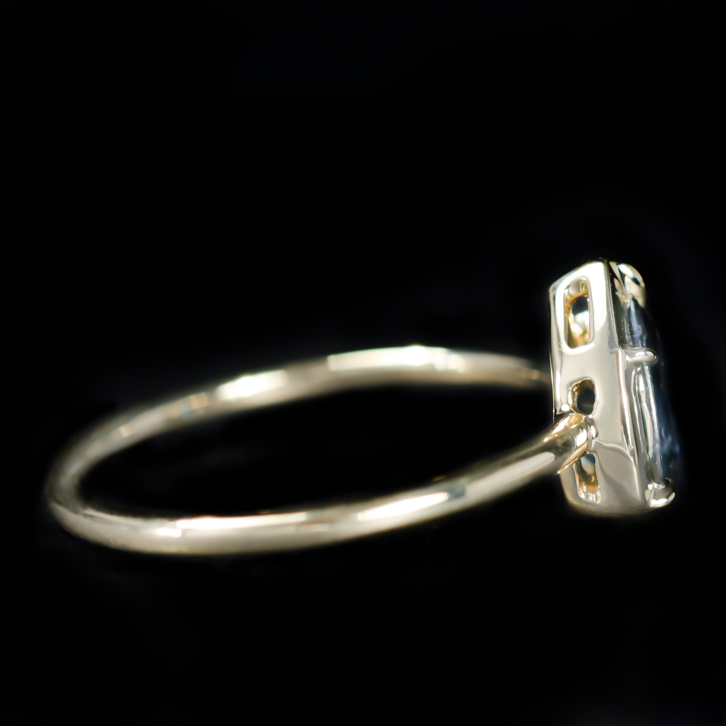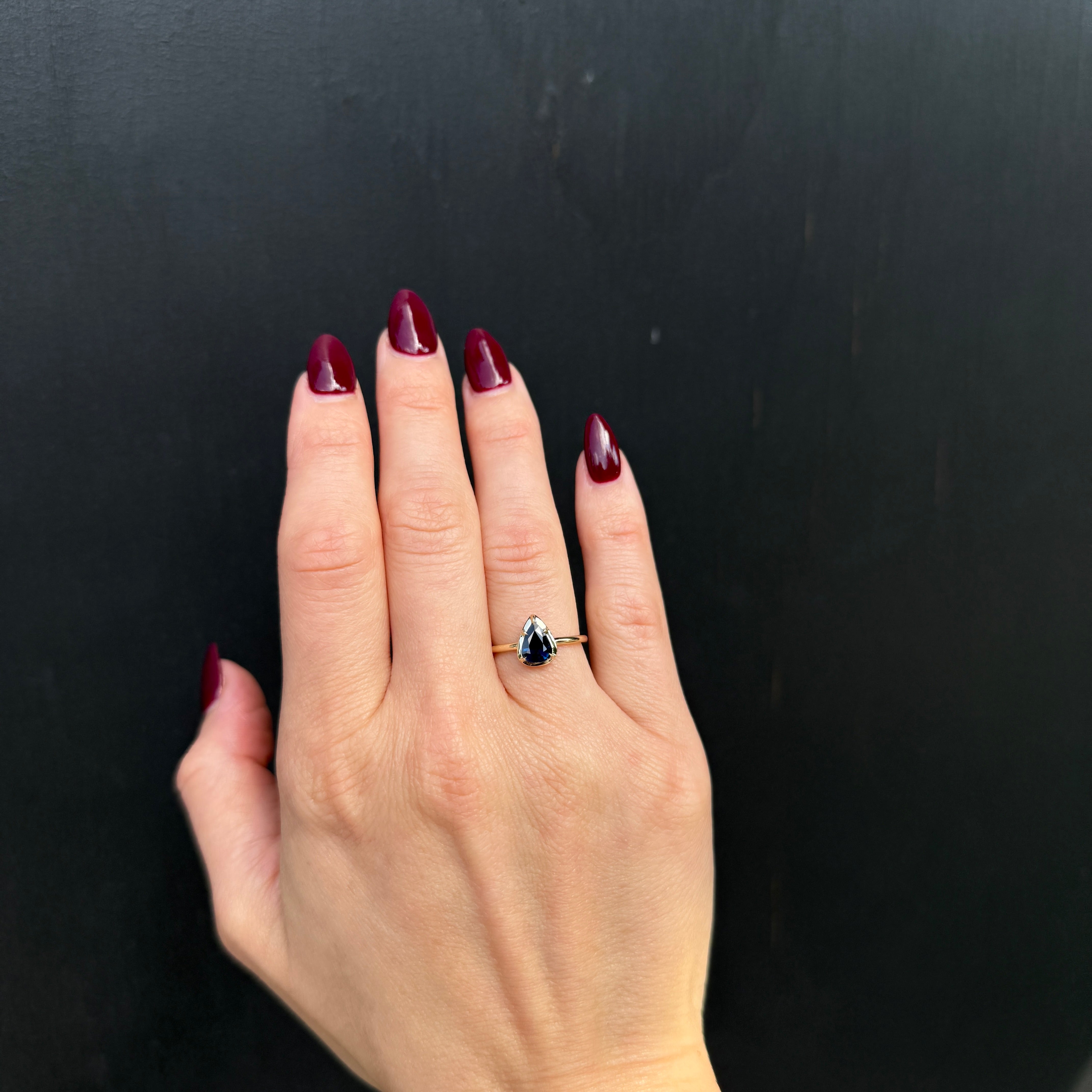 14K yellow gold and sapphire ring. This 14K yellow gold ring centers a pear cut blue sapphire, its rich hue showcased in a classic collet mounting. The smooth, bezel-like frame highlights the sapphire's elegance shape while offering a secure and timeless setting. Finished with a slender gold shank, this ring has a graceful silhouette, allowing the sapphire’s color and form to be the focus of the design.