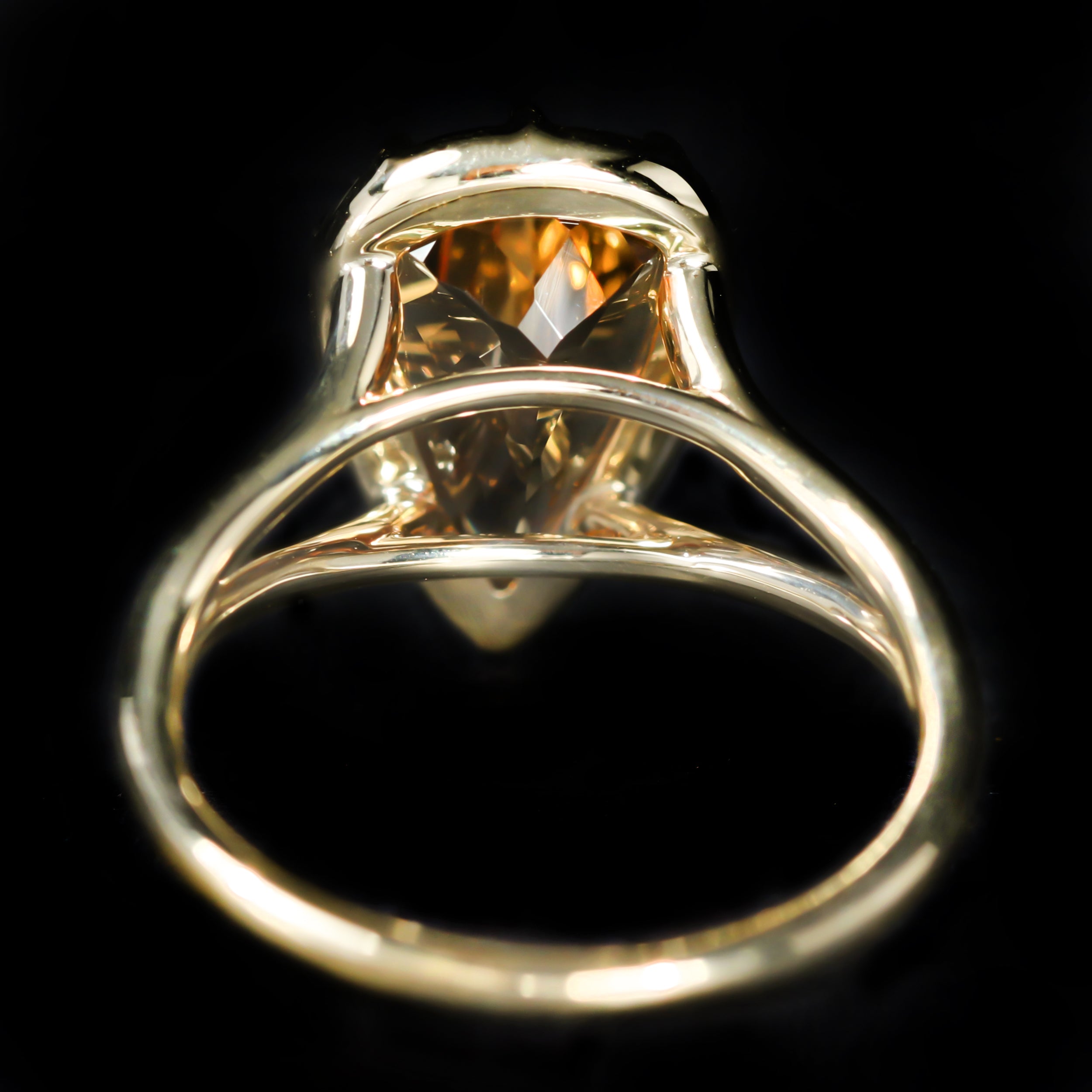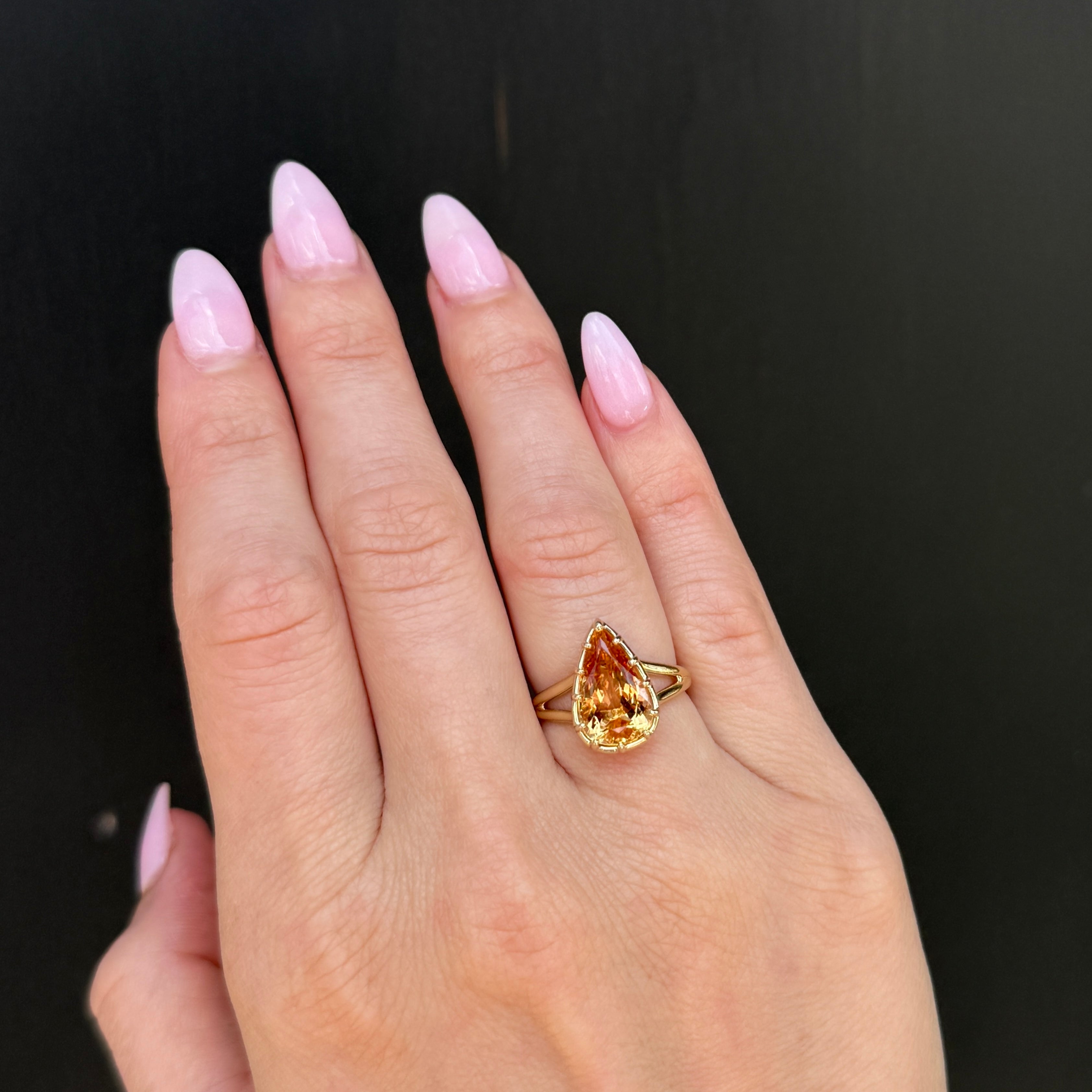 14K yellow gold and imperial topaz ring. This stunning ring showcases a 4.47-carat pear cut Imperial topaz, glowing with rich golden-orange hues and a lively, captivating sparkle. The gem is nestled in an antique-inspired crimped collet setting, echoing the details of Georgian and early Victorian design. The warmth of the topaz pairs beautifully with the soft glow of the yellow gold band, creating a look that feels both elegant and bold. A unique and timeless piece for anyone drawn to rare color and vintage charm.