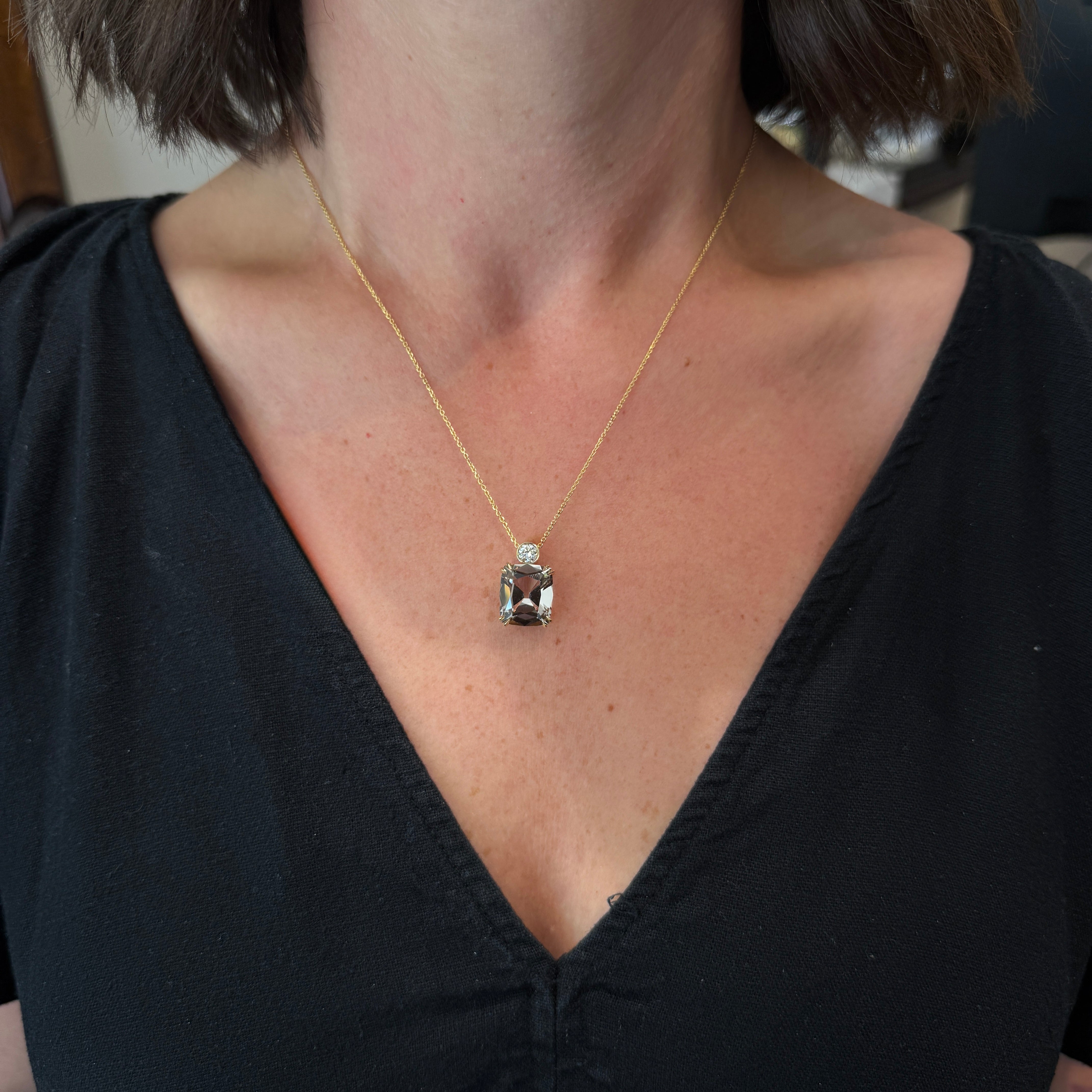 14K yellow gold, smoky quartz, and diamond pendant. This beautiful piece showcases a striking 8.01 carat smoky quartz, custom cut in an elongated cushion shape with antique-style faceting that brings depth and warmth to the gem. Held securely by four split prongs, the quartz is crowned by a bezel-set round brilliant cut diamond. The hidden bail behind the diamond allows for a seamless, elegant presentation on a chain (sold separately).