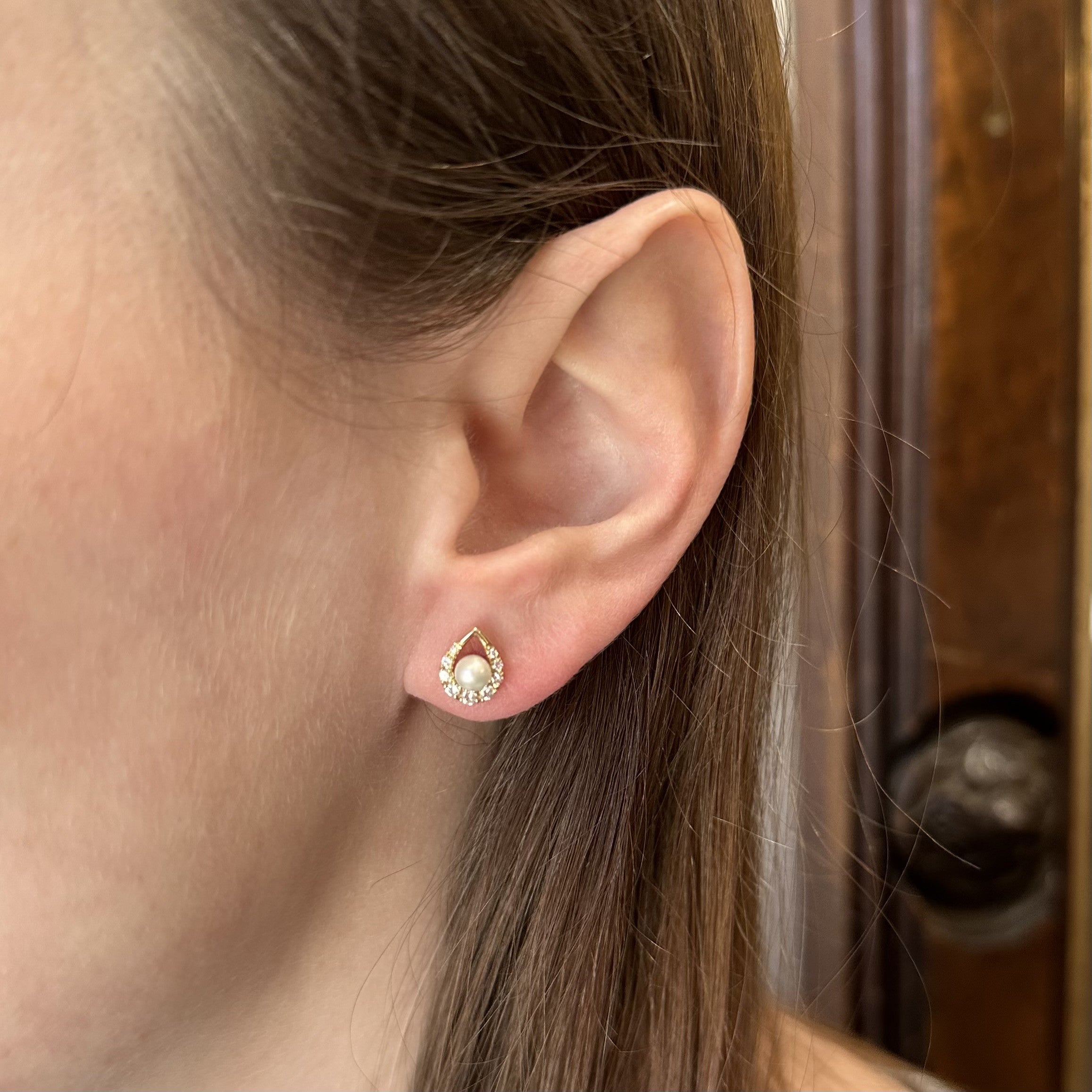 14K yellow gold, pearl, and diamond earrings. At the center of each earring lies a luminous pearl, cocooned within a pear-shaped embrace of warm 14K yellow gold. Each frame is adorned with nine round brilliant cut diamonds, each carefully set to create a captivating sparkle that tapers upwards. The combination results in a beautiful pair of stud earrings that seamlessly transition from day to night. Each stud features a post and friction style back.
