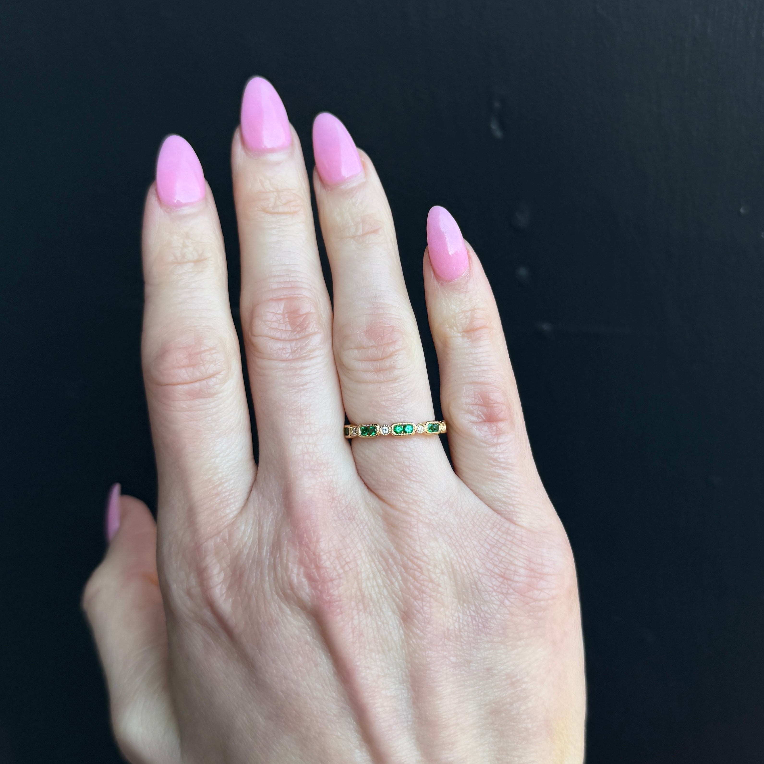 18K yellow gold, emerald, and diamond band. Alternating emeralds and bezel-set diamonds trace the front half of the band in a repeating two-and-one pattern, each setting framed by milgrain edging that catches the light with timeless detail. The rich green of the emeralds creates a striking contrast against the luminous gold, while the bezel settings offer both a sleek, modern profile and secure everyday wear. Whether worn alone or layered with complementary bands, this piece brings a touch of color and craftsmanship to any collection.