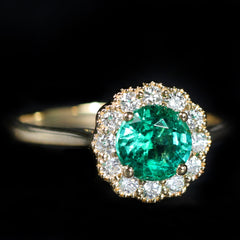 - Center Gem Details: 10 Round Cut Emeralds (approx. 0.24 carat); 4 Round Cut Diamonds (approx. 0.04 carats total weight, SI1 clarity, G/H color)