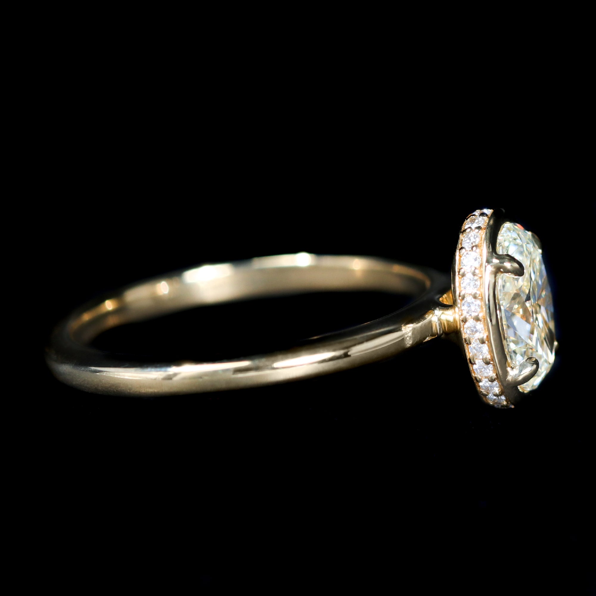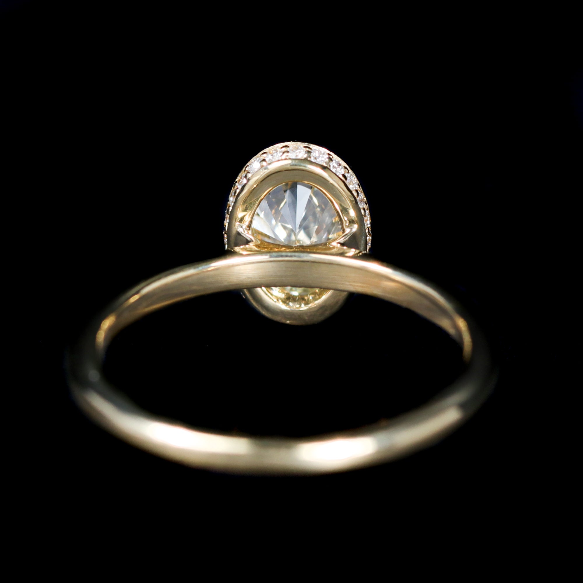 18K yellow gold and diamond ring. A 1.01 carat oval-cut diamond, accompanied by a GIA report, is the focus of this 18K yellow gold engagement ring, offering bright brilliance in a classic solitaire presentation. The center stone is secured by four prongs within an enclosed hidden halo, where accent diamonds reveal themselves subtly from the profile. Elevated above a slender round shank, the setting feels refined and thoughtfully detailed. Clean from the top view with a secret shimmer at the side, the design balances tradition with a modern touch.