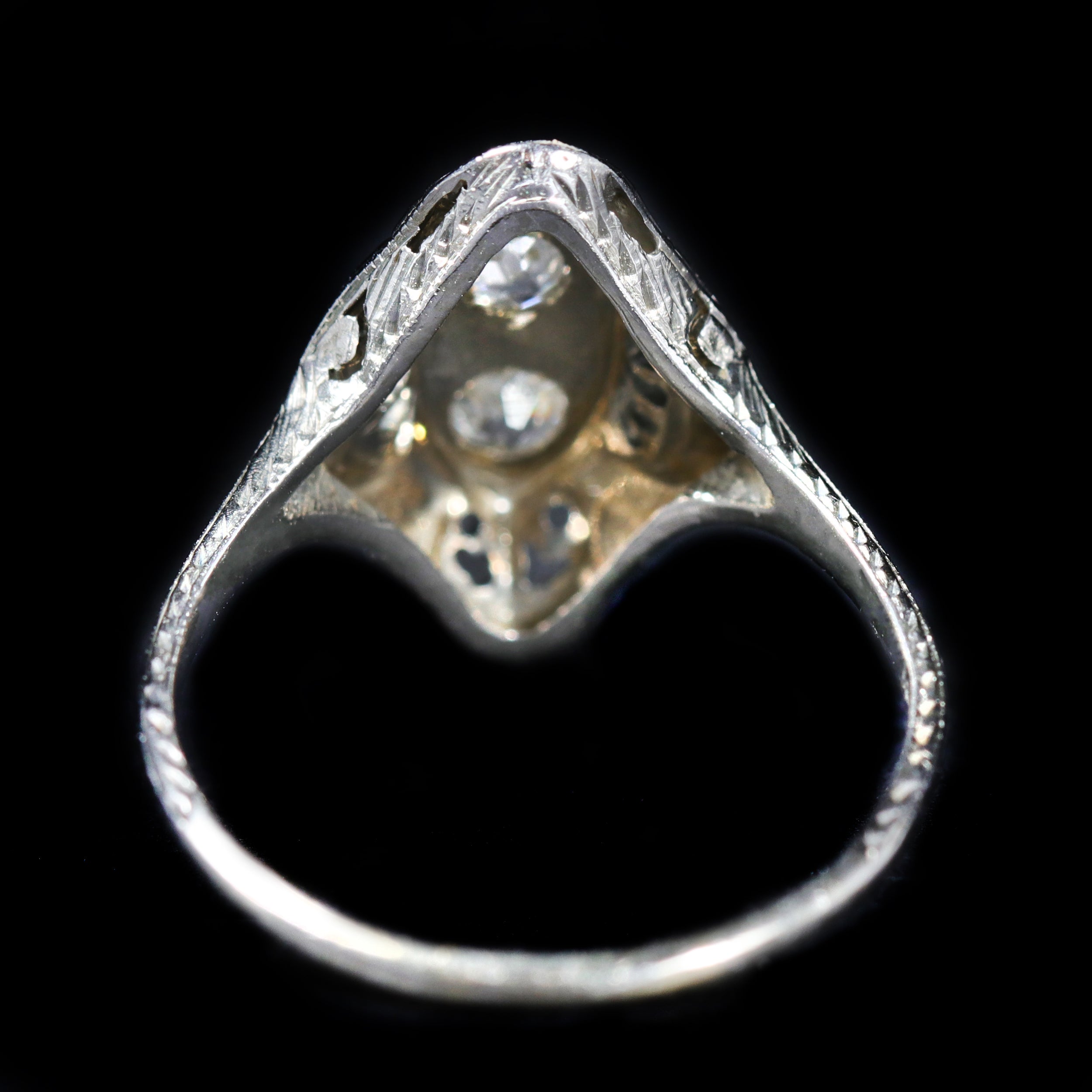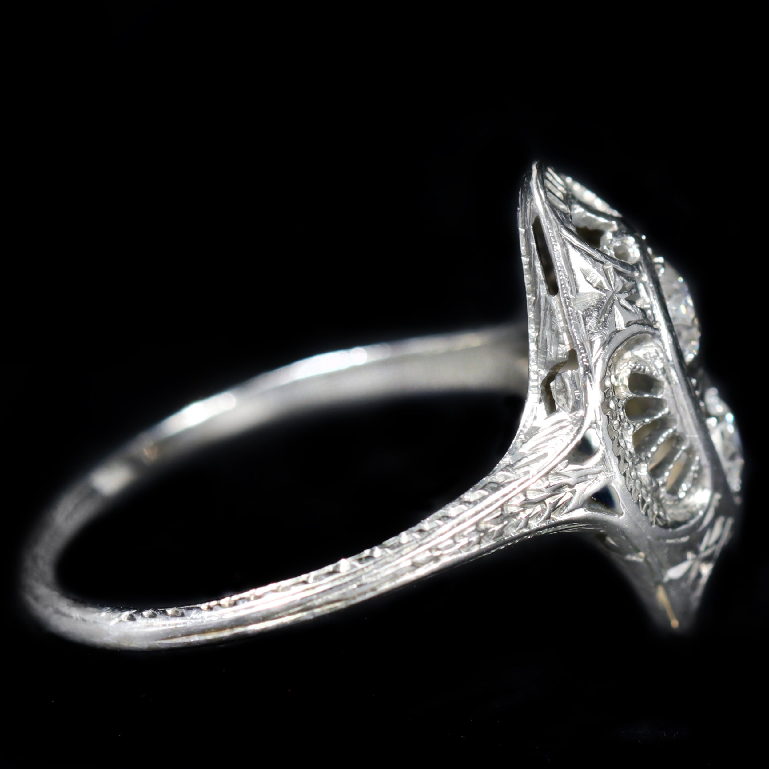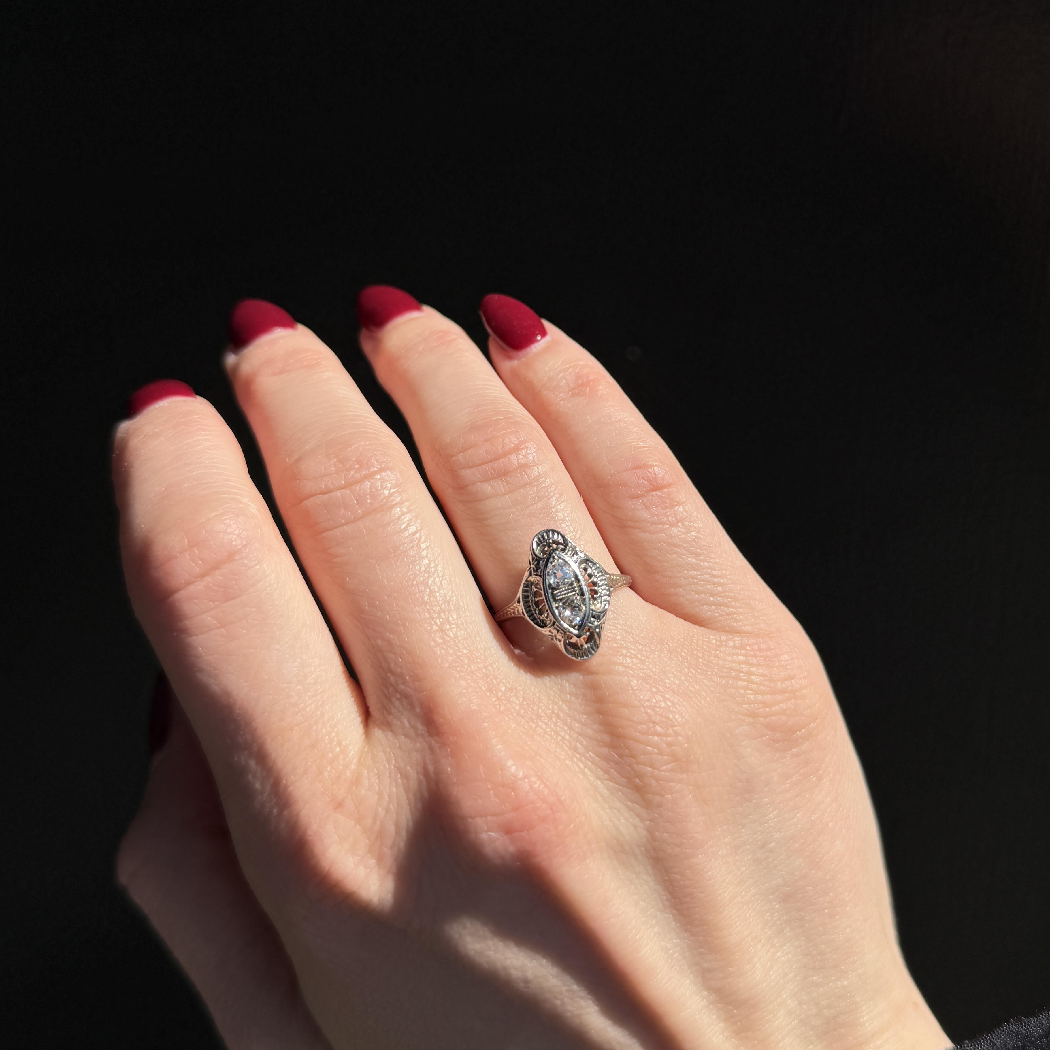 Art Deco 18K white gold and diamond ring. This lovely, low-profile Art Deco dazzler features a striking pierced pattern, creating distinctive shapes, set at the center with two Old Mine cut diamonds. Adding detail, small scrolls adorn the gallery and shoulders of this elegant antique dinner ring.