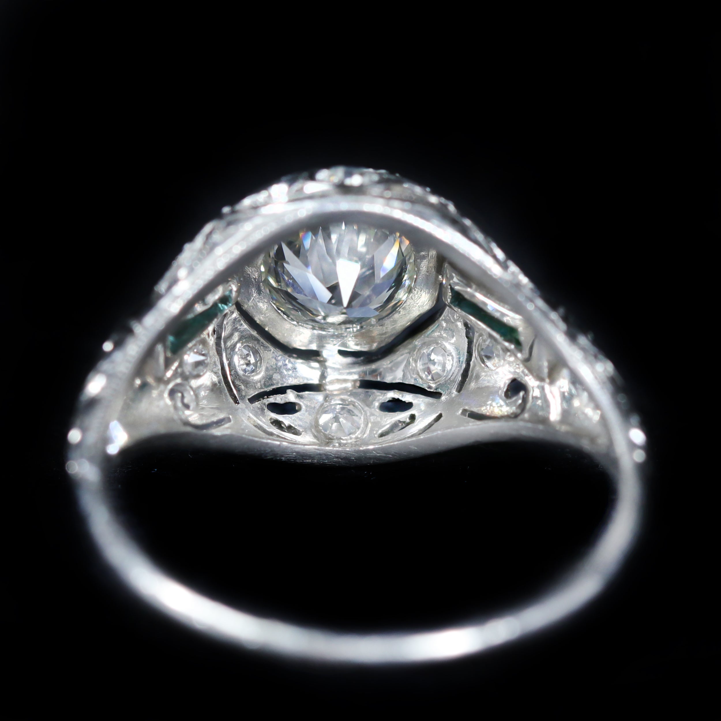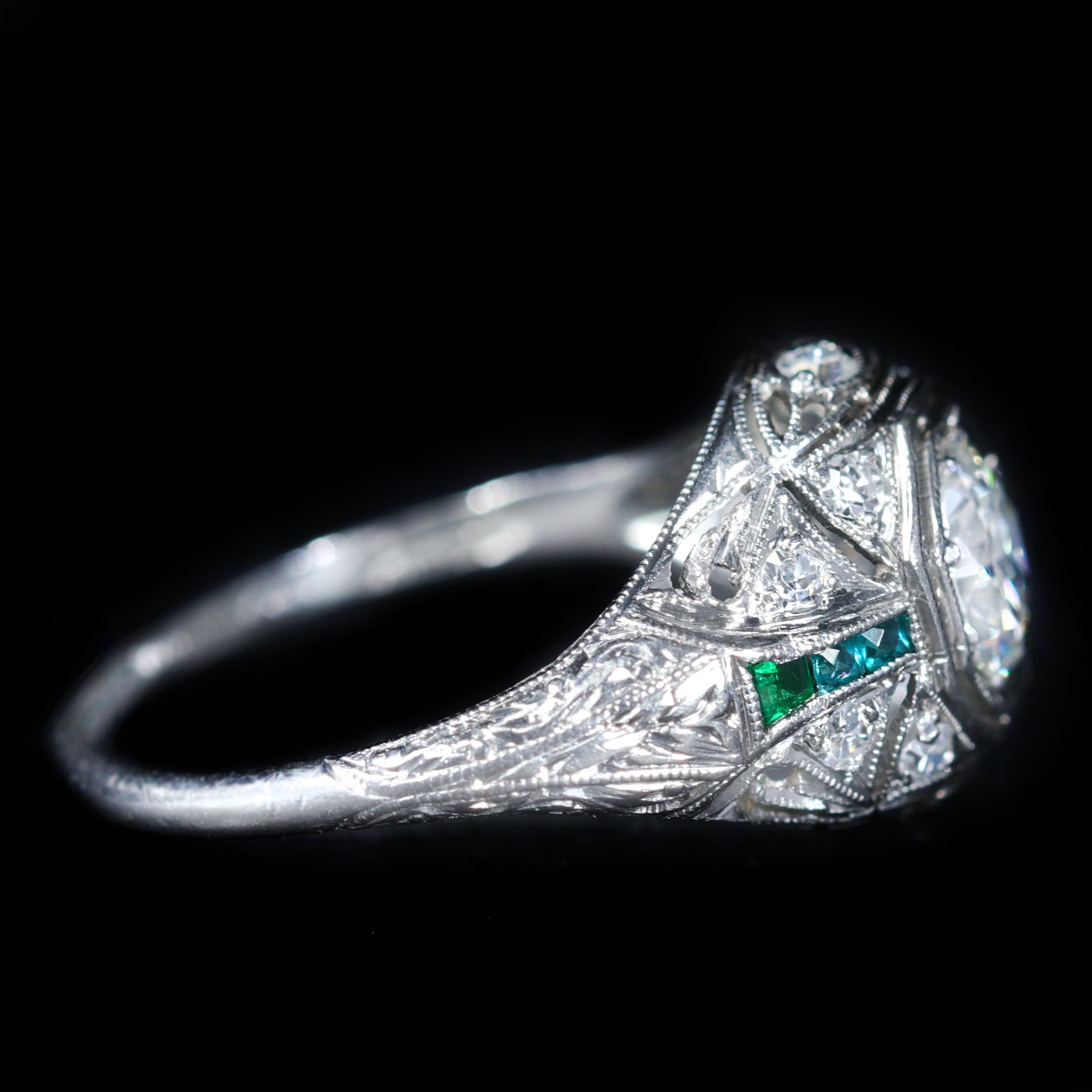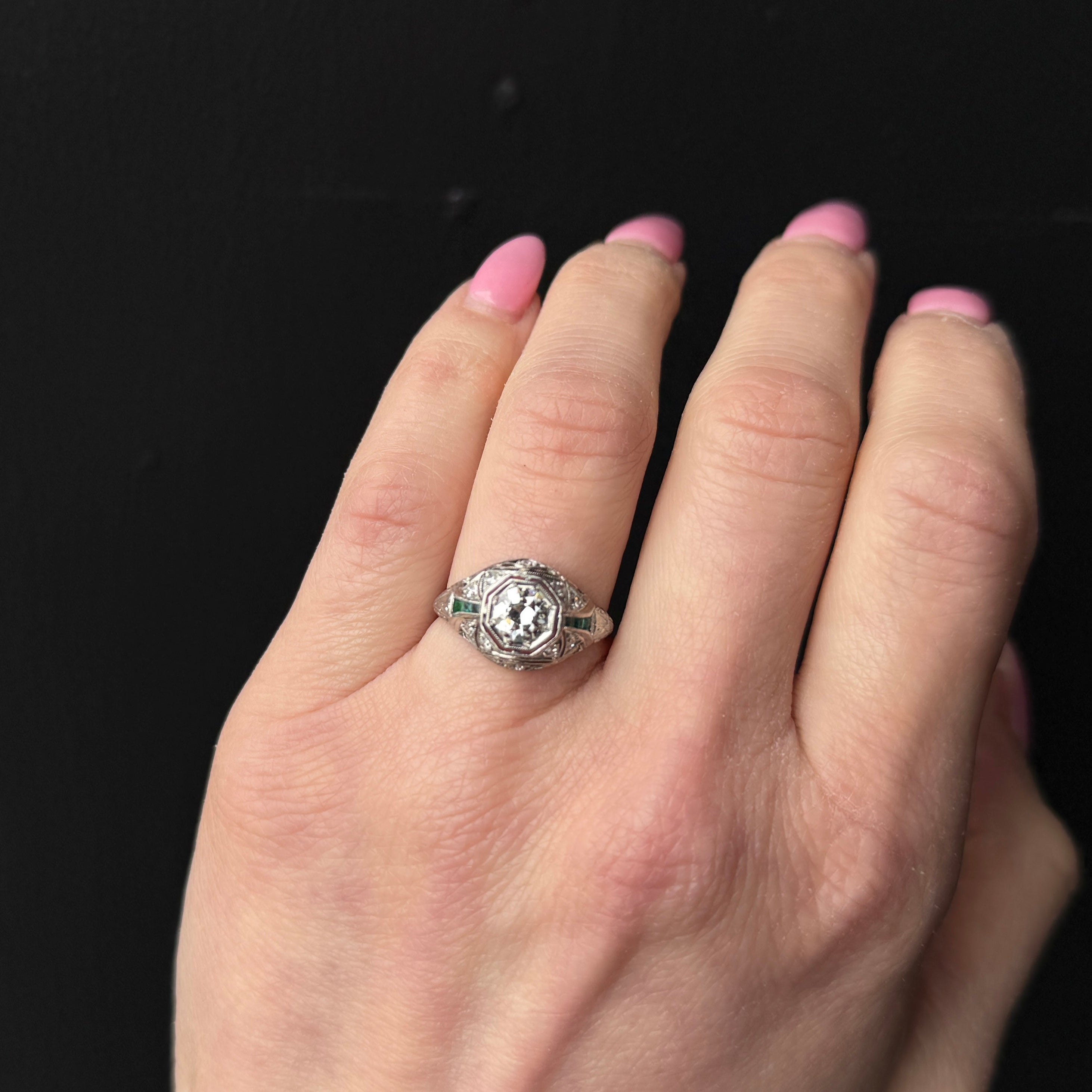 Art Deco platinum and diamond ring. An Old European cut diamond glistens at the center of this Art Deco platinum engagement ring. The domed filigree mounting is set with ten single-cut diamonds that add delicate sparkle, while six French-cut green and blue synthetic stones introduce vivid flashes of color and crisp geometry. The design feels intricate yet balanced. Architectural and luminous, the ring captures the bold elegance and craftsmanship of the Deco era.