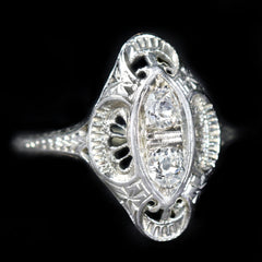 Art Deco 14K white gold diamond filigree brooch. A glittering Old European cut diamond takes center stage in this exquisitely detailed 14K white gold brooch from the 1920's. An elaborate design of open filigree adorns the strikingly elongated design, accented by three sparkling Old Mine cut diamonds on each side, weighing 0.20 carats total weight. This stunning brooch measures approximately 1 7/8 inches long and 5/8 inches wide.