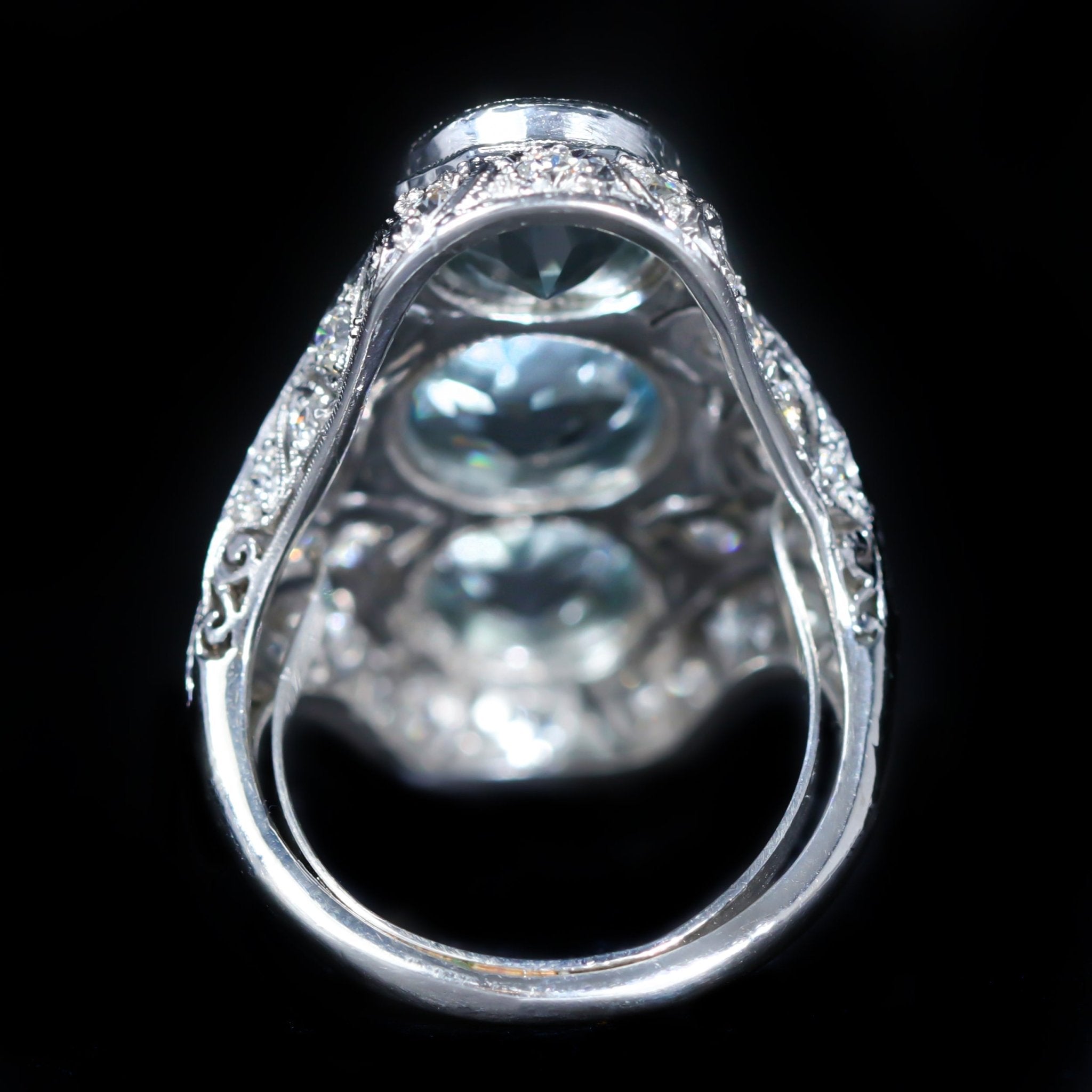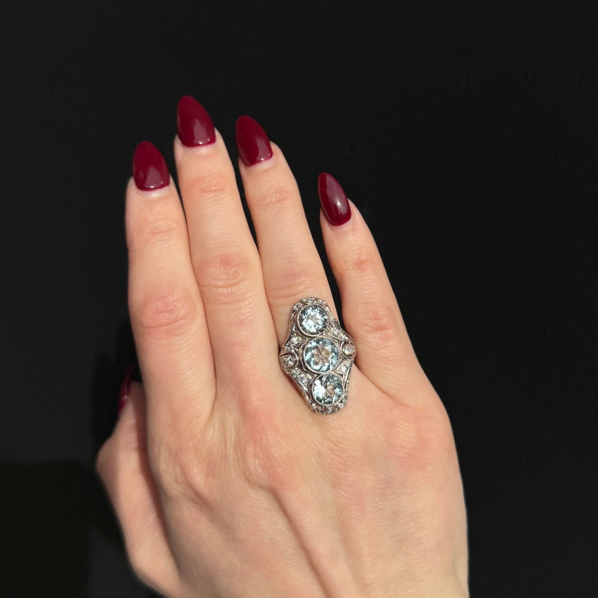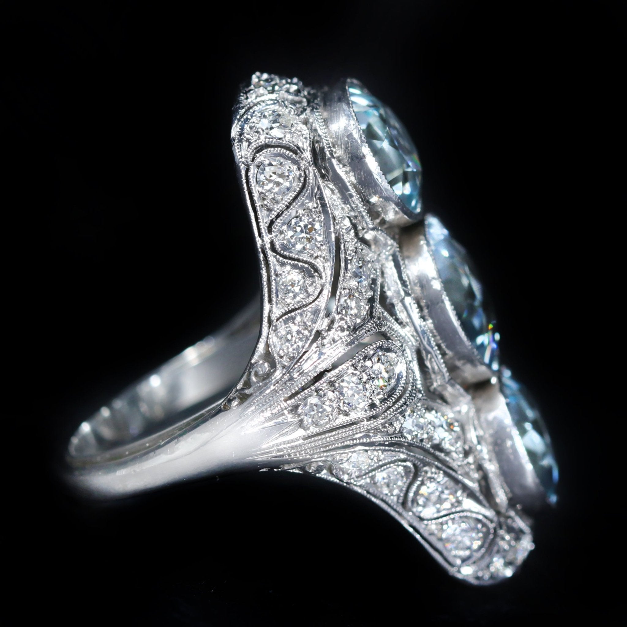 Art Deco platinum, aquamarine, and diamond ring. A showstopping Art Deco dinner ring crafted in platinum, this elongated design features three round cut aquamarines, set vertically to create a dramatic, lengthened silhouette on the finger. The gemstones are beautifully complemented by thirty-six Old European cut diamonds, their antique sparkle woven throughout the intricate filigree mounting. Lavish, architectural, and unmistakably Deco, this ring is a dazzling expression of 1920s glamour.