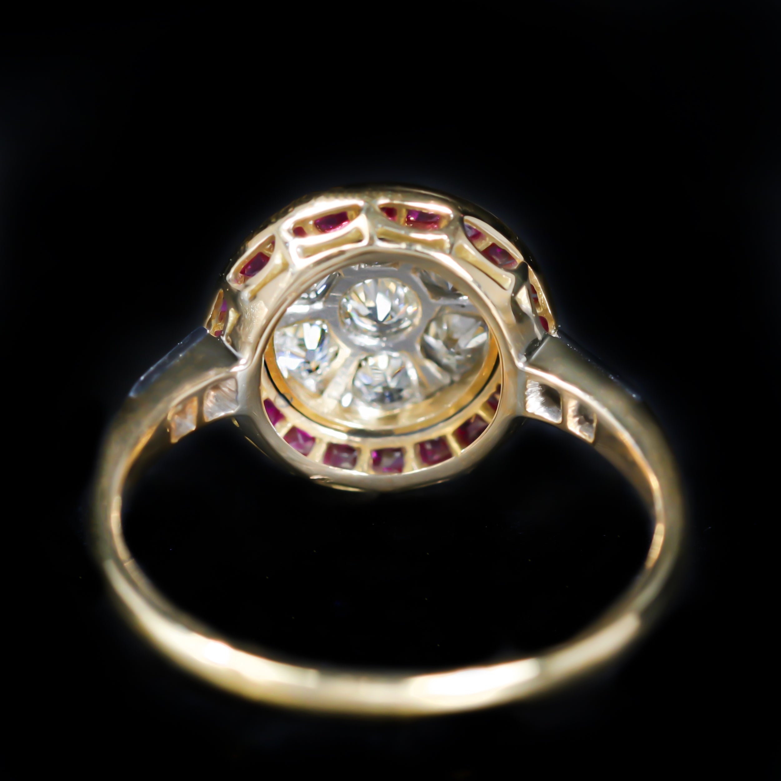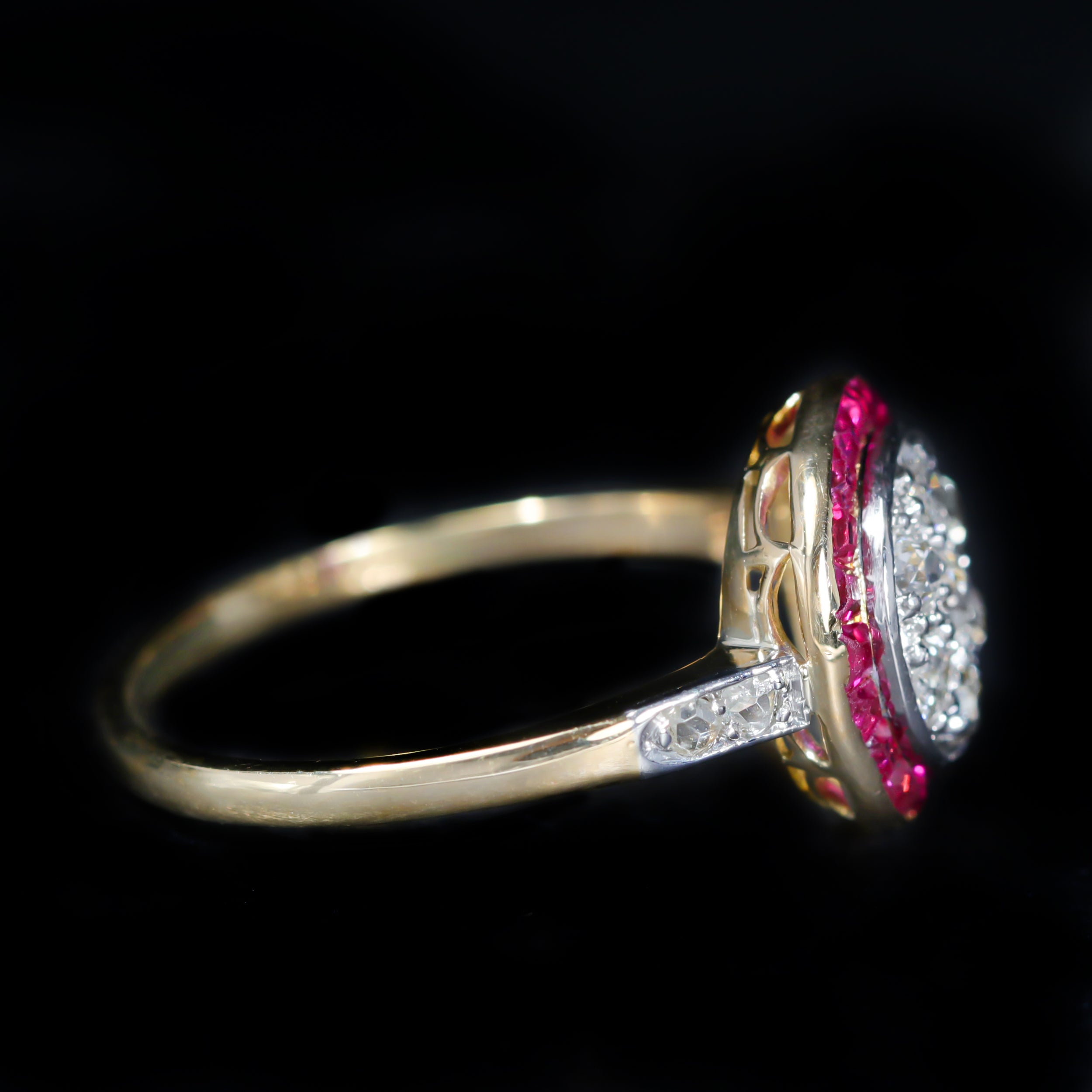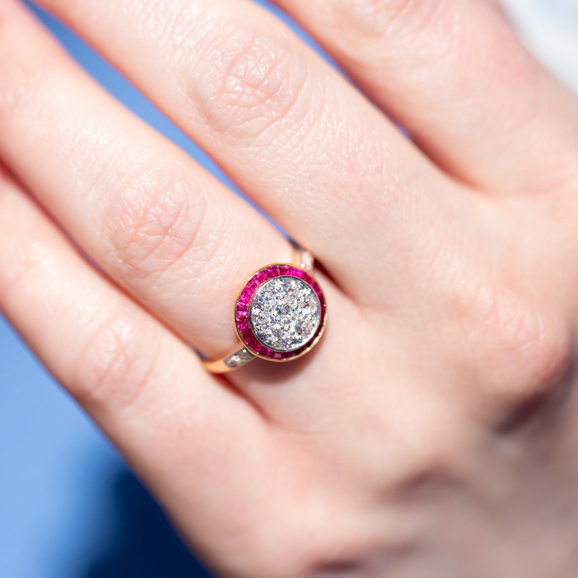 Edwardian platinum, 18K yellow gold, diamond, and ruby ring. A beautifully composed Edwardian ring from the early 1900s, this piece centers a cluster of seven Old Mine cut diamonds. The diamonds are framed by a vivid border of calibre cut rubies, creating a striking contrast of sparkle and color characteristic of the period. Four rose cut diamonds accent the shoulders, adding a subtle antique shimmer and graceful balance to the design. Low-profile and comfortable on the finger, this ring is a refined and richly detailed example of Edwardian craftsmanship.