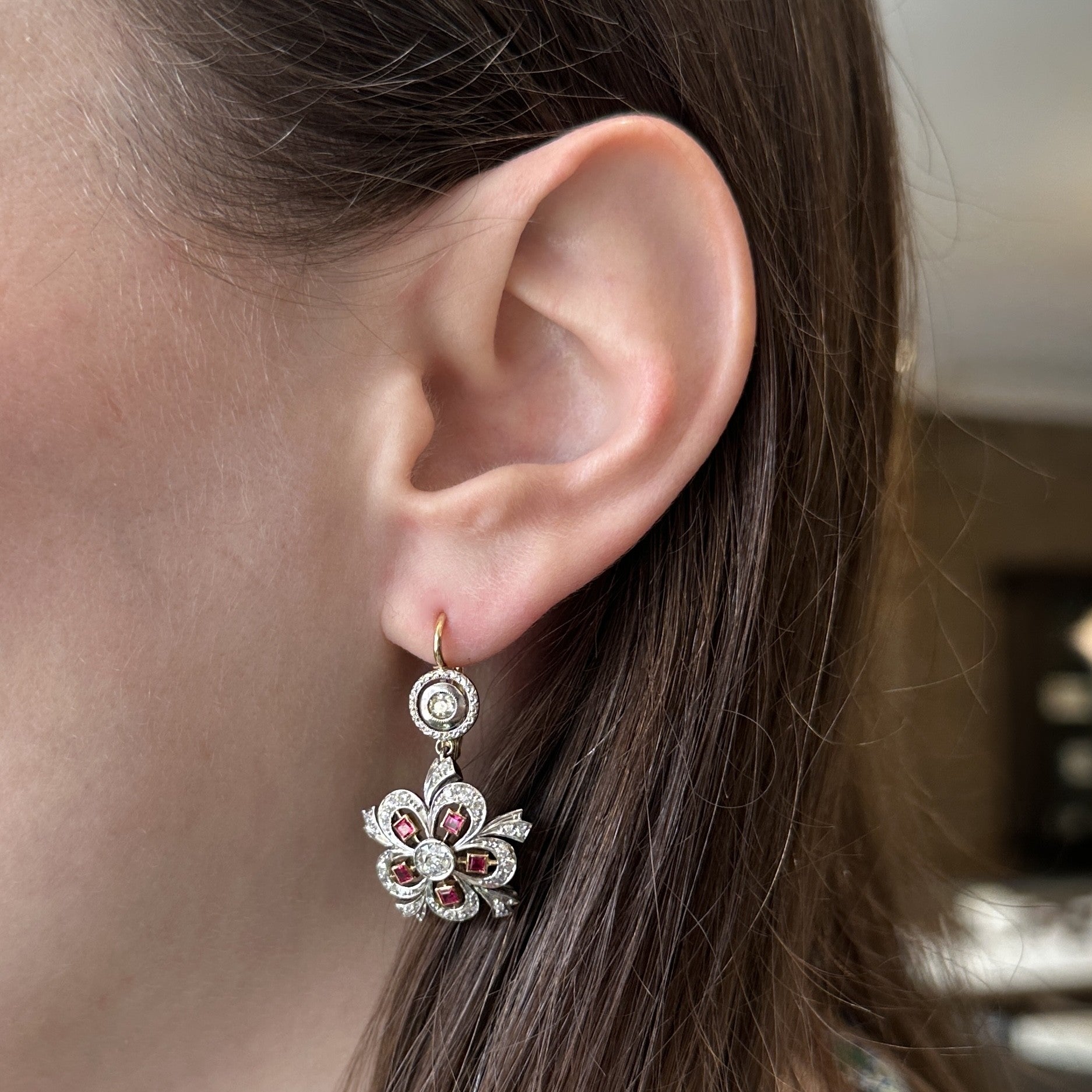 Estate platinum, 18K yelow gold, diamond, and ruby earrings. These elegant estate earrings feature a beautifully balanced floral design set with shimmering Old Mine cut diamonds and vibrant rubies. Crafted in platinum with 18K yellow gold accents, each earring begins with a delicate diamond-set top that gracefully suspends a finely detailed floral motif below. At the center of each flower rests an Old Mine cut diamond, surrounded by rich pink-red rubies that add a lively, eye-catching contrast. Gently curving, diamond-set petals create a sense of movement and light, enhancing the romantic, vintage-inspired feel. Feminine, intricate, and full of character, these earrings make a striking statement while remaining effortlessly timeless.