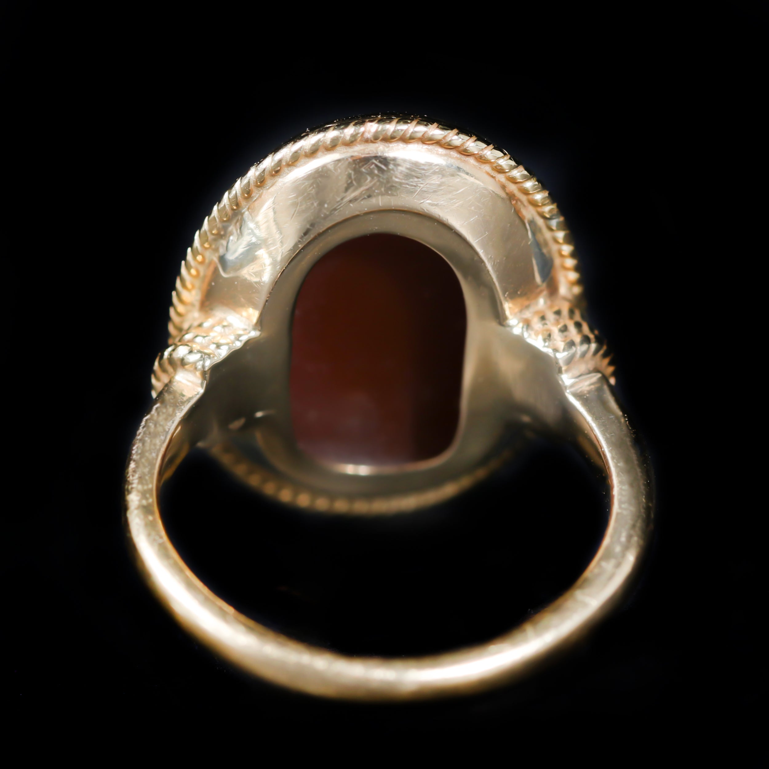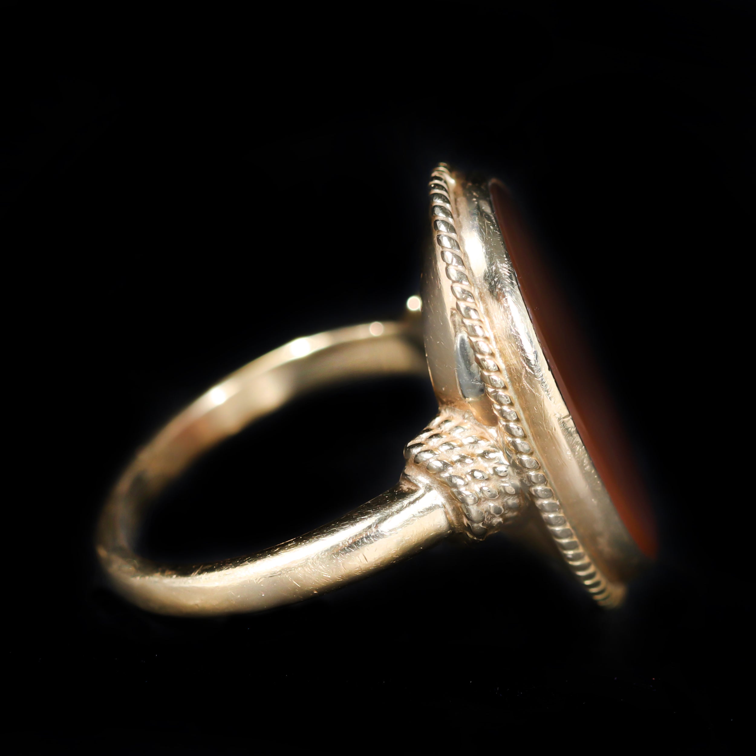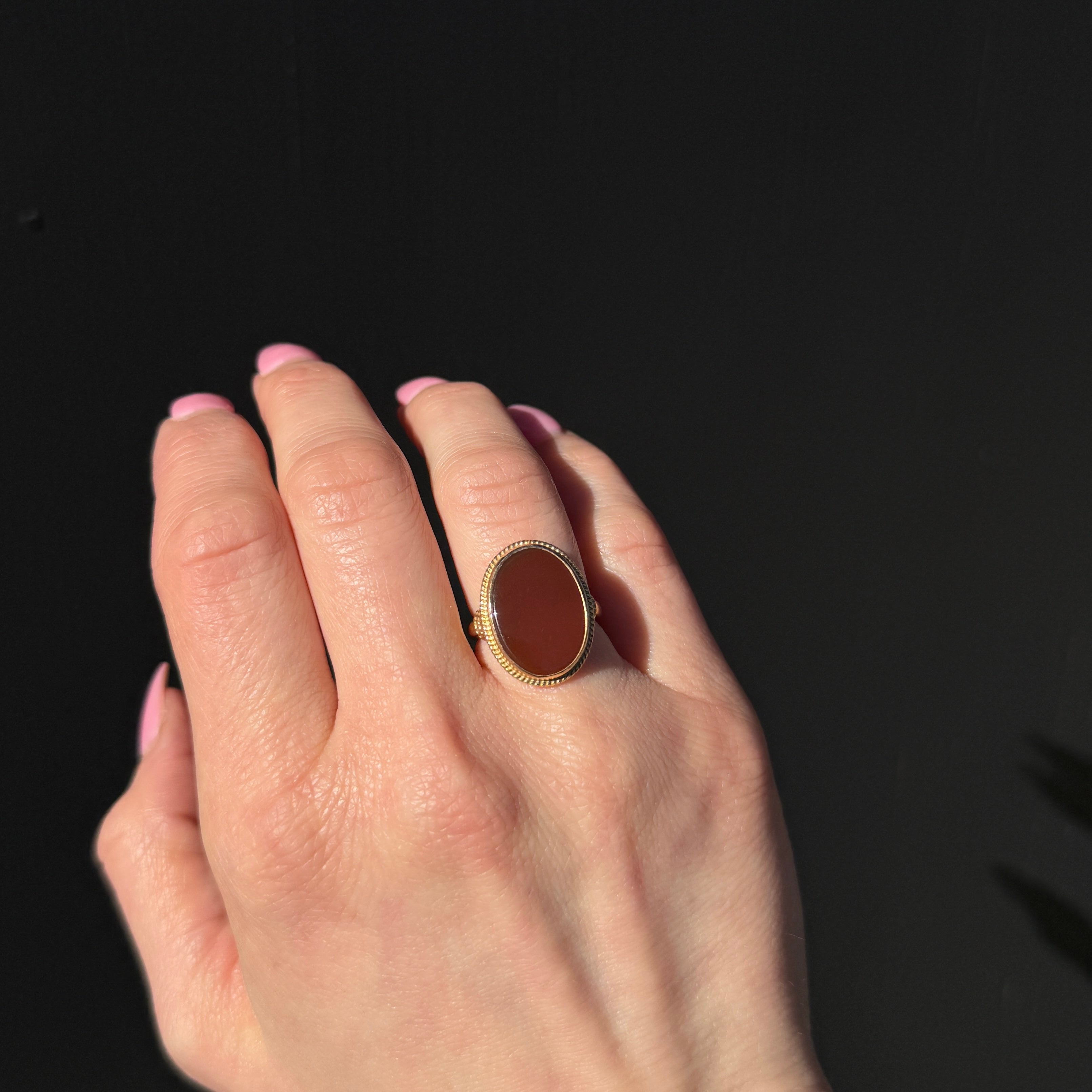 Estate 14K yellow gold carnelian ring. This elegant estate ring is crafted in 14K yellow gold and centers on a smooth oval carnelian with a rich reddish-orange hue. Its warm color glows beautifully against the gold setting, while a finely detailed rope-style border adds subtle texture and frames the stone. The gently tapered band keeps the design balanced, allowing the vibrant center stone to remain the focus. Carnelian has been treasured for thousands of years and was admired by ancient civilizations from Egypt to Rome, where it was often carved into seals and signet rings and believed to bring courage and strength to the wearer. With its glowing, sunlit color symbolizing vitality and warmth, carnelian remains a beloved gemstone today.