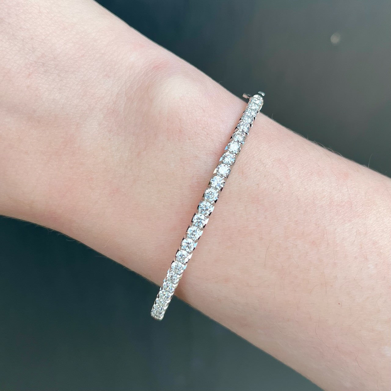 Platinum and diamond bracelet. This platinum hinged bangle bracelet features approximately 1.96 carats of round brilliant cut diamonds, set across the top half for a graceful arc of light. Each diamond is meticulously placed to maximize brilliance and balance. The sleek silhouette is secured with a tongue closure and safety latch for comfort and peace of mind.