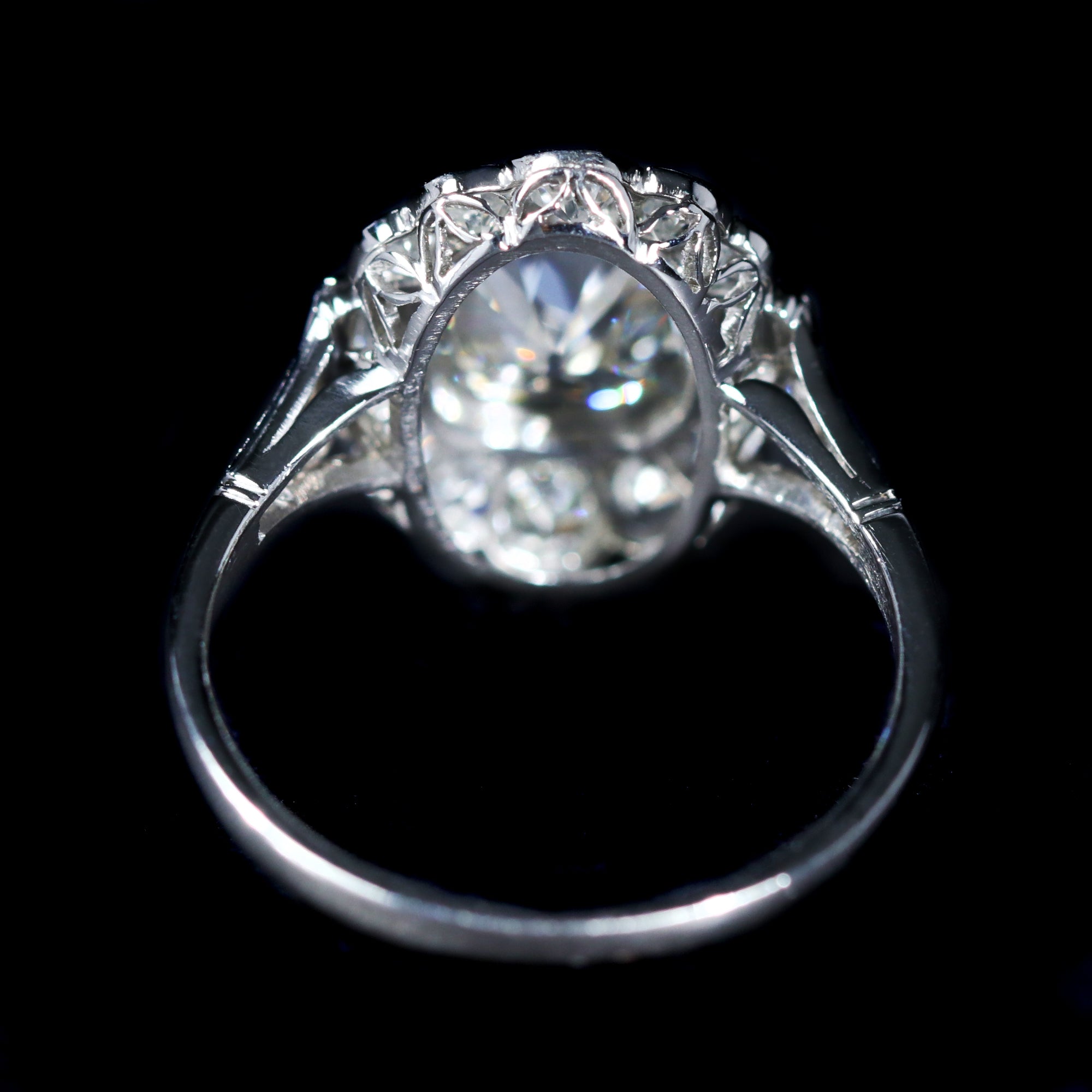 Platinum and diamond ring. A 1.51 carat cushion-cut diamond, accompanied by a GIA report, sits bezel-set at the center of this platinum engagement ring, offering broad brilliance and softly rounded corners. Two bezel-set baguette diamonds flank the center stone, while a scalloped border of single-cut diamonds surrounds it, bringing the total weight to approximately 2.31 carats. The side gallery is shaped in a graceful tulip motif, adding dimension and a subtle romantic flourish. Structured yet ornate, the design balances clean geometry with delicate detail.