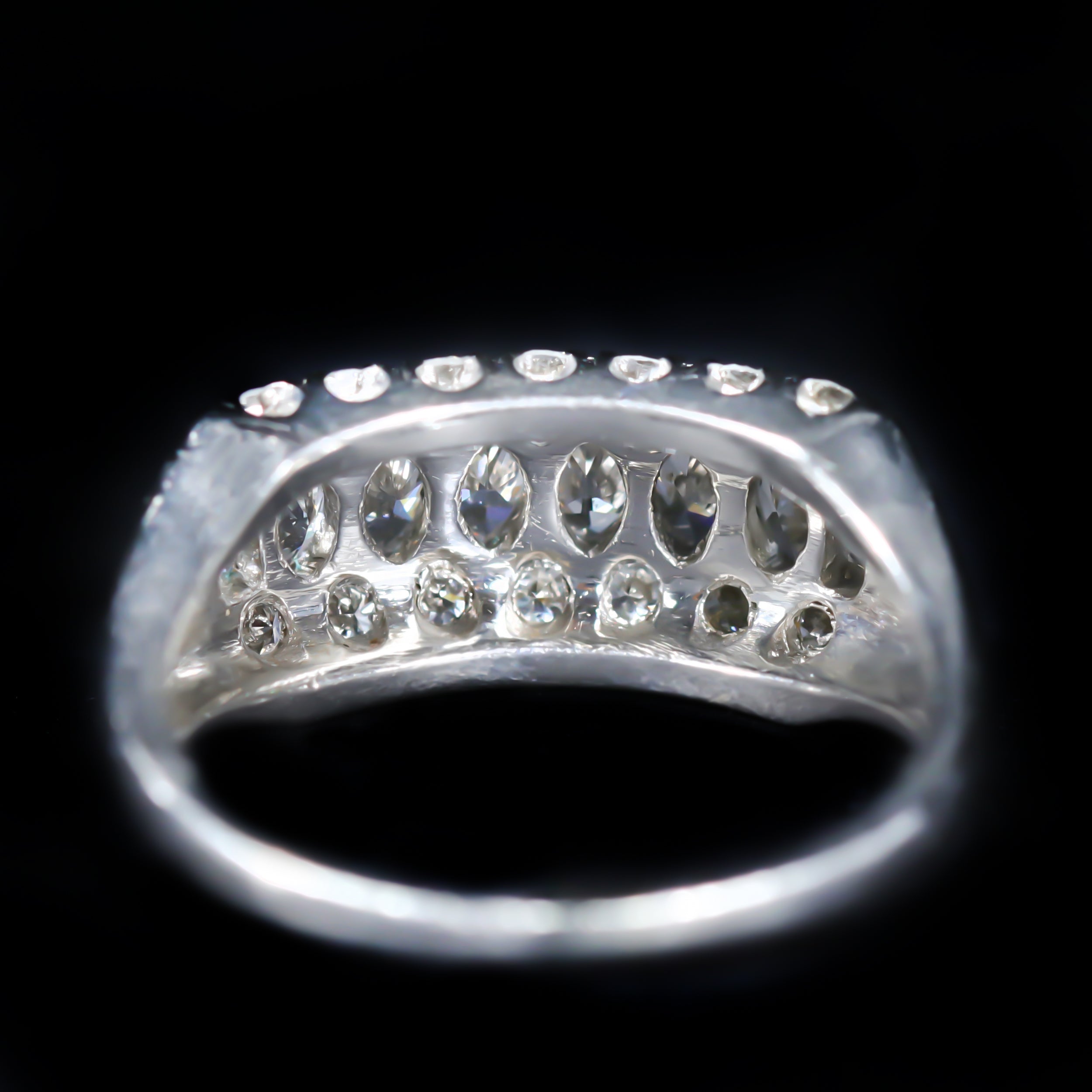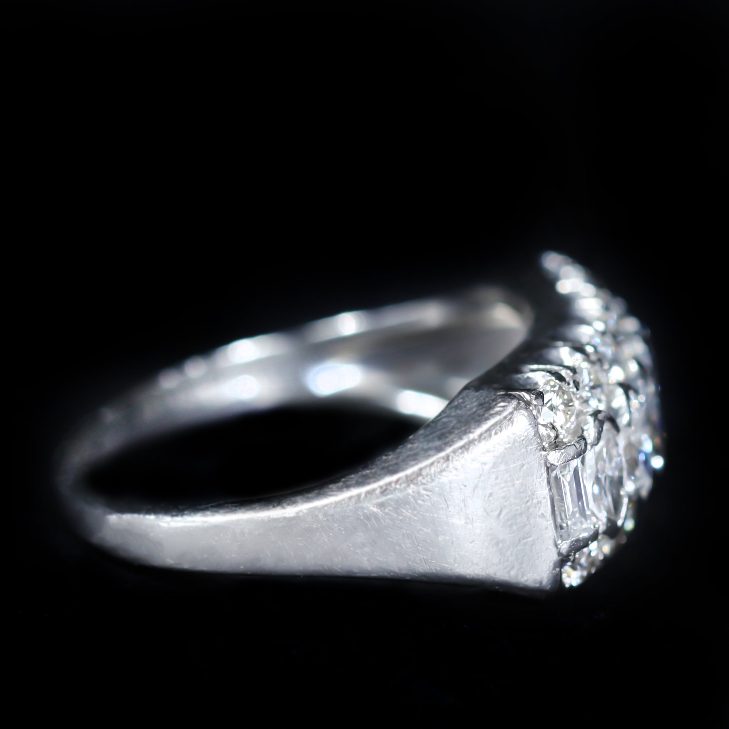 Retro platinum and diamond ring. A striking design from the 1940s, this platinum ring features a central row of marquise cut diamonds framed above and below by round brilliant cut diamonds, with a single baguette cut diamond accenting each outer edge. The combination of shapes creates a rhythmic sparkle characteristic of mid-century glamour. Distinctive yet wearable, it’s a beautiful reflection of the bold, architectural style that defined 1940s jewelry design.