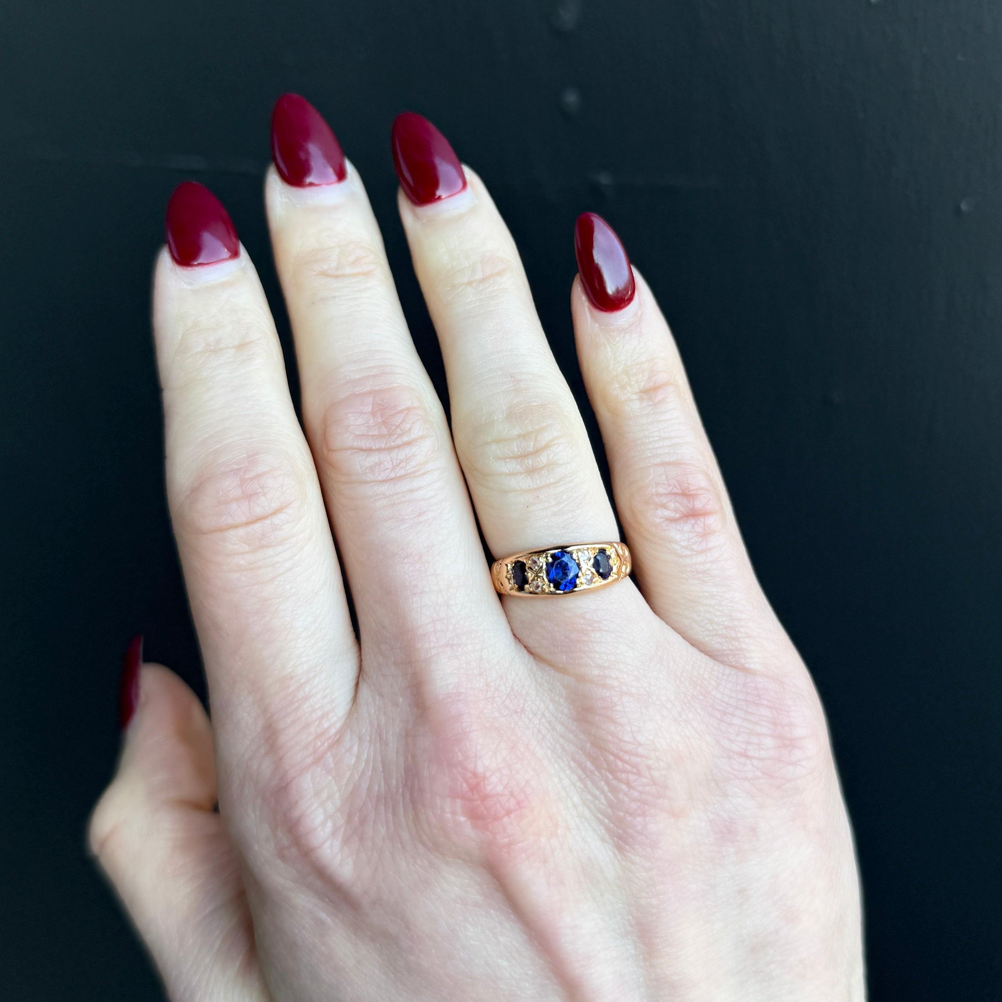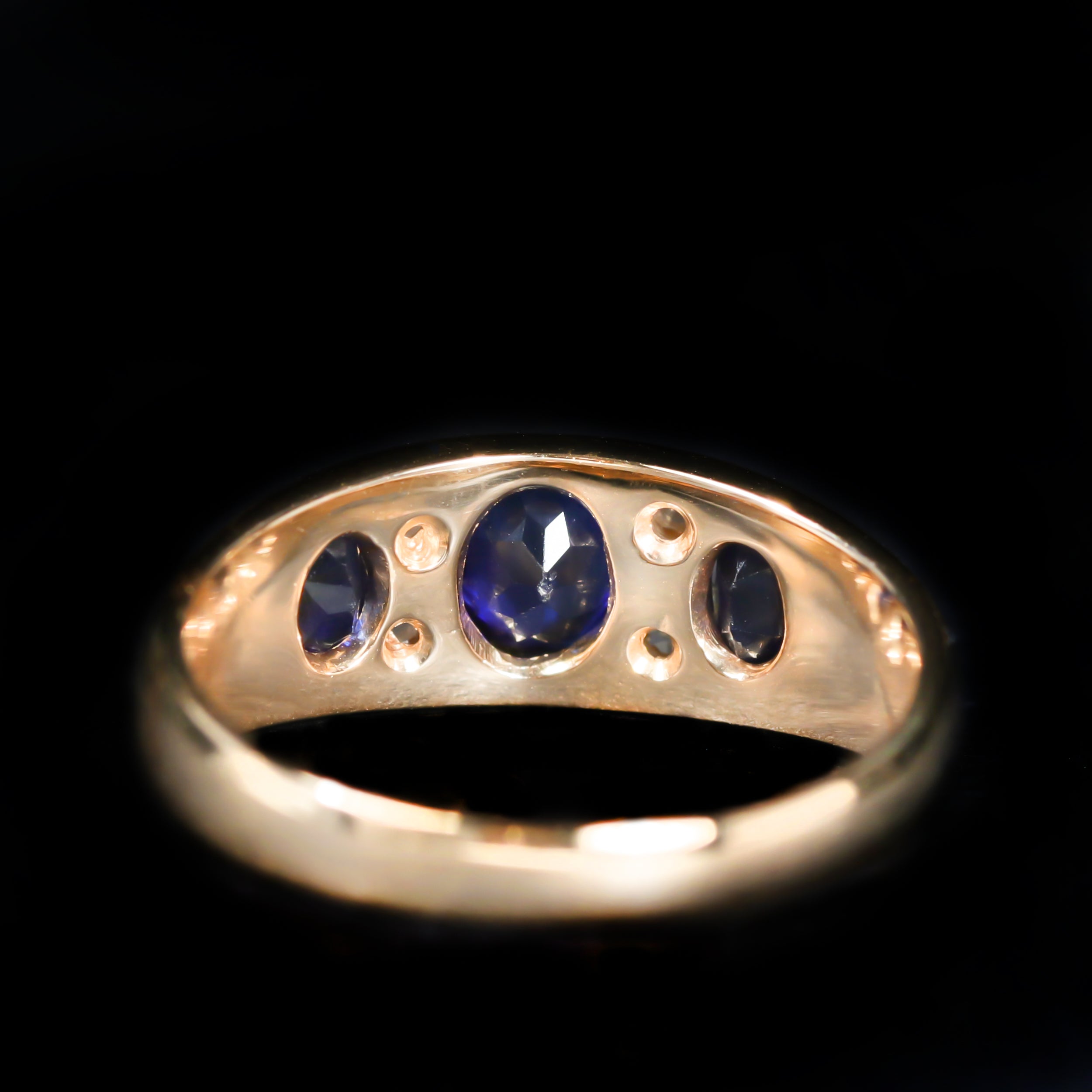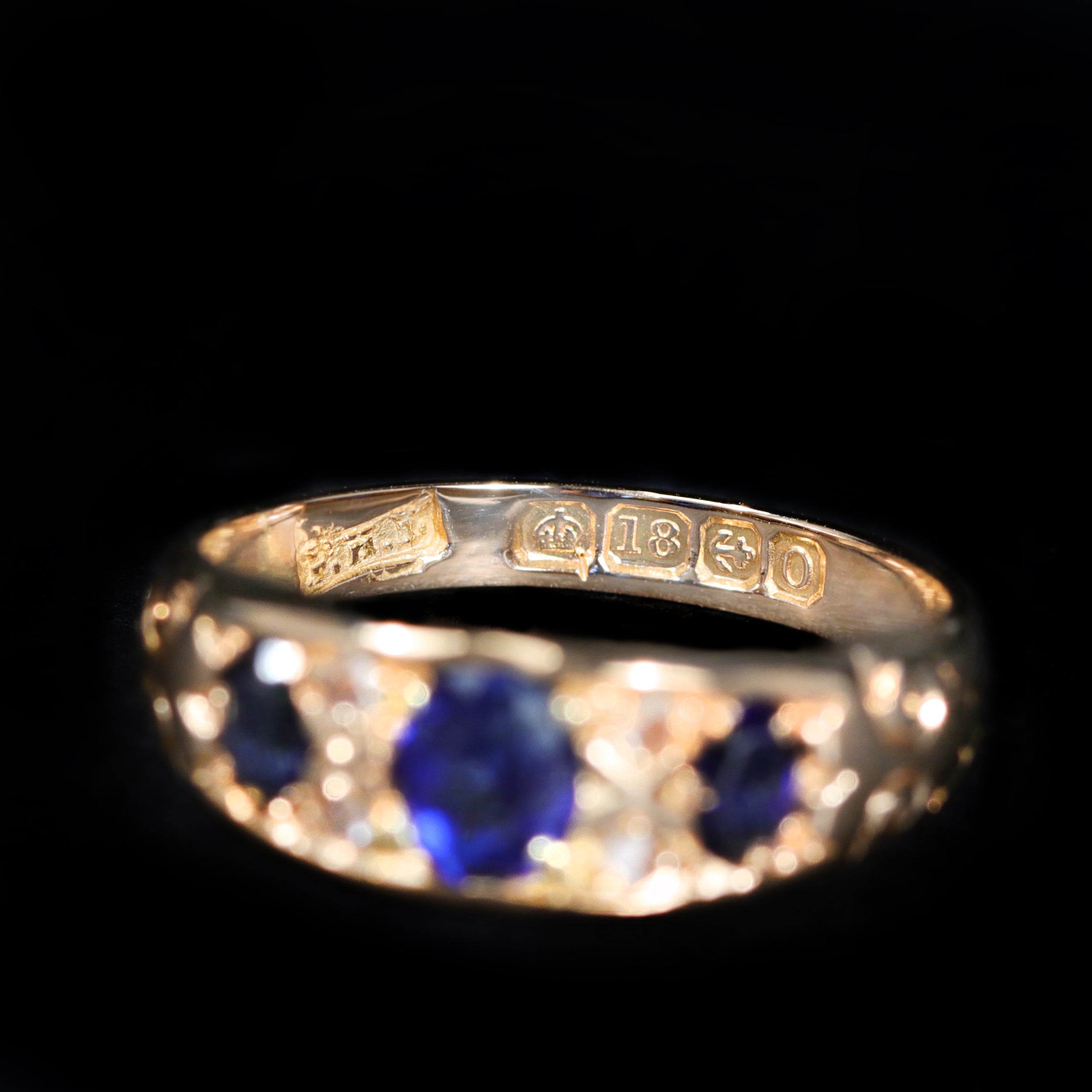 Victorian 18K yellow gold, sapphire, and diamond ring. Three oval cut sapphires line the center of this Victorian ring, glowing in rich, velvety blue. Nestled between them are four rose cut diamonds, their soft light adding gentle contrast to the saturated blue of the sapphires. Crafted in 18K yellow gold, the setting has the warmth and presence characteristic of mid-19th century design. Hallmarks indicate the ring was made in Birmingham, England in 1863.