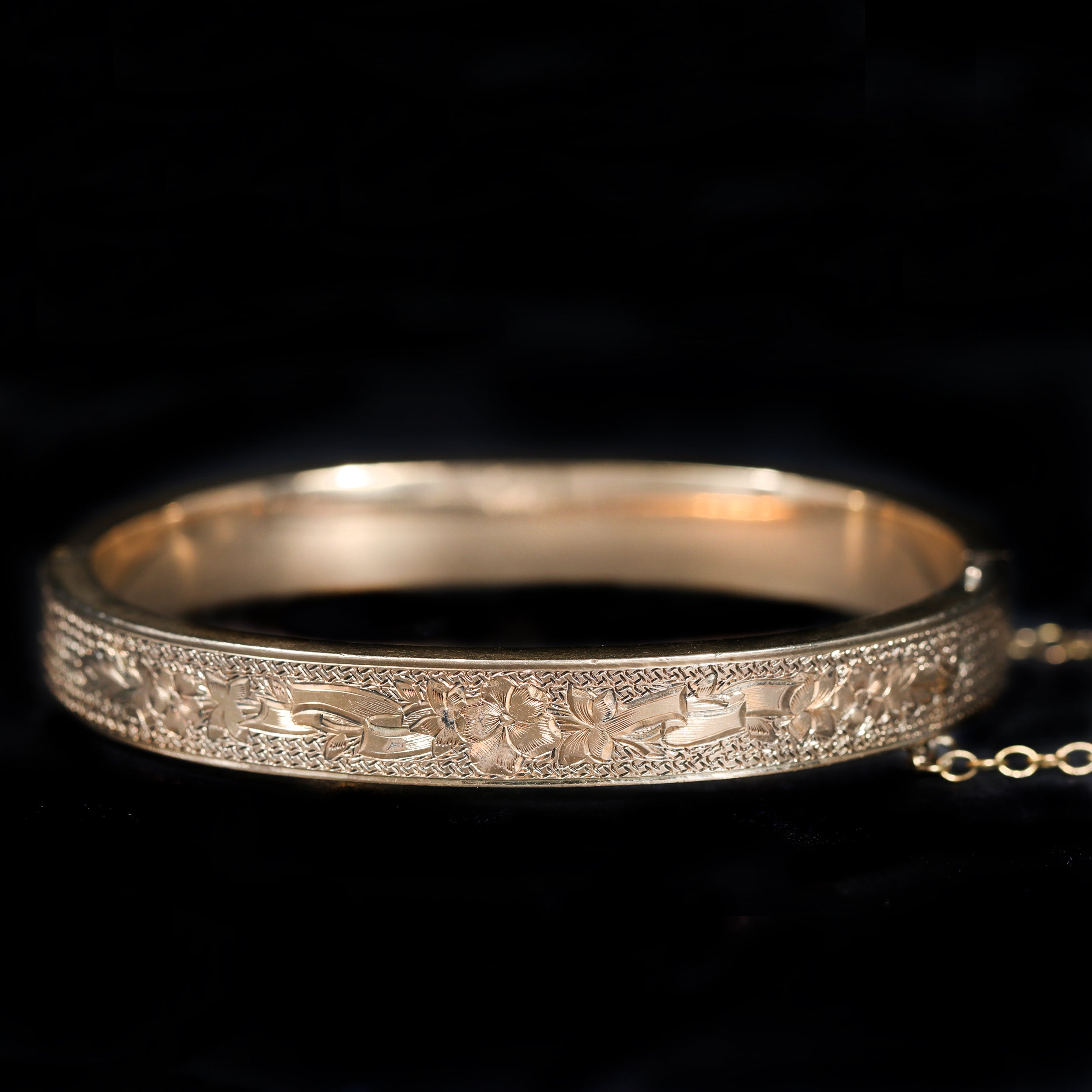 Victorian 10K yellow gold bracelet. A beautifully engraved Victorian bangle, designed to comfortably fit a 6.5-inch wrist. The hinged design is adorned with intricate floral engravings and flowing patterns that catch the light across the surface. An added safety chain provides extra security while preserving the bracelet’s graceful silhouette. Classic and feminine, it’s a timeless piece with lovely detail throughout.
