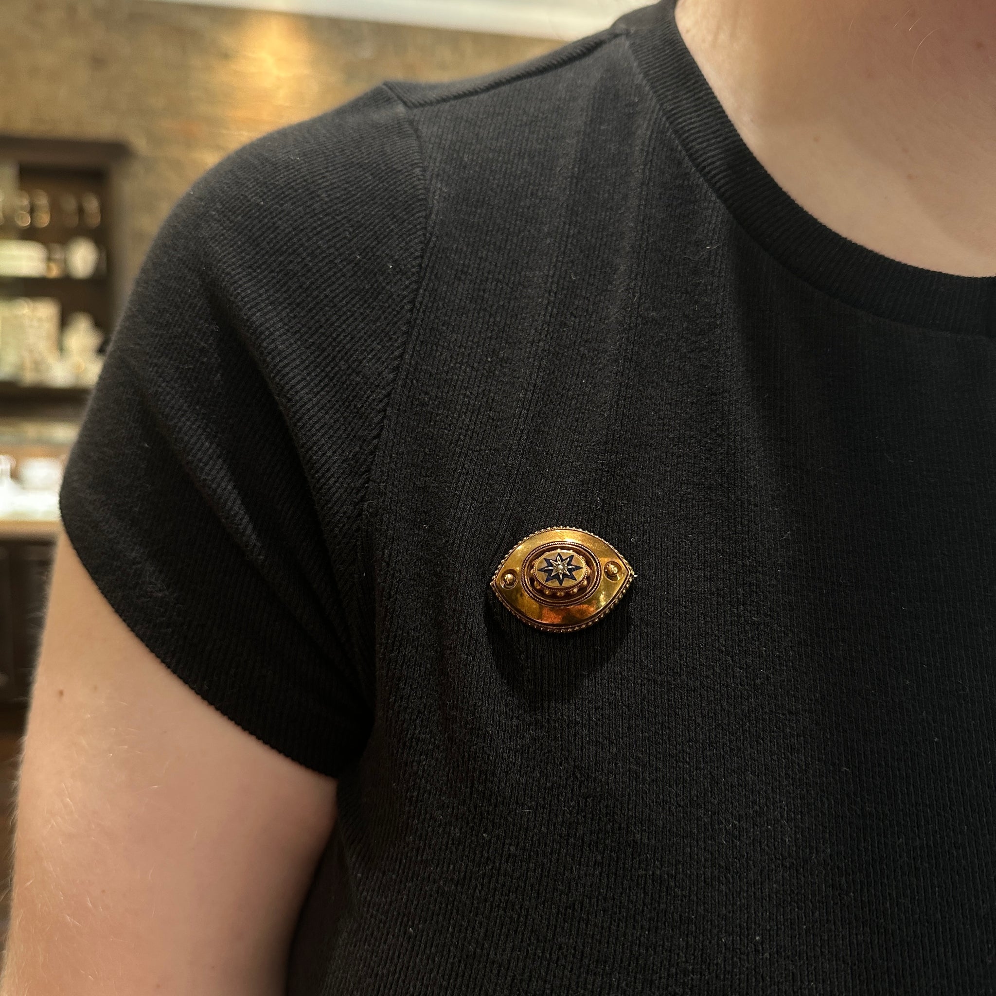 Victorian 14K yellow gold, pearl, and enamel brooch locket. This Victorian era brooch is a striking example of the era's sentimentality and exquisite detail. A luminous seed pearl is framed at the center by a vivid blue enamel starburst motif. The brooch features rounded, circular accents on each side and a beautifully burnished gold finish that adds warmth. On the reverse, a locket compartment holds its original blue fabric backing, accompanied by the brooch’s classic pin mechanism.