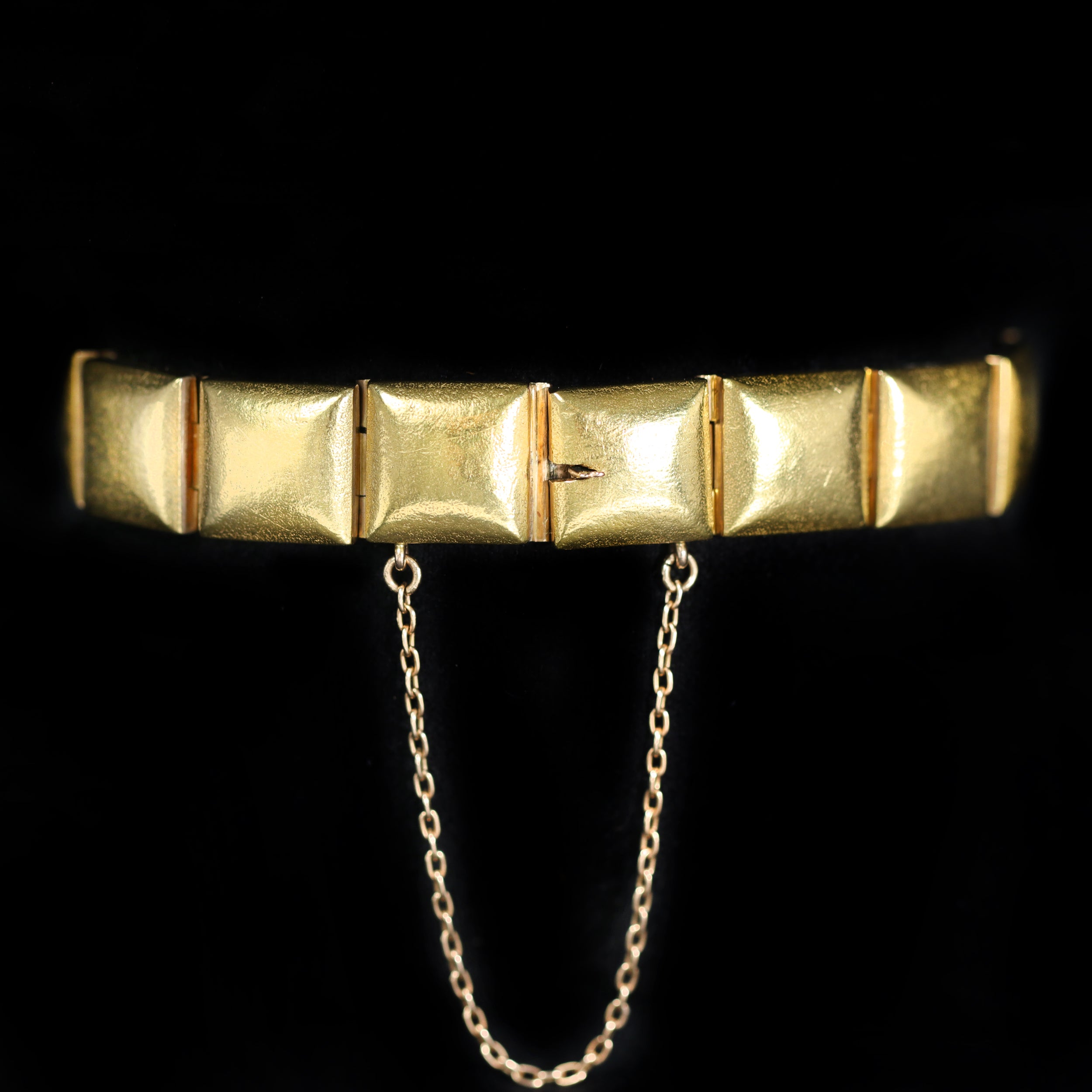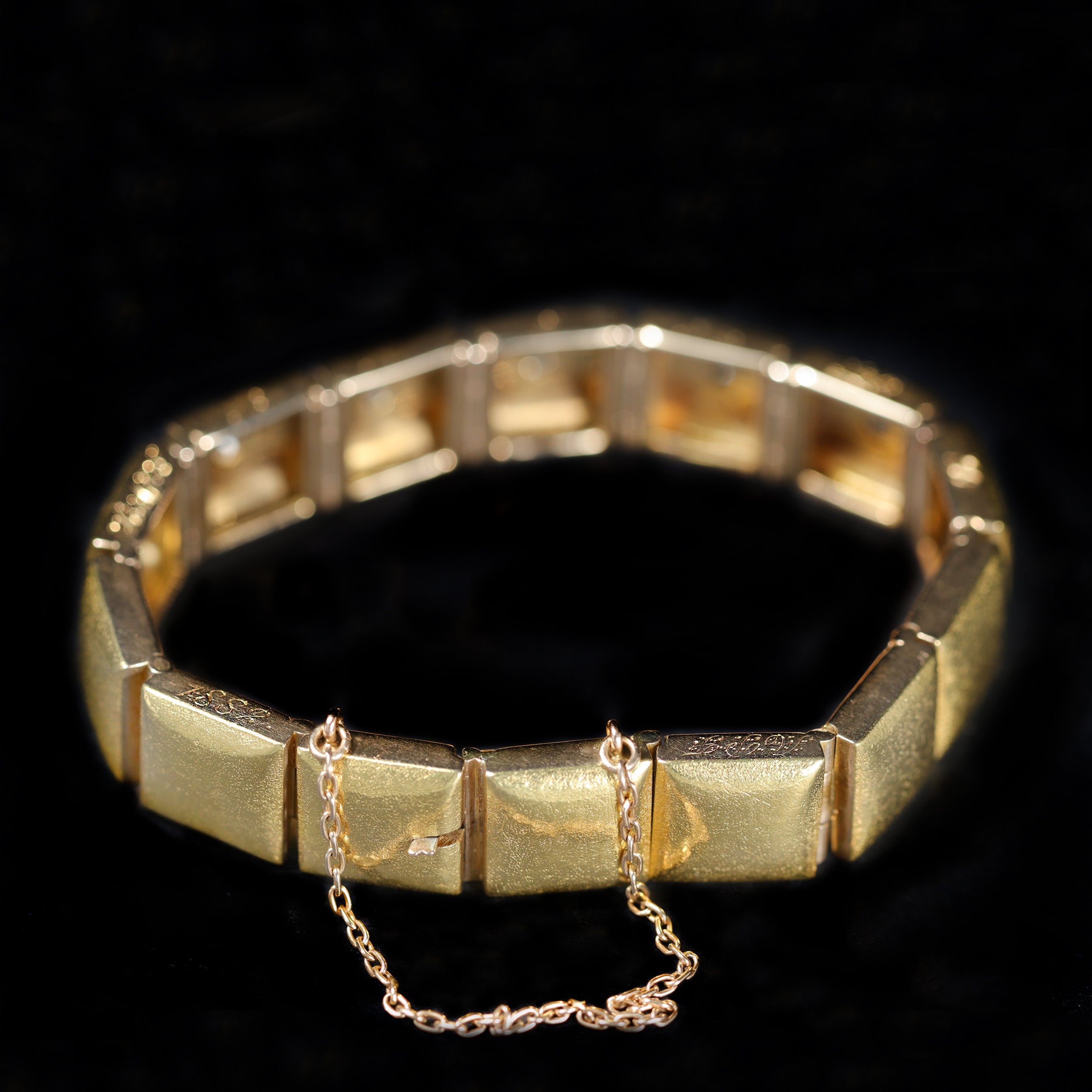 Victorian 18k yellow gold and diamond bracelet. A remarkable piece of sentimental Victorian jewelry, this circa 1882 bracelet is crafted in richly burnished 18k yellow gold with square-shaped links set with six Old Mine cut diamonds. Along one side of the bracelet, hand engraving reads: “L.A.F B A E M L D A.P.F. 1882.” We believe this to represent the mother’s initials, followed by the initials of her children, and finally the father—a cherished family record in gold and diamonds. While steeped in history, its classic links lend it a versatile style that pairs seamlessly with any modern bracelet stack. A later-added gold-filled safety chain ensures security while wearing.