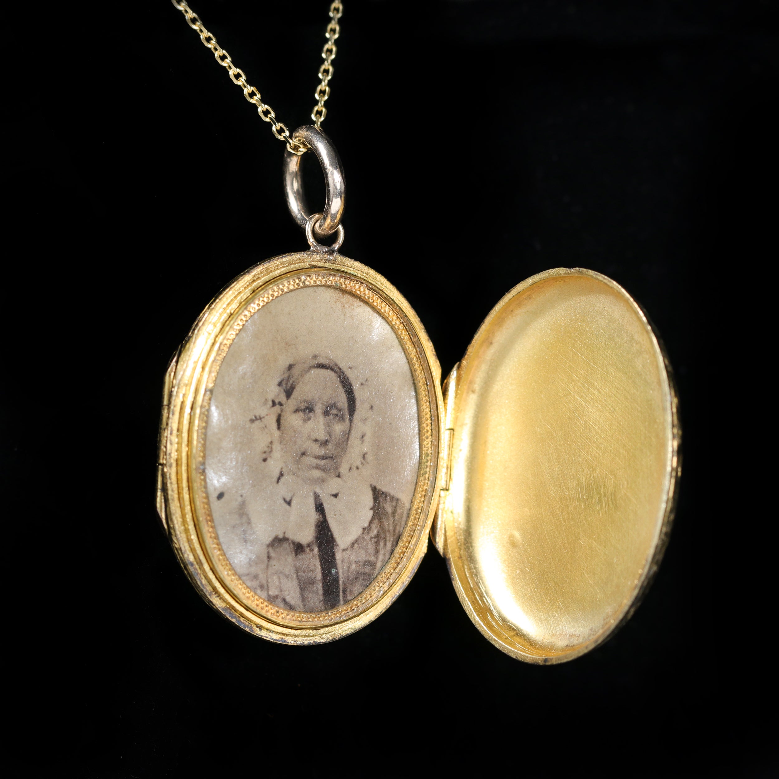 Victorian 18K yellow gold locket. This beautiful Victorian locket is crafted in rich 18K yellow gold and features intricate hand-engraved decoration across both sides. The oval form is framed by elegant scrolling motifs and delicate textural details that catch the light and give the piece wonderful depth. The locket opens to reveal two compartments designed to hold cherished photographs or small keepsakes. Inside are antique portraits, offering a wonderful glimpse into the personal history these sentimental pieces once carried. With its ornate engraving and classic Victorian design, this double-sided locket is both a striking piece of jewelry and a meaningful heirloom meant to hold memories close.