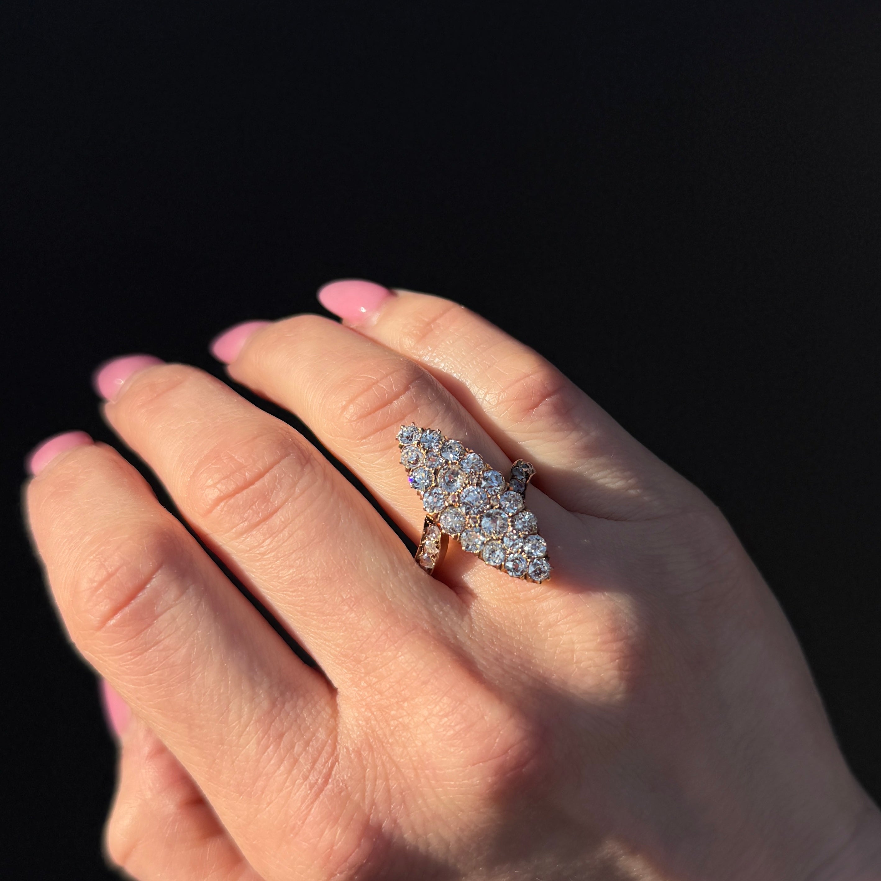 Victorian 18K yellow gold and diamond ring. An elongated navette silhouette gives this Victorian ring its dramatic, finger-lengthening shape, set with 21 Old Mine cut diamonds and 14 rose-cut diamonds totaling approximately 3.00 carats. The Old Mine cuts provide soft, romantic brilliance, while the rose cuts add a gentle shimmer that feels distinctly antique. Bold yet graceful, this is a striking example of Victorian design at its most expressive.